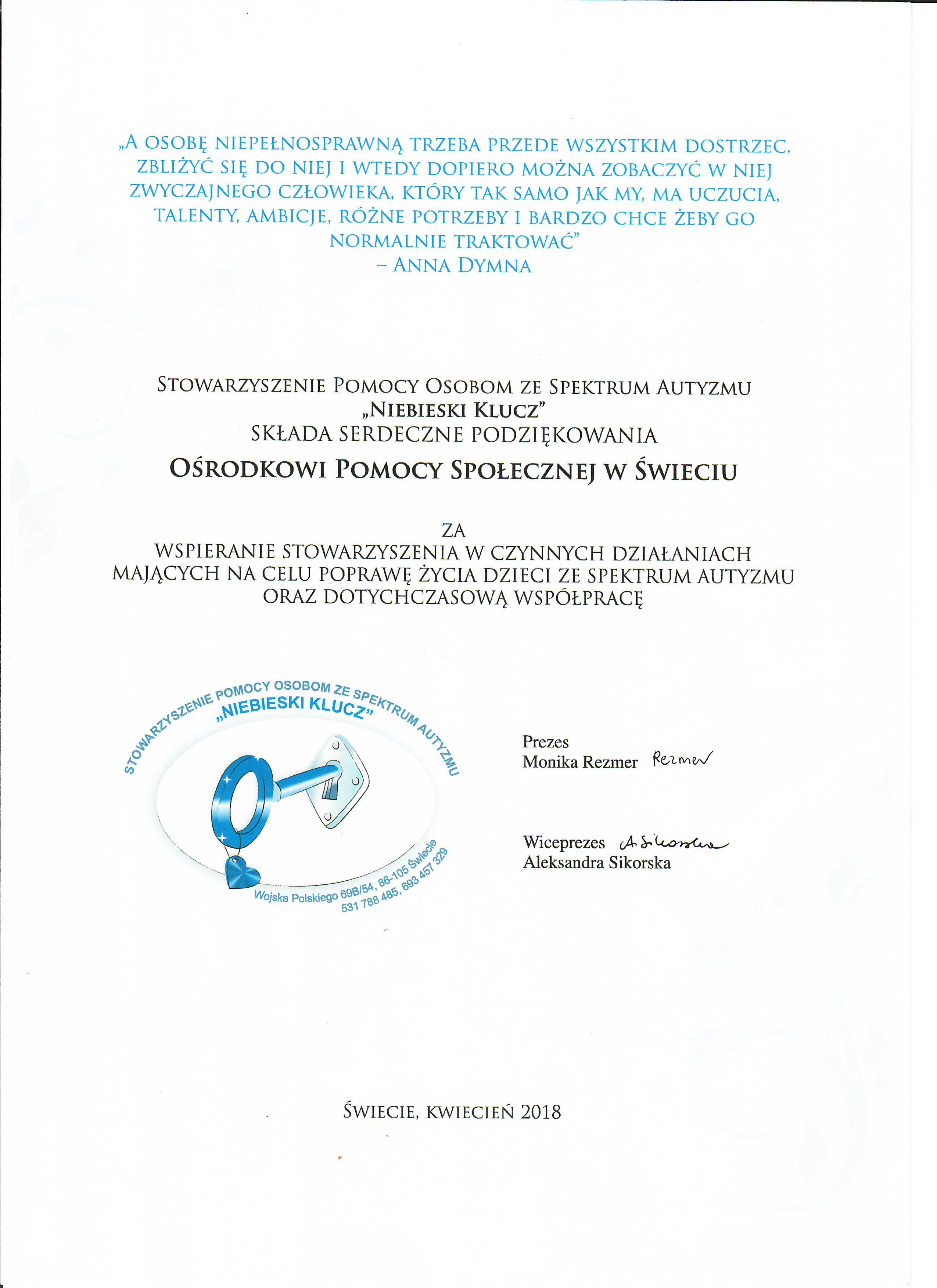 ... a dla Ośrodka Pomocy Społecznej w Świeciu- PODZIĘKOWANIA! (2018-04-23)