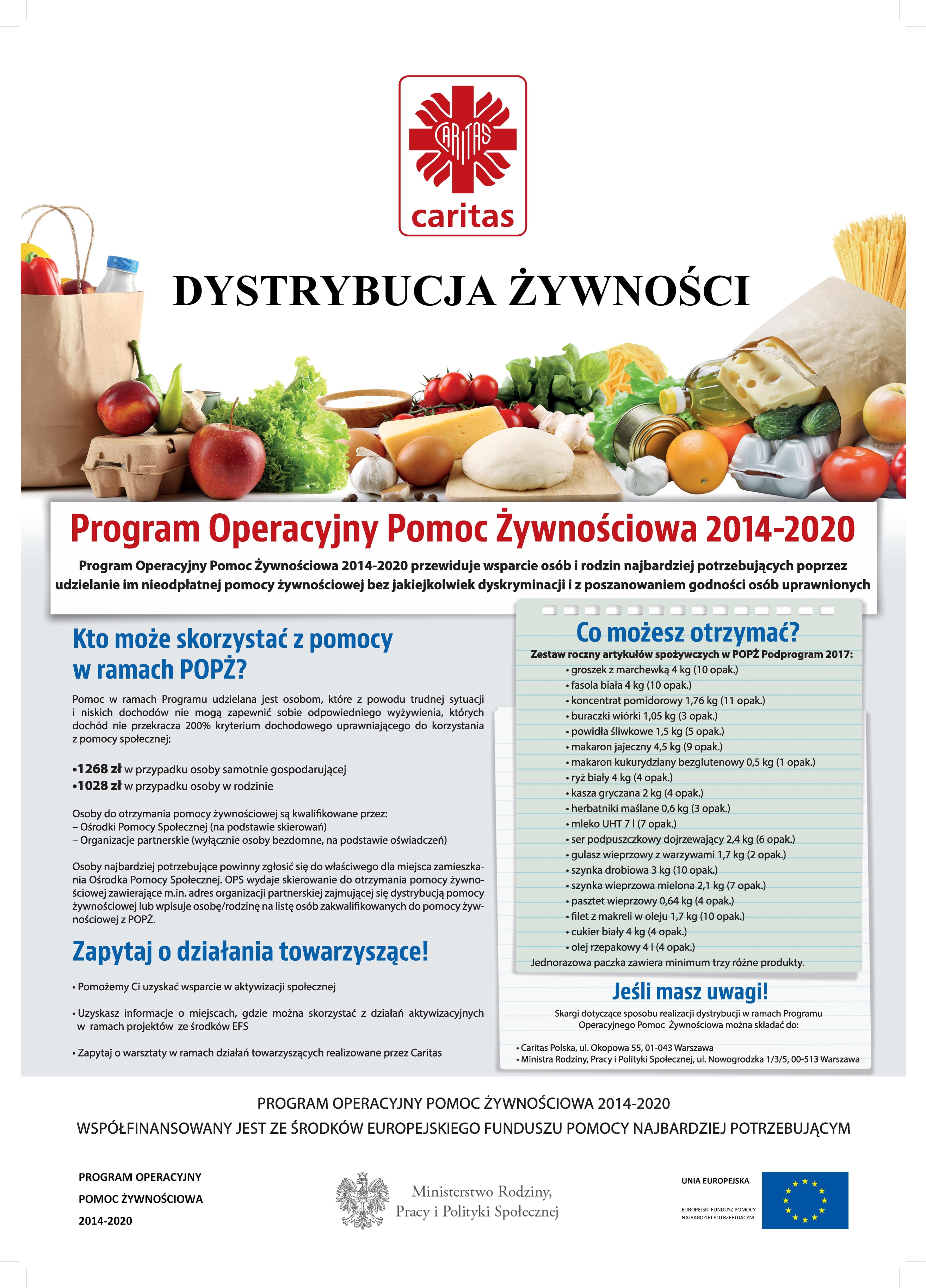 Ruszamy z wydawaniem żywności... (2018-02-26) Od dnia 27 lutego do dnia 9 marca 2018 roku Ośrodek Pomocy Społecznej w Świeciu będzie zajmował się bezpłatną dystrybucją żywności w porozumieniu z Caritas Diecezji Bydgoskiej. Do rozdysponowania jest około 15 ton. Zadanie to należy do zadań organizacji pozarządowych jednakże żadna z organizacji wyznaczona przez Ministerstwo Rodziny, Pracy i Polityki Społecznej nie podjęła się dystrybucji w ramach Programu Operacyjnego Pomoc Żywnościowa 2014-2020 współfinansowanego z Europejskiego Funduszu Pomocy Najbardziej Potrzebującym na terenie gminy Świecie. Żywność wydawana jest osobom ze skierowaniem od pracownika socjalnego po spełnieniu kryteriów zawartych w rozporządzeniu Rady Ministrów z dnia 14 lipca 2015 roku w sprawie zweryfikowanych kryteriów dochodowych oraz kwot świadczeń pieniężnych z pomocy społecznej (Dz.U.2015.1058). Program Operacyjny Pomoc Żywnościowa 2014 – 2020 przewiduje wsparcie osób i rodzin najbardziej potrzebujących poprzez udzielenie im nieodpłatnej pomocy żywnościowej bez jakiejkolwiek dyskryminacji i z poszanowaniem godności osób uprawnionych. Z powyższej pomocy mogą korzystać osoby samotne i rodziny, których dochody nie mogą przekroczyć poniższych kwot: