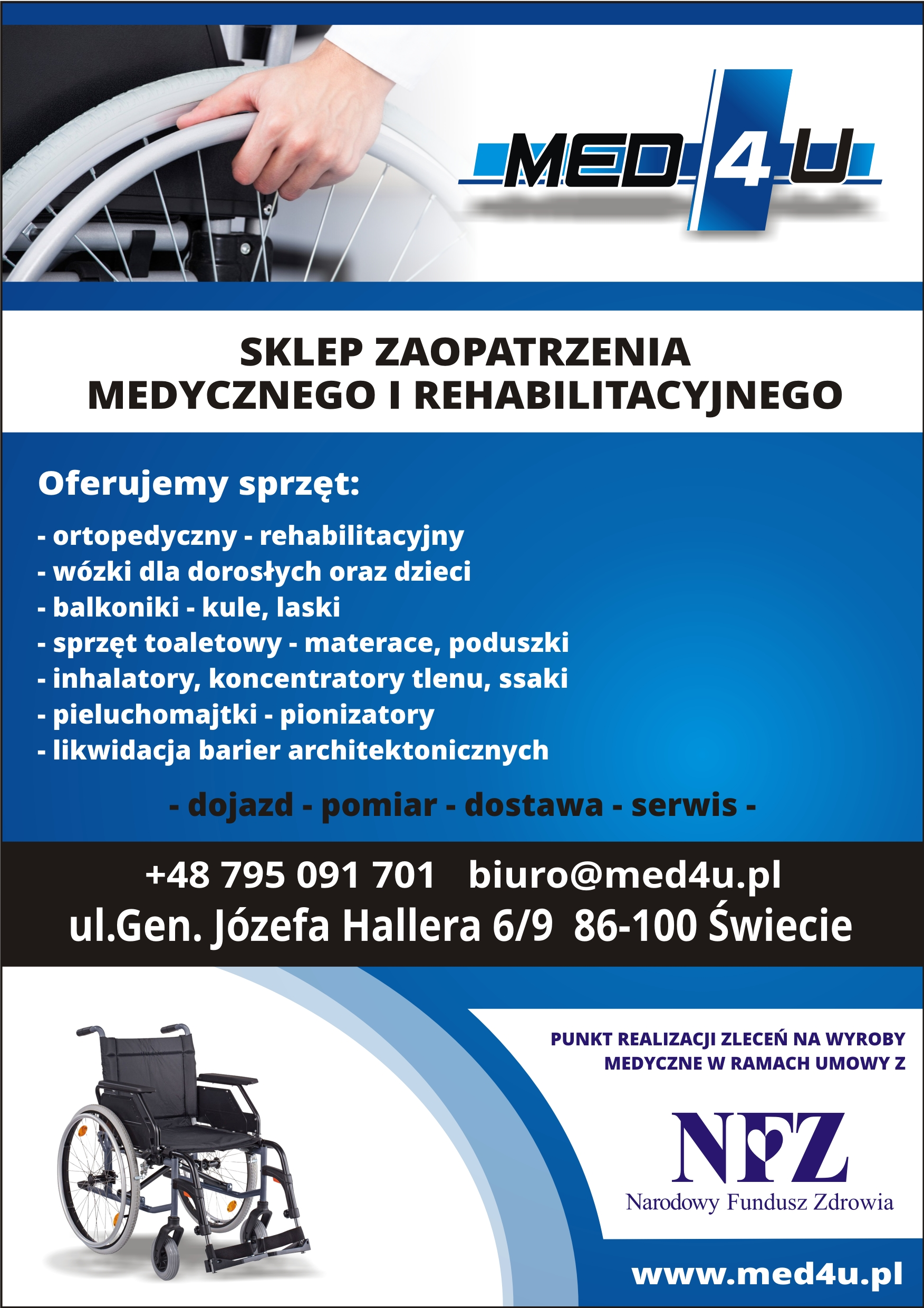 Ośrodek Pomocy Społecznej zachęca do szczegółowego zapoznania się z ofertą i odwiedzenia placówki Sklepu Zaopatrzenia Medycznego i Rehabilitacyjnego MED4U przy ul. Hallera 6/9 w Świeciu.