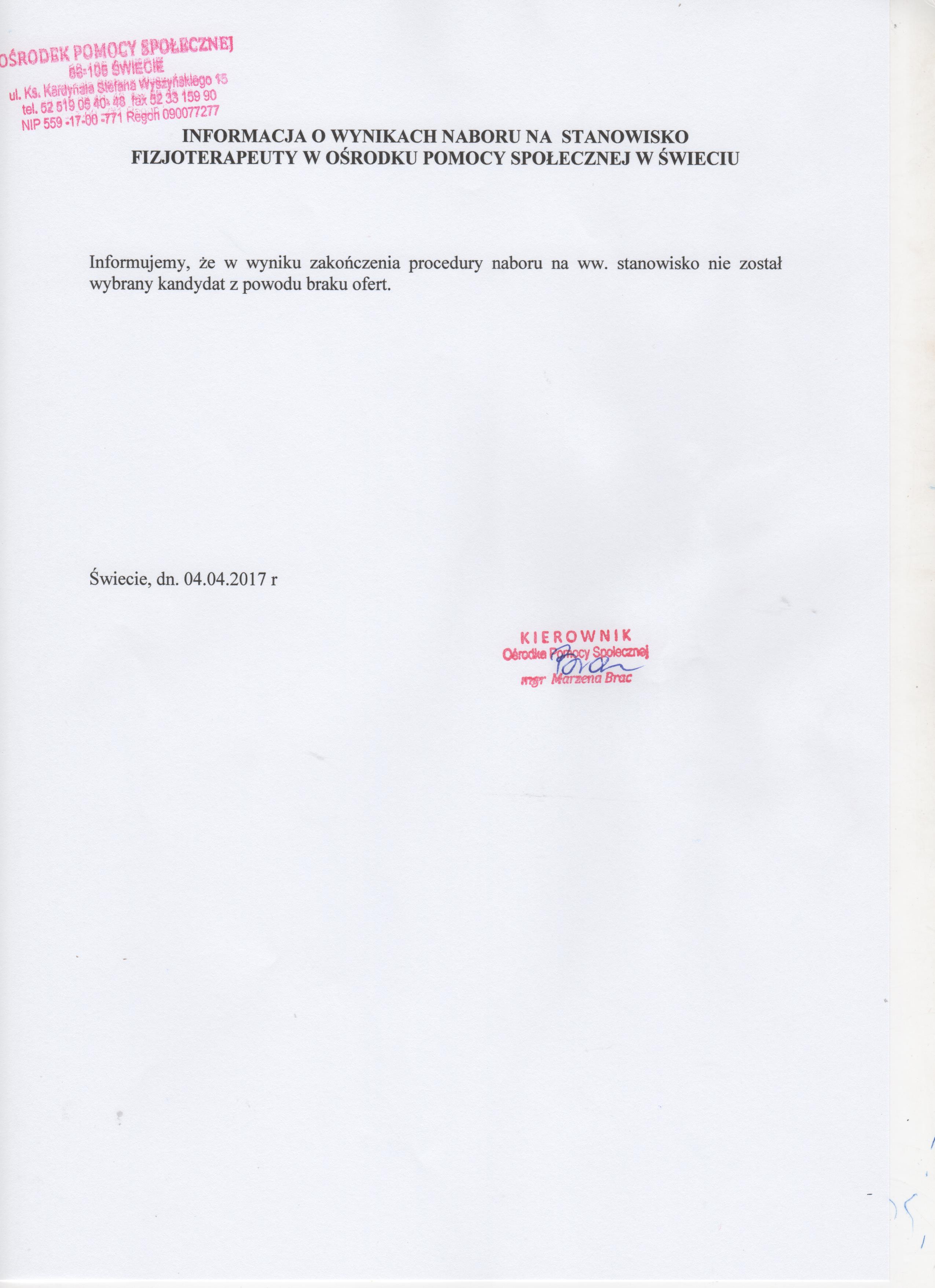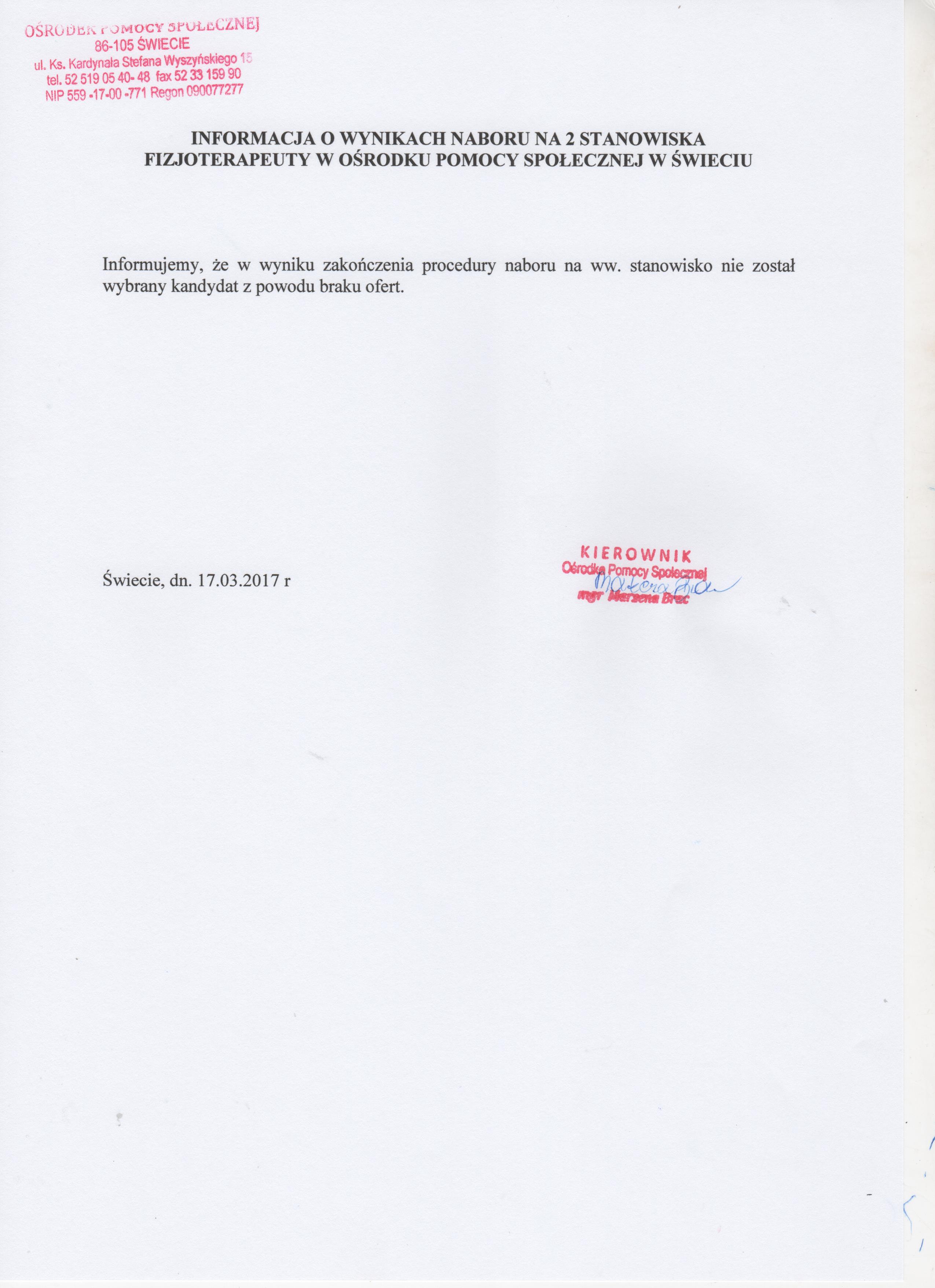 Informacja o wynikach naboru na 2 stanowiska Fizjoterapeuty na umowę - zlecenie w Ośrodku Pomocy Społecznej w Świeciu
