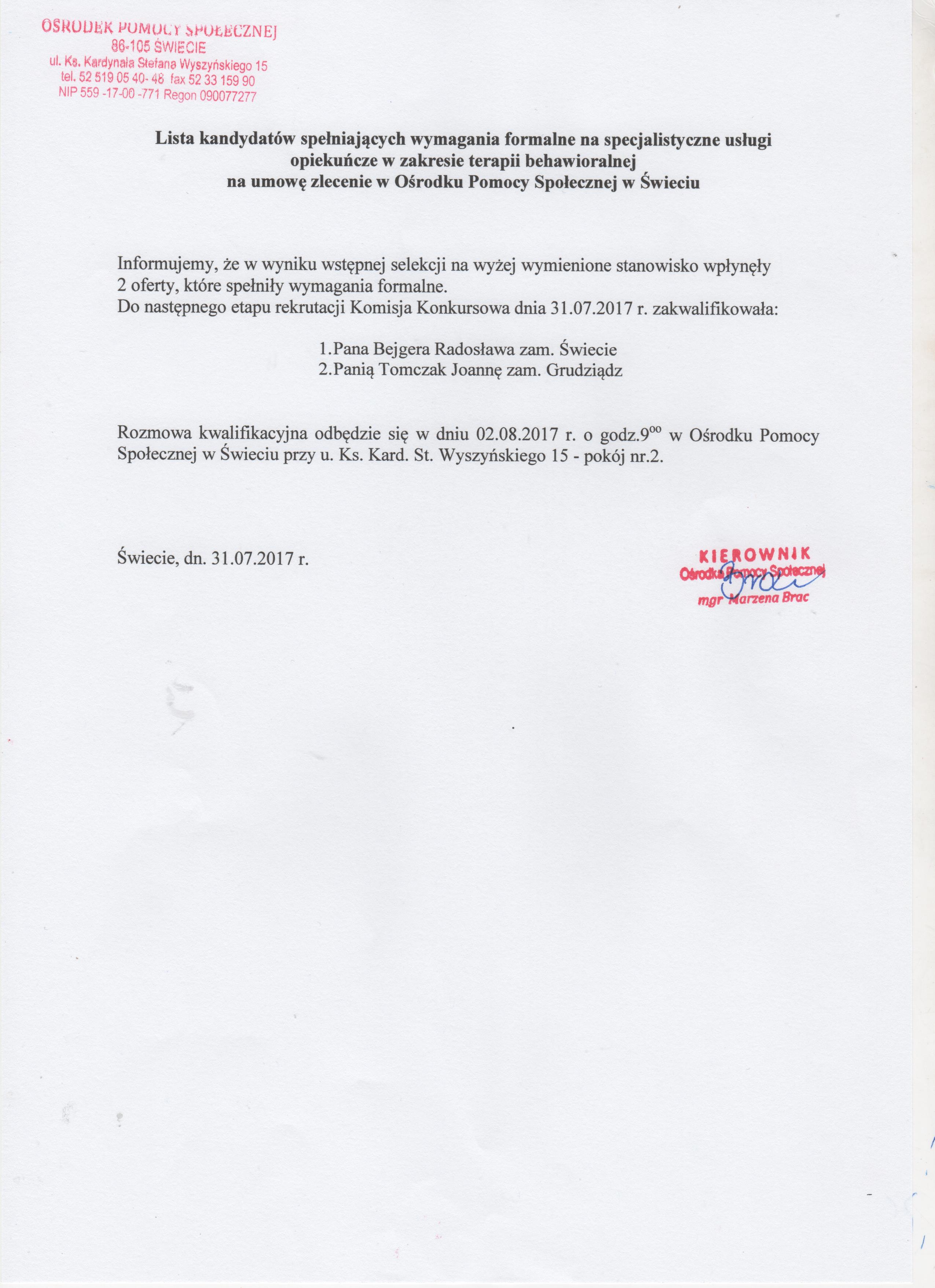 Lista kandydatów spełniających wszystkie wymagania formalne na stanowisko terapeuty behawioralnego na umowę - zlecenie w Ośrodku Pomocy Społecznej w Świeciu.