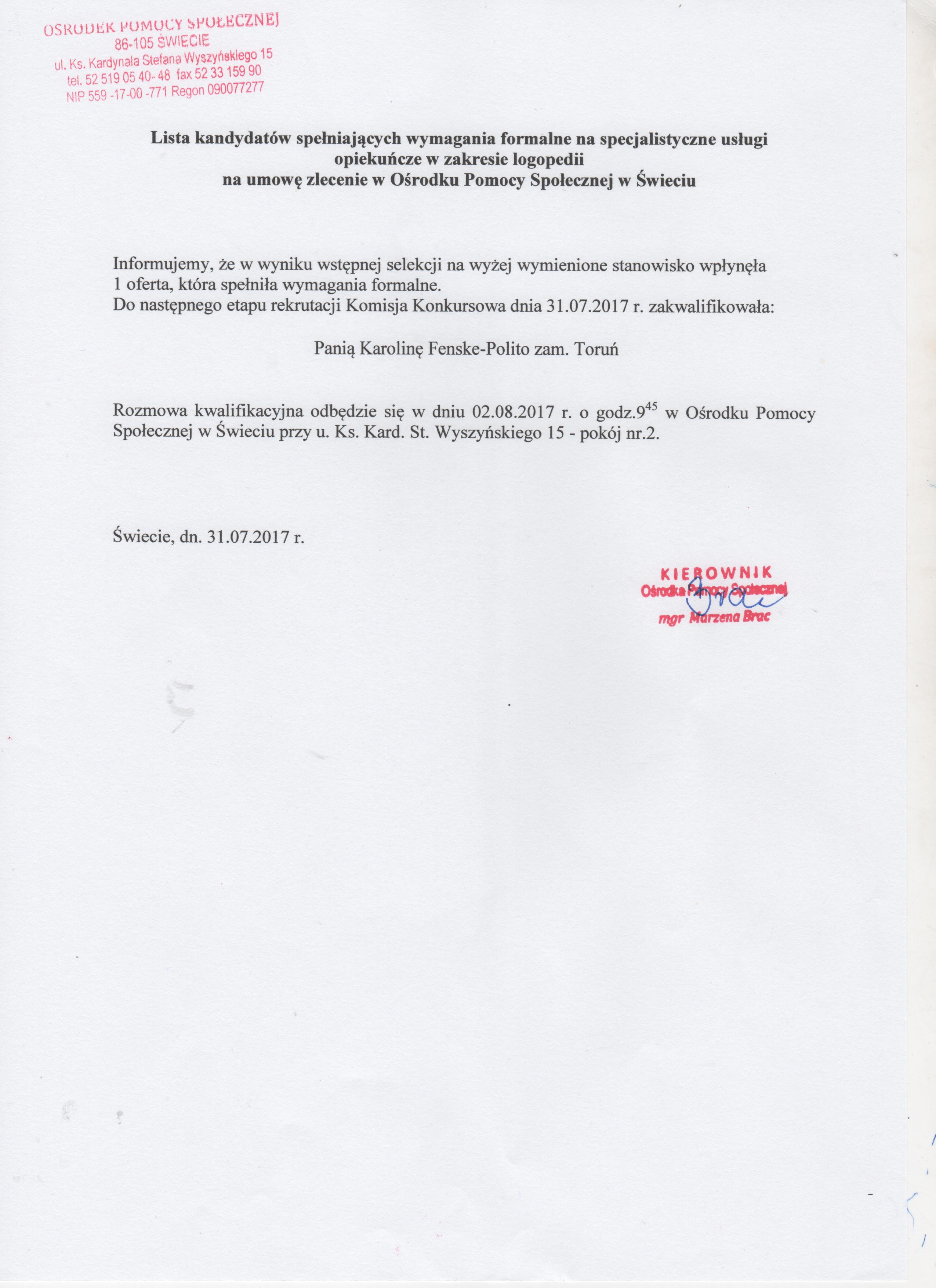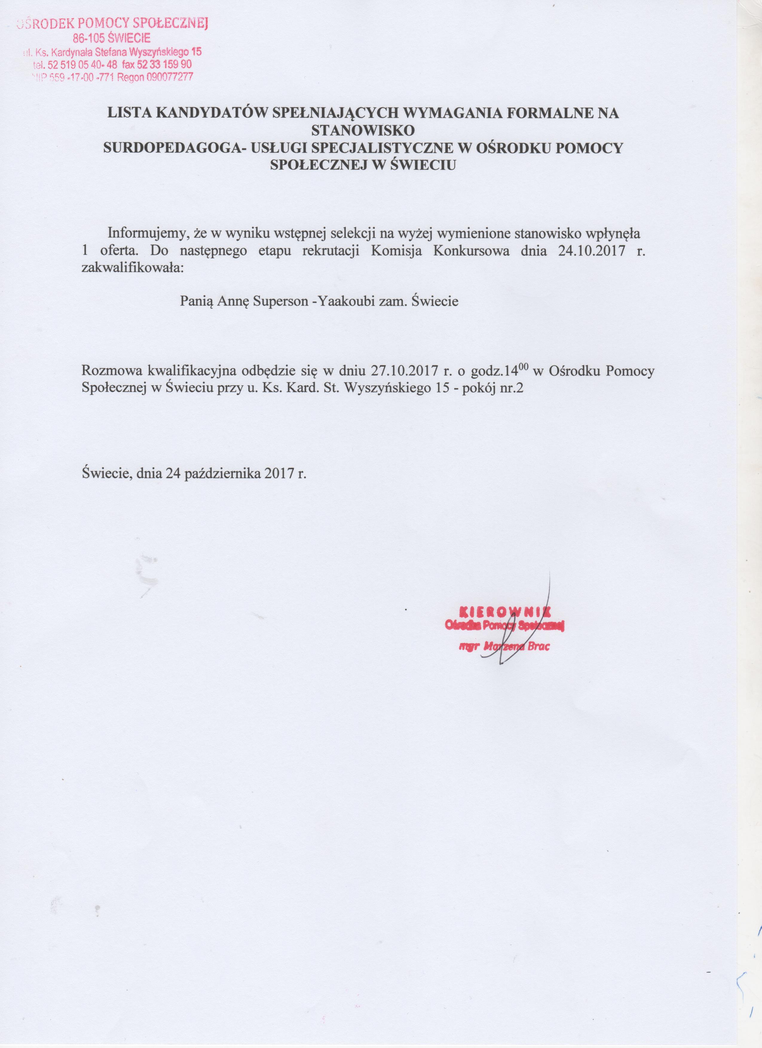 Lista kandydatów spełniających wszystkie wymagania formalne na stanowisko surdopedagoga na umowę - zlecenie w Ośrodku Pomocy Społecznej w Świeciu.