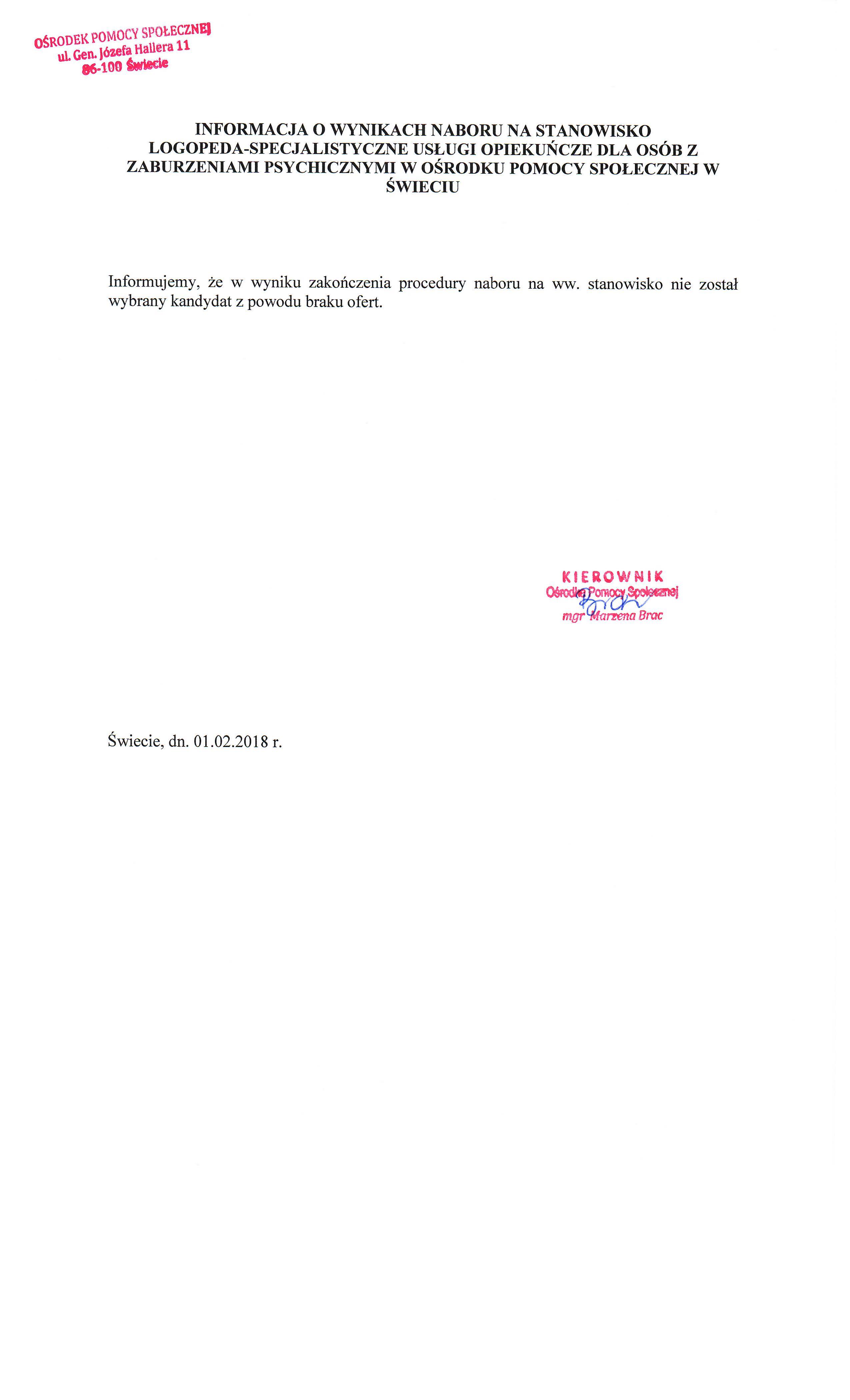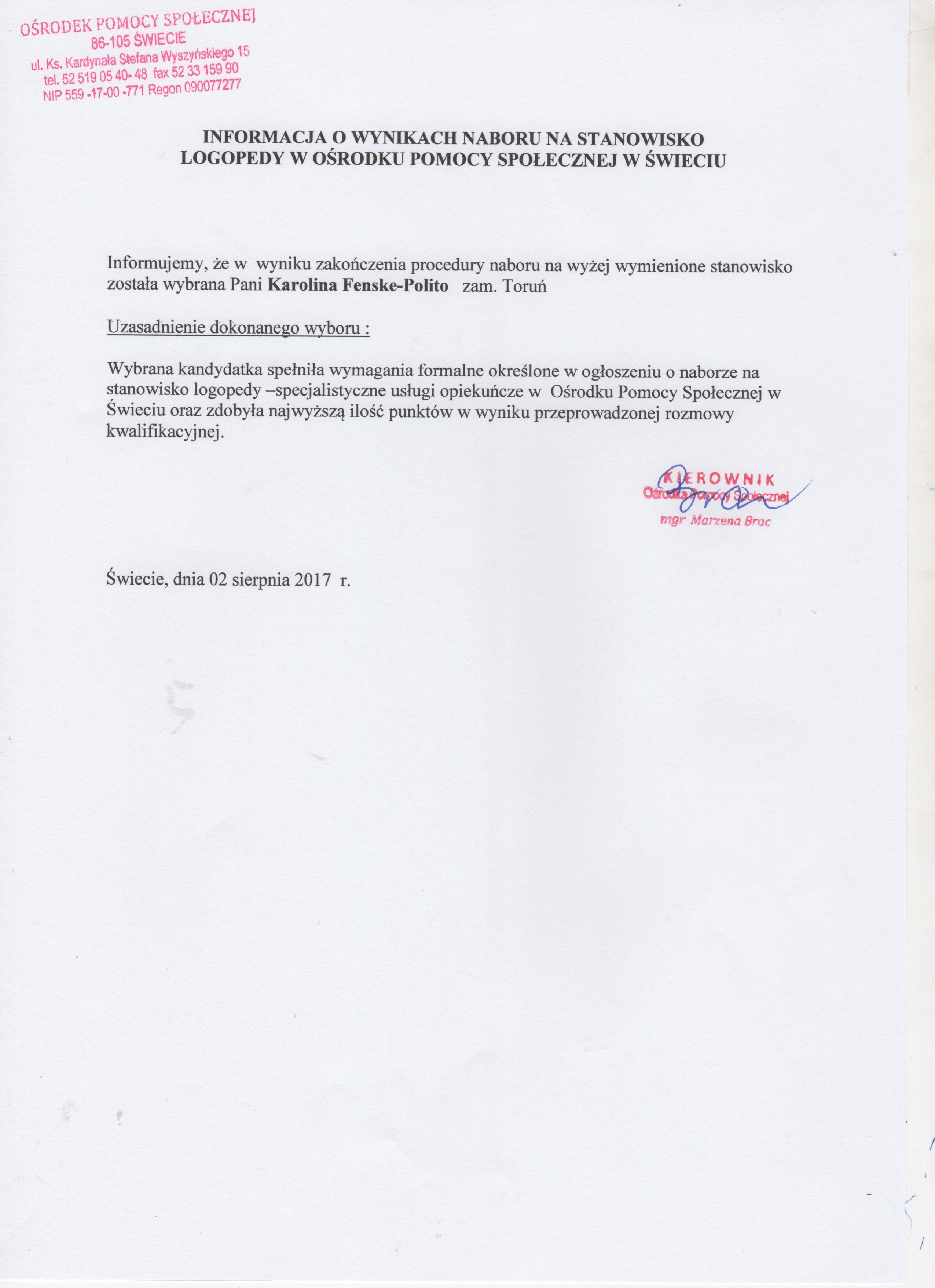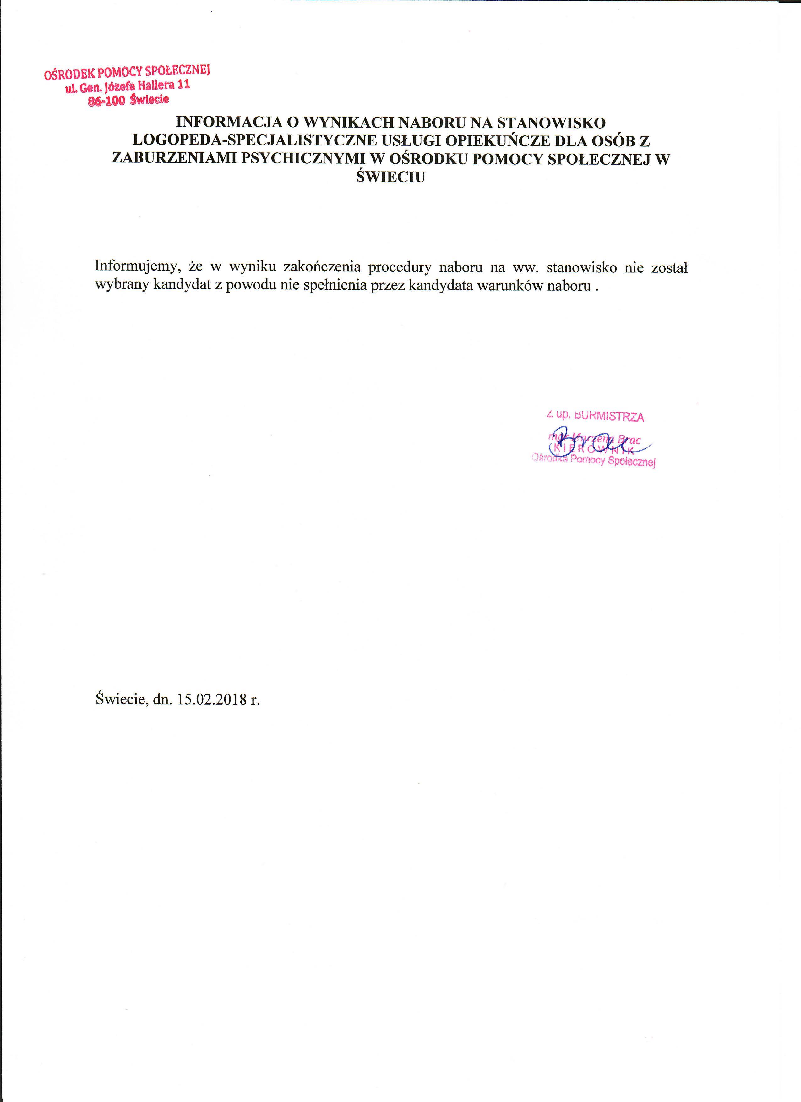 Informacja o wynikach naboru na stanowisko logopedy na umowę - zlecenie w Ośrodku Pomocy Społecznej w Świeciu.