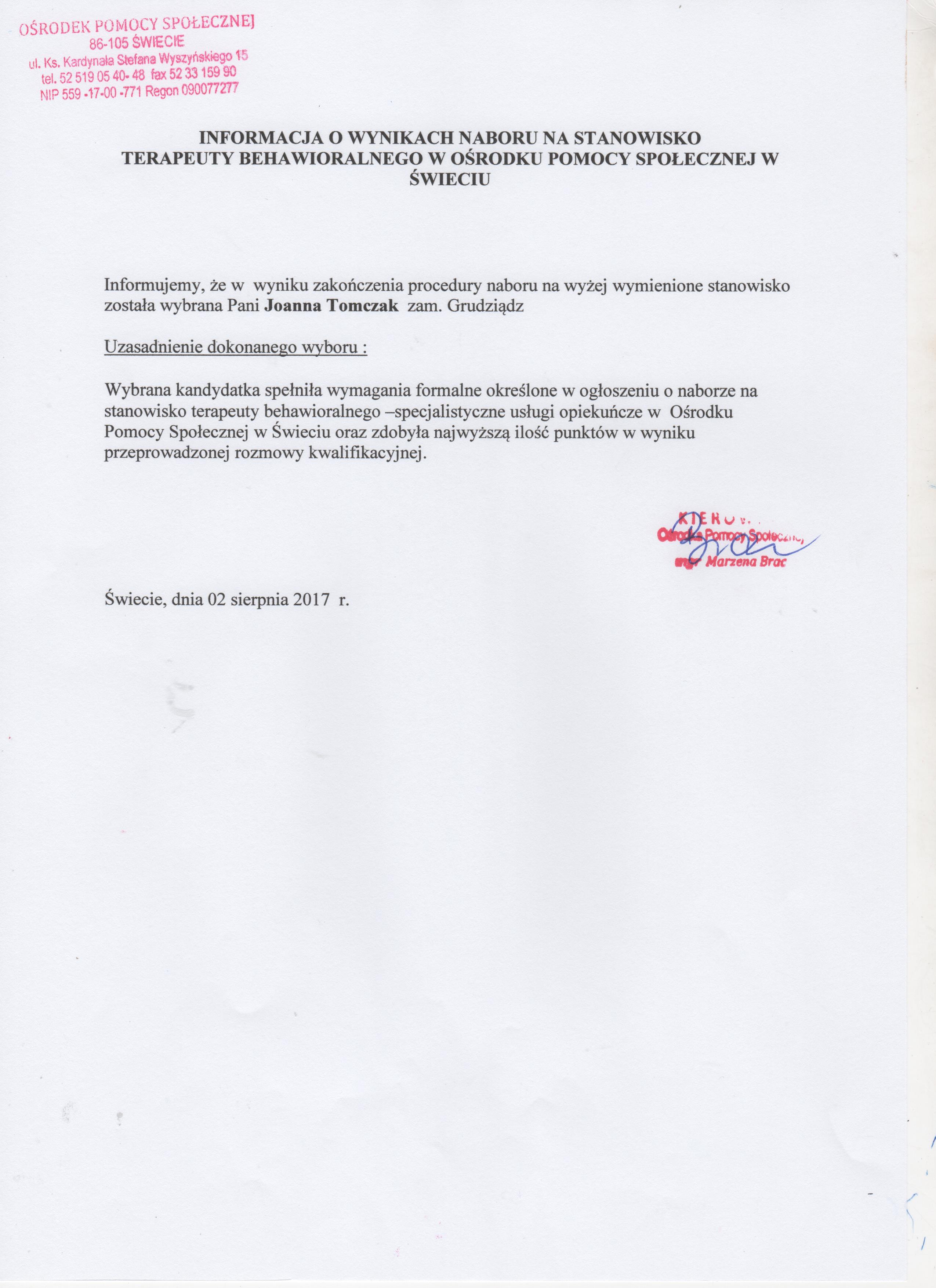 Informacja o wynikach naboru na stanowisko terapeuty behawioralnego na umowę - zlecenie w Ośrodku Pomocy Społecznej w Świeciu.