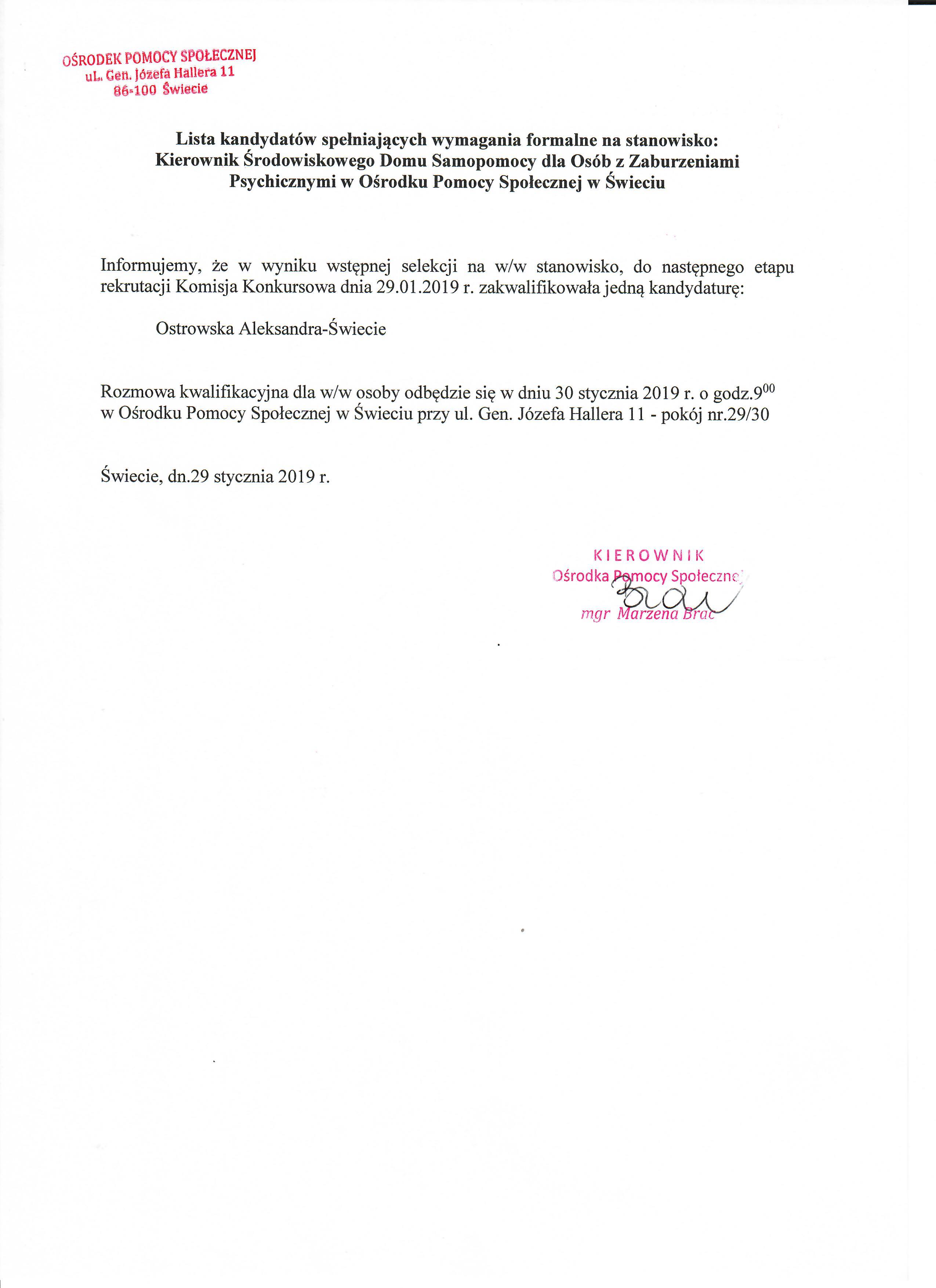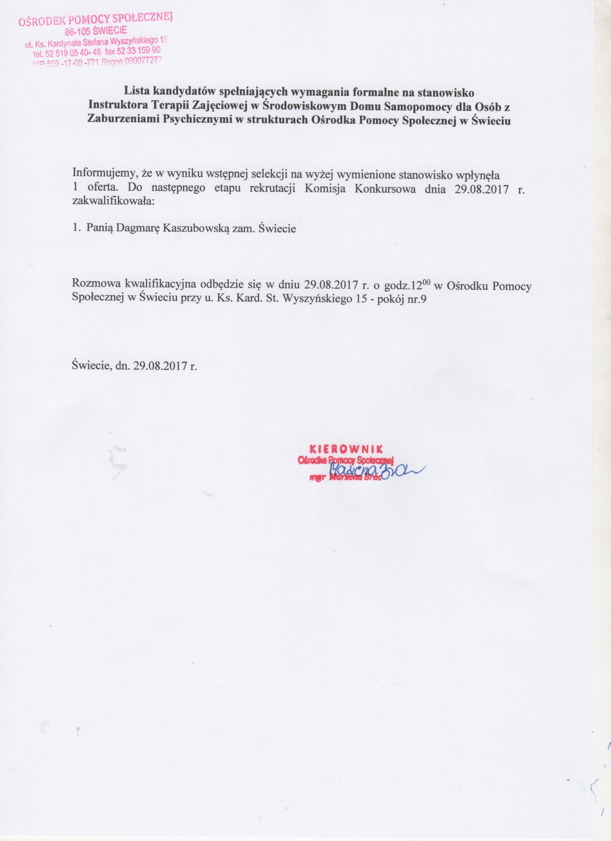 Lista kandydatów spełniających wszystkie wymagania formalne na wolne stanowisko Instruktora Terapii Zajęciowej w Środowiskowym Domu Samopomocy Dla Osób z Zaburzeniami Psychicznymi w Świeciu