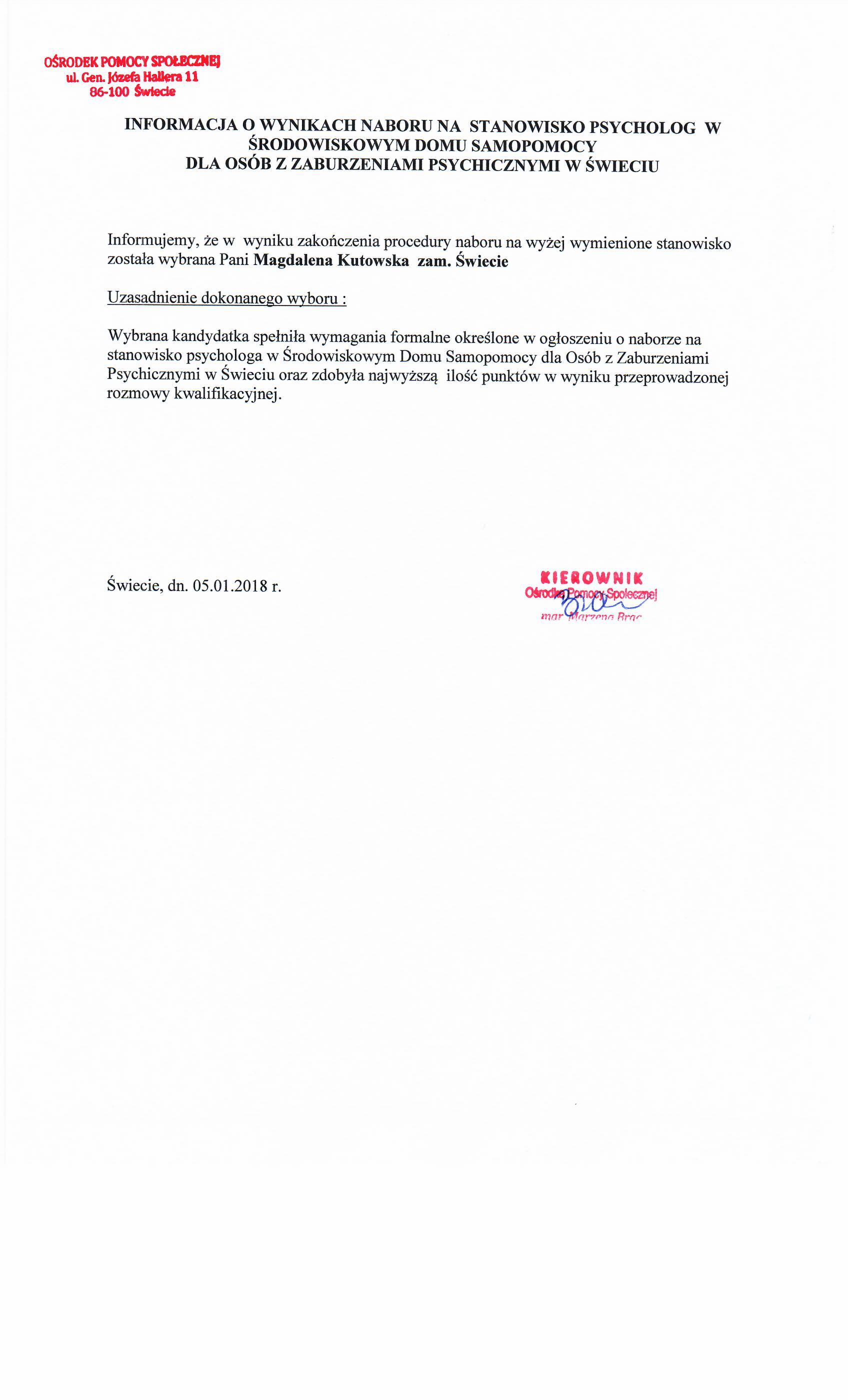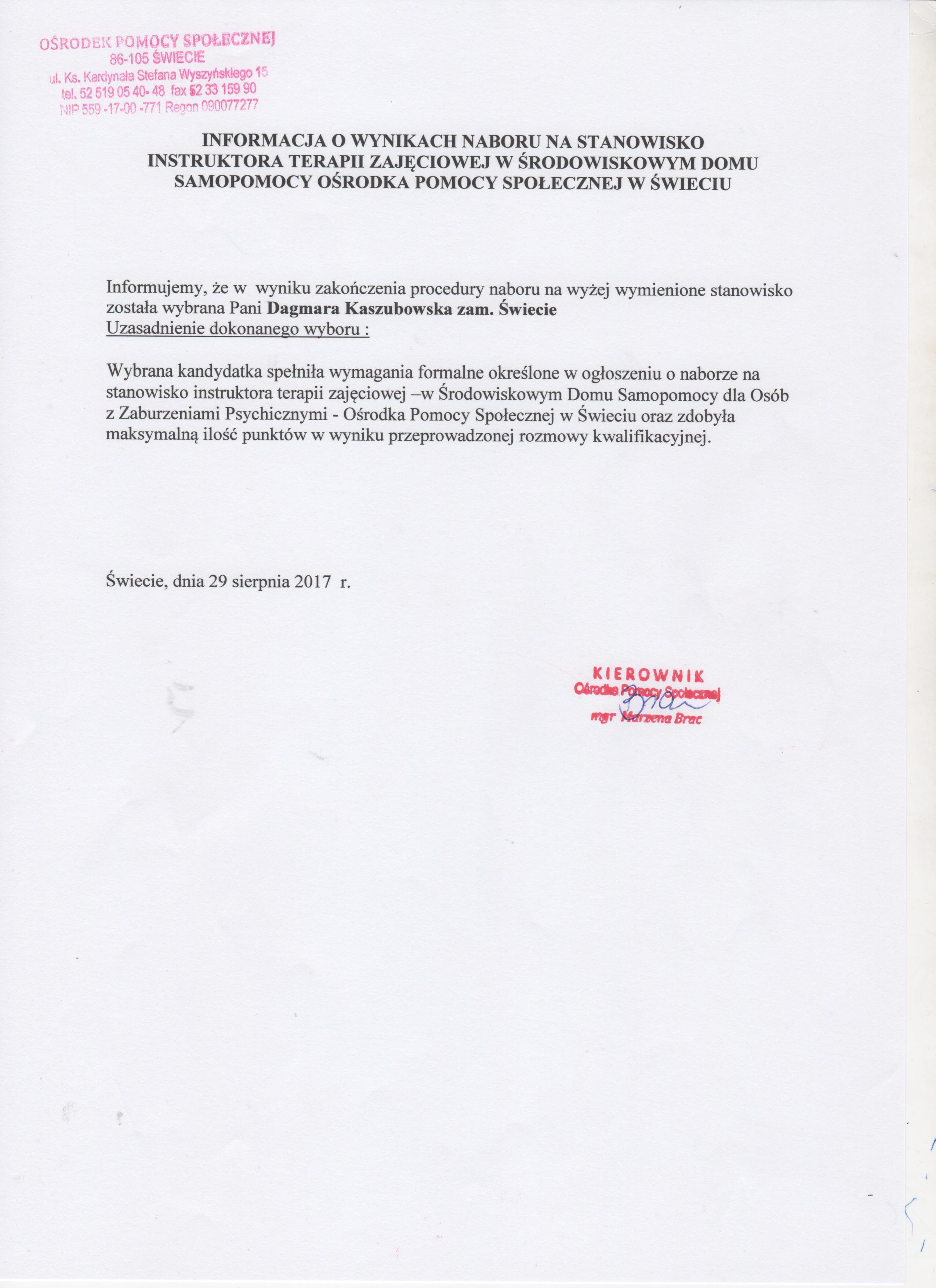 Informacja o wyniku wyboru na stanowisko Kierownika Środowiskowego Domu Samopomocy na umowę o pracę w Ośrodku Pomocy Społecznej w Świeciu
