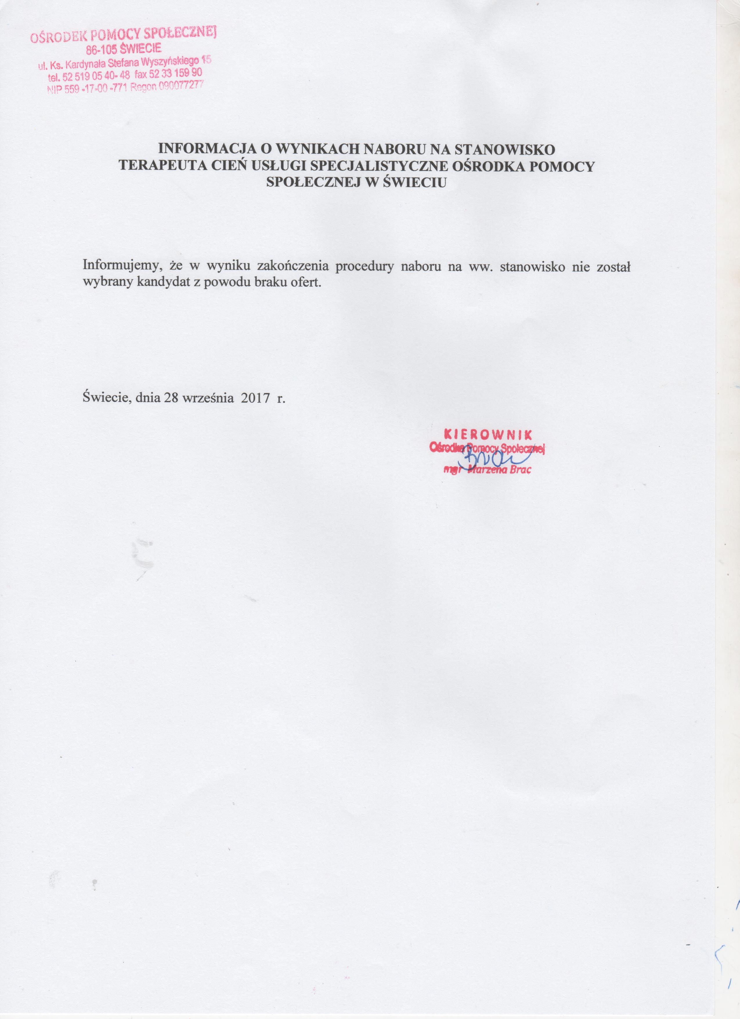 Informacja o wynikach naboru na wolne stanowisko- Terapeuta cień na umowę- zlecenie w Ośrodku Pomocy Społecznej w Świeciu.