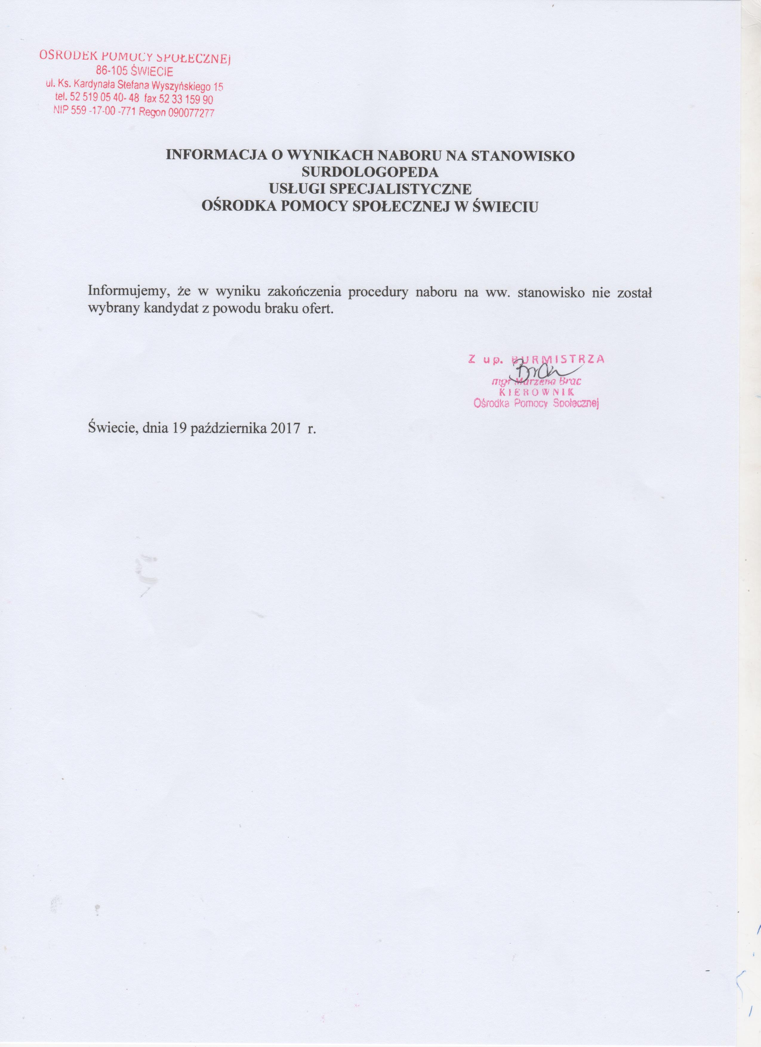 Informacja o wynikach naboru na stanowisko surdologopedy na umowę-zlecenie w Ośrodku Pomocy Społecznej w Świeciu.