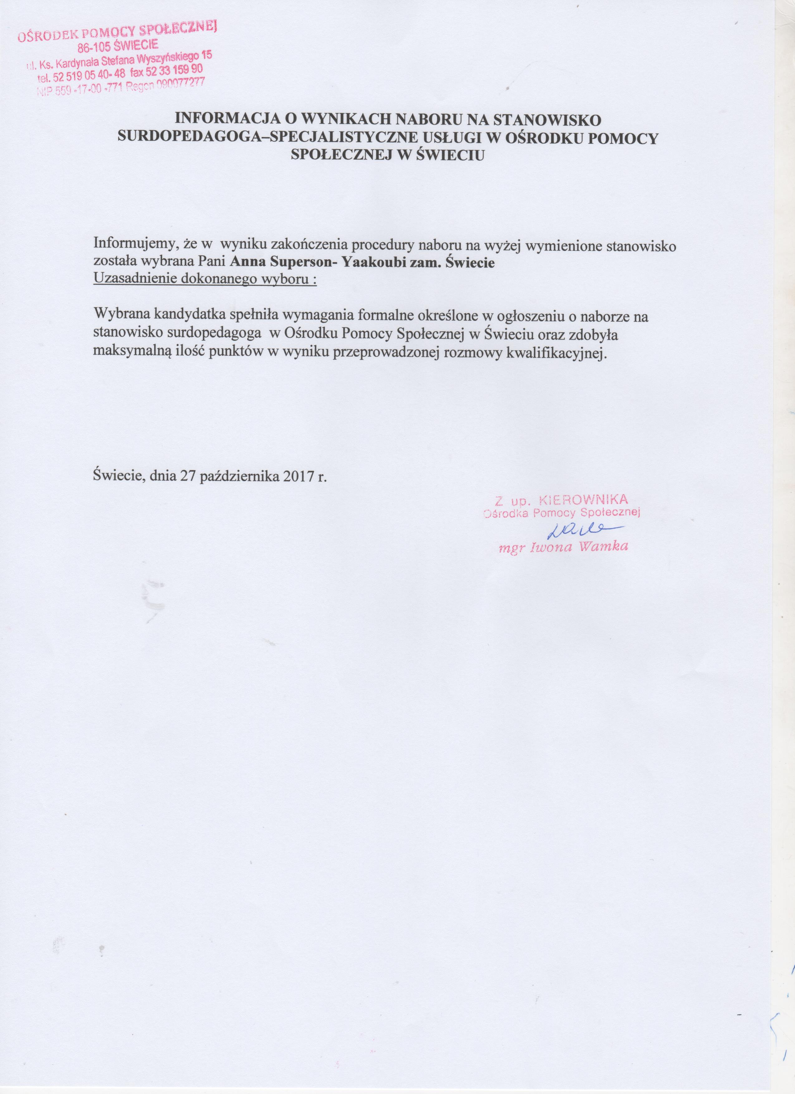 Informacja o wynikach naboru na stanowisko surdopedagoga na umowę-zlecenie w Ośrodku Pomocy Społecznej w Świeciu.