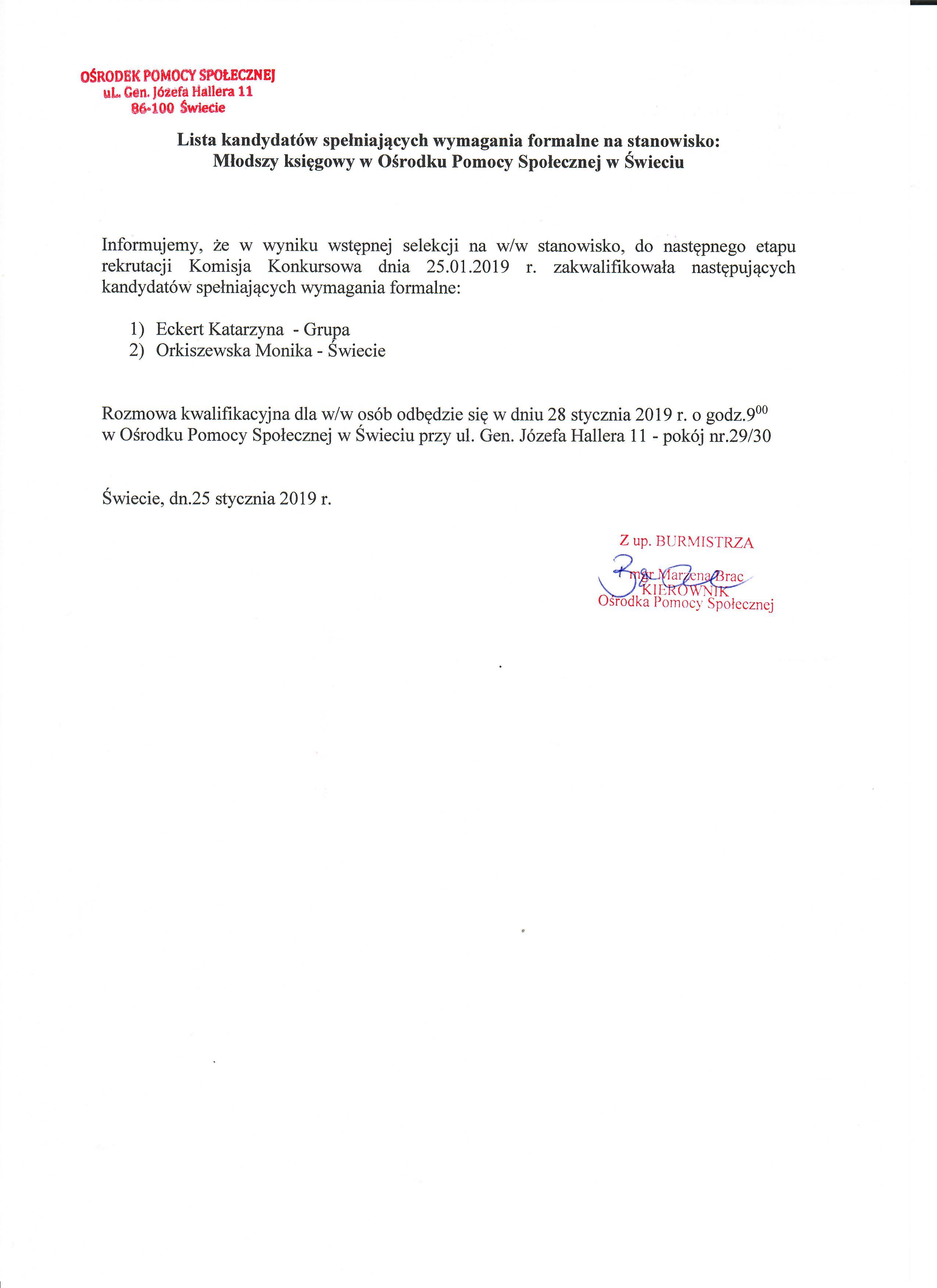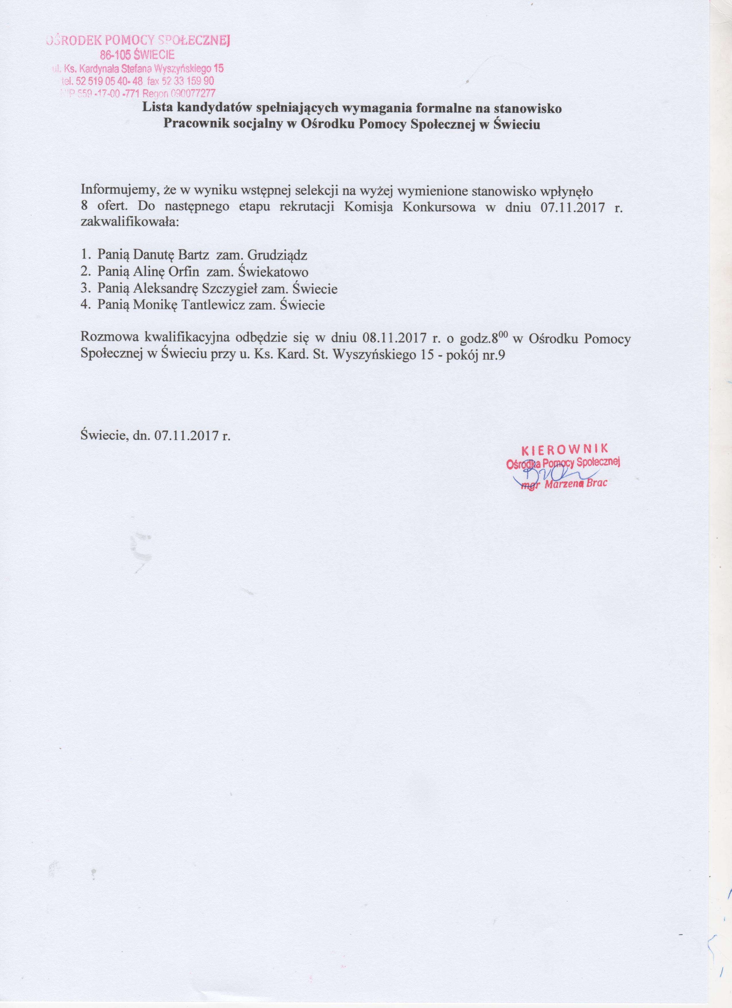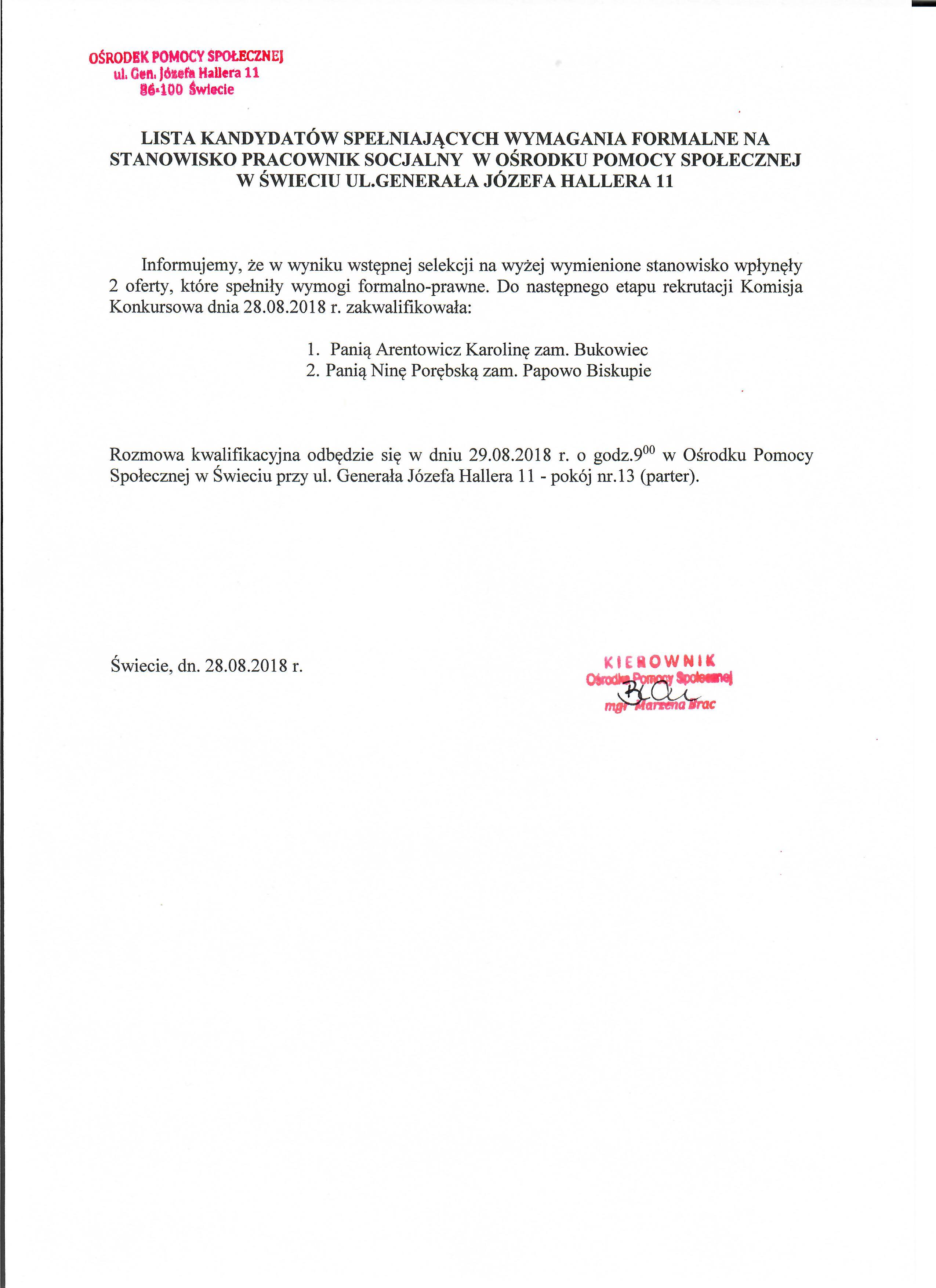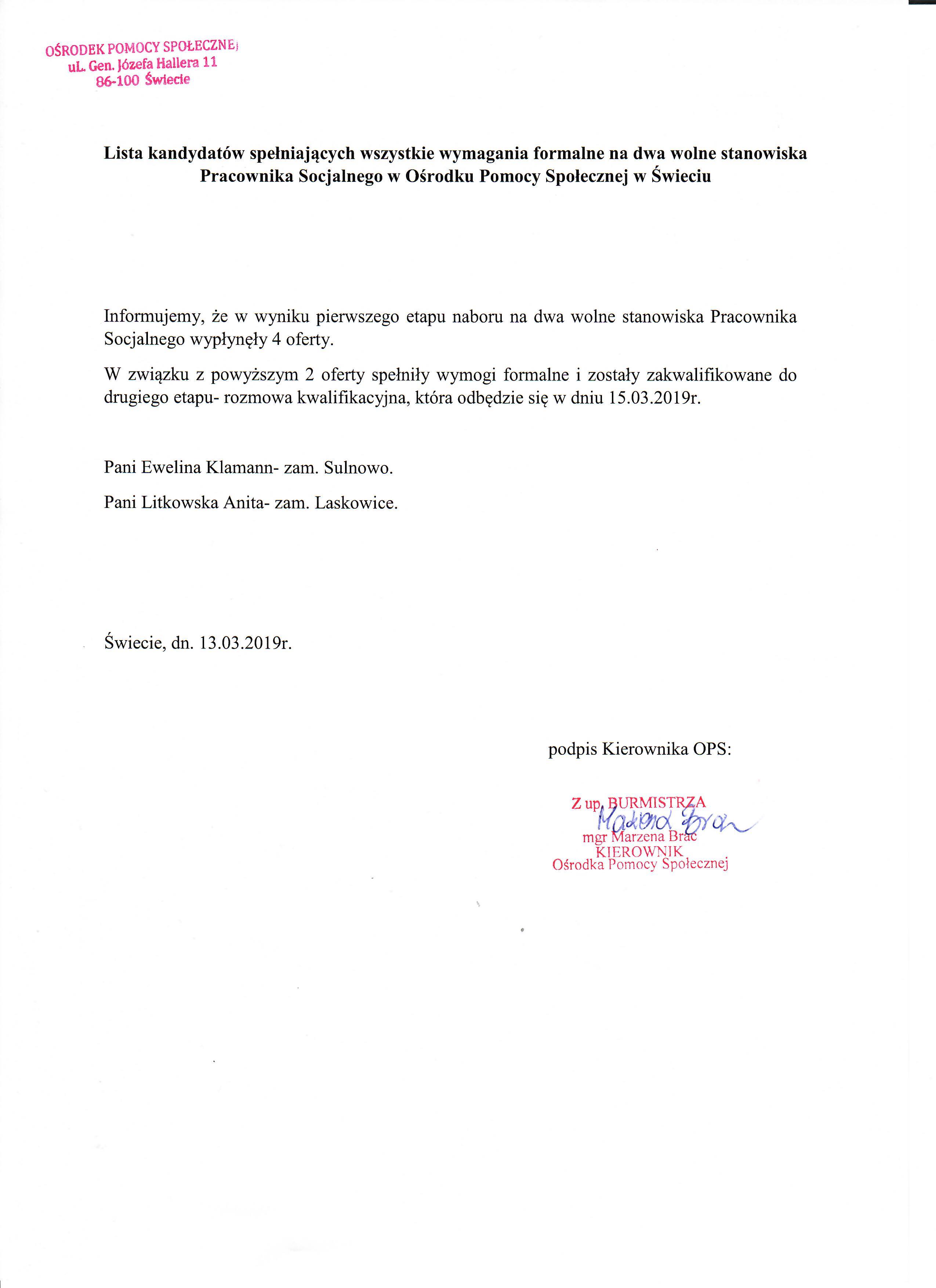 Lista kandydatów spełniających wszystkie wymagania formalne na stanowisko pracownika socjalnego w Ośrodku Pomocy Społecznej w Świeciu.