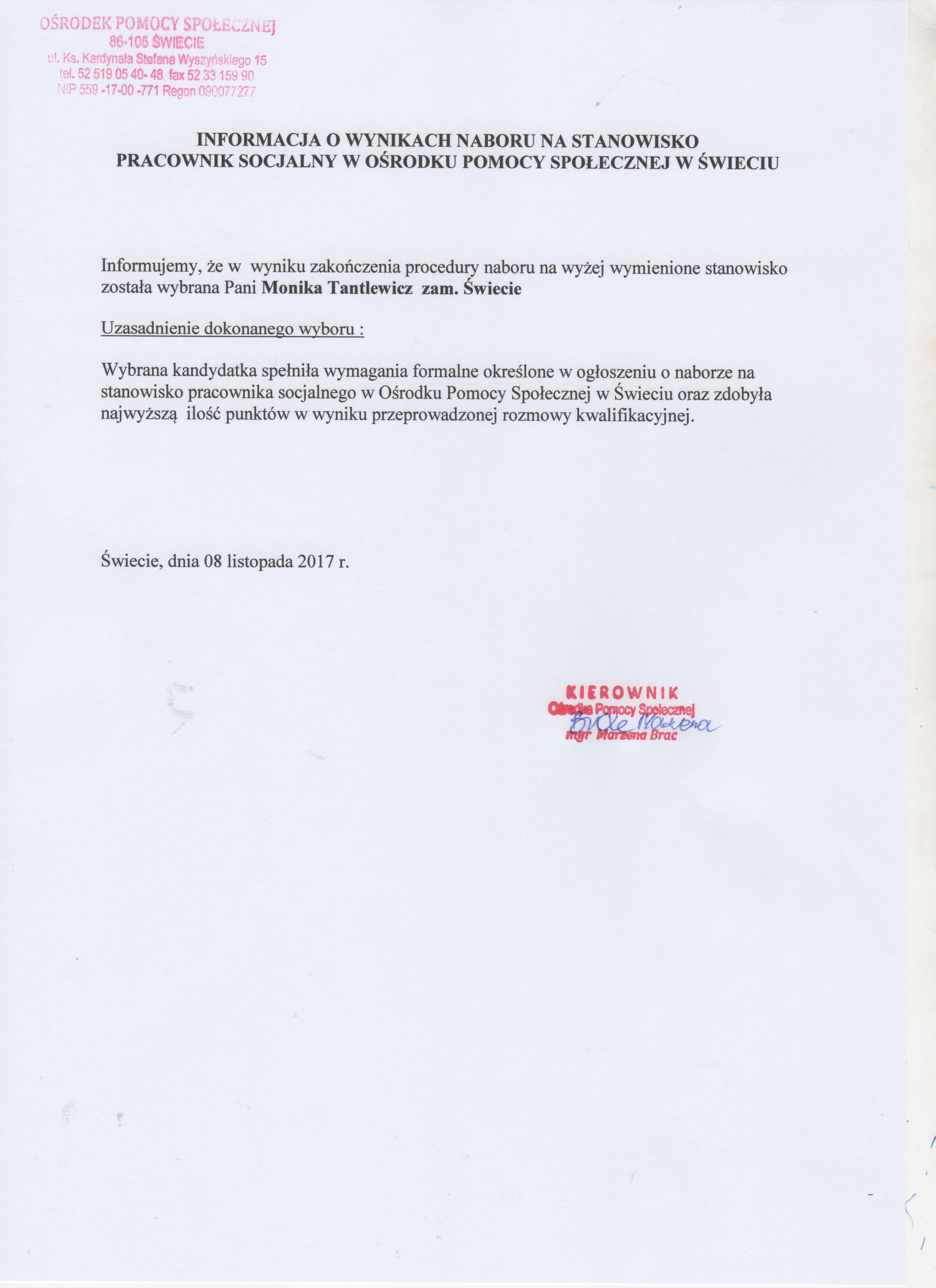 Informacja o wynikach naboru na dwa stanowiska Pracownika Socjalnego na umowę o pracę w Ośrodku Pomocy Społecznej w Świeciu