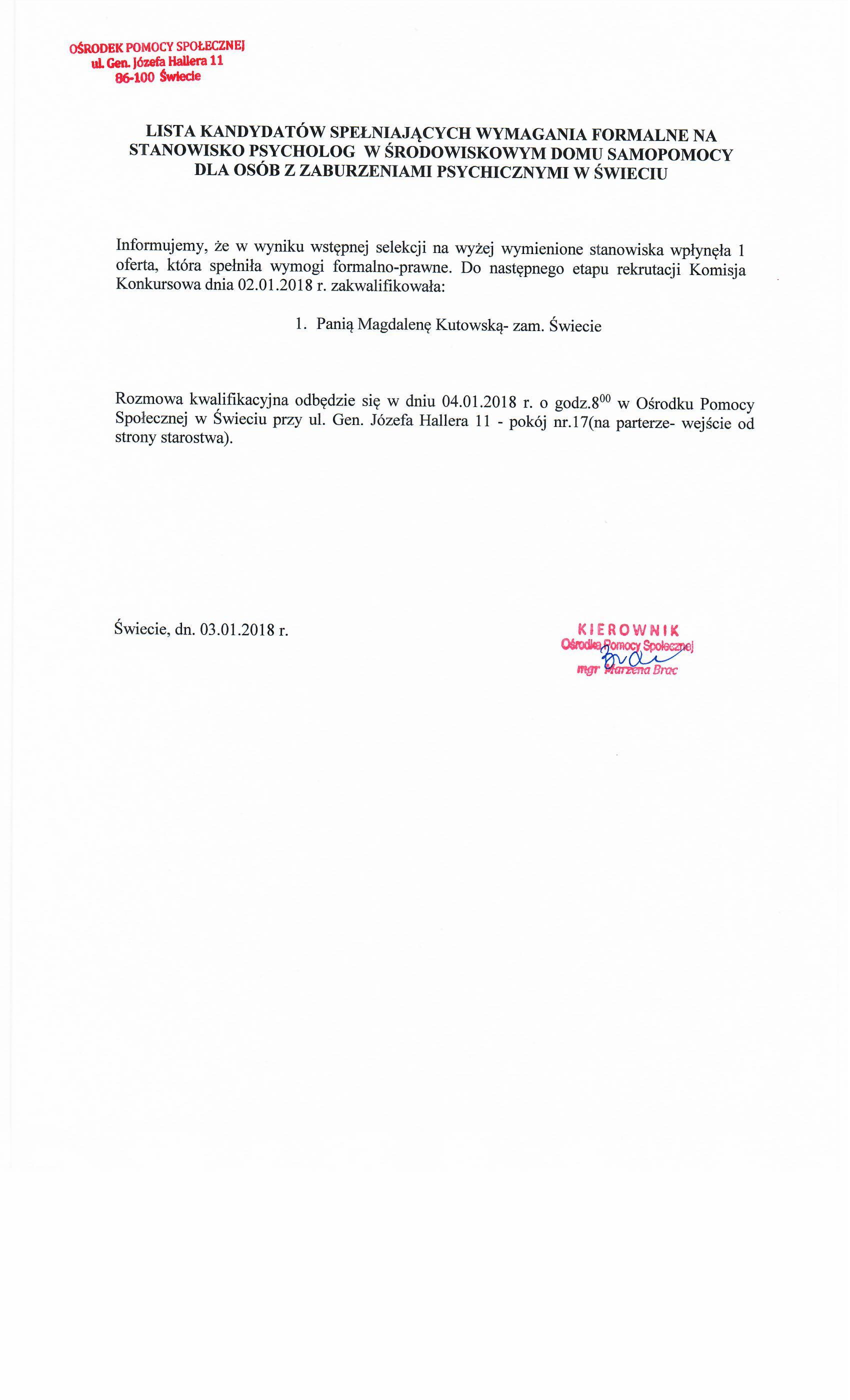 Lista kandydatów spełniających wszystkie wymagania formalne na stanowisko psychologa na umowę - zlecenie w Środowiskowym Domu Samopomocy dla Osób z Zaburzeniami Psychicznymi w Świeciu