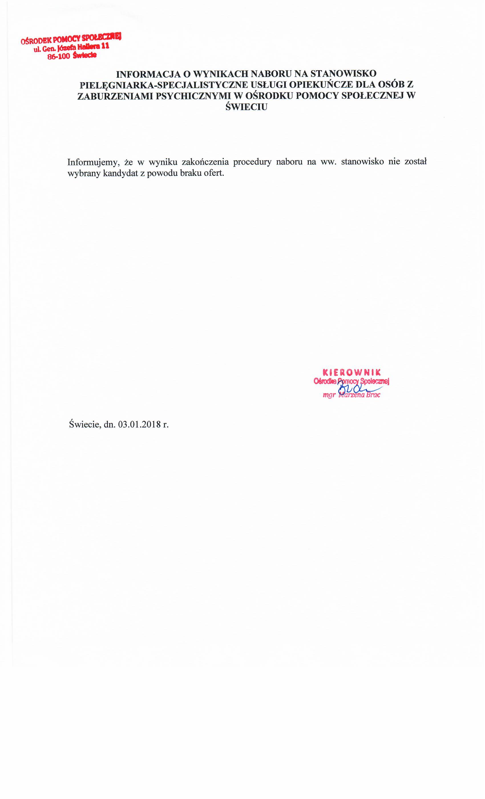 Informacja o wynikach naboru na stanowisko pielęgniarki na umowę - zlecenie w Ośrodku Pomocy Społecznej w Świeciu.