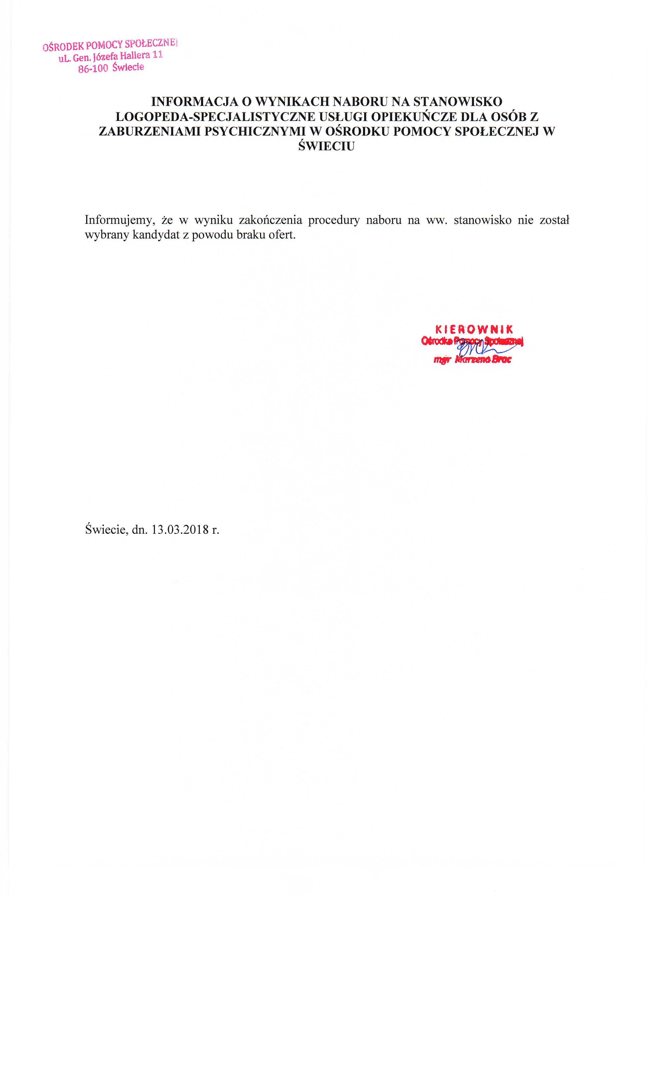 Informacja o wynikach naboru na stanowisko logopedy na umowę- zlecenie w Ośrodku Pomocy Społecznej w Świeciu.