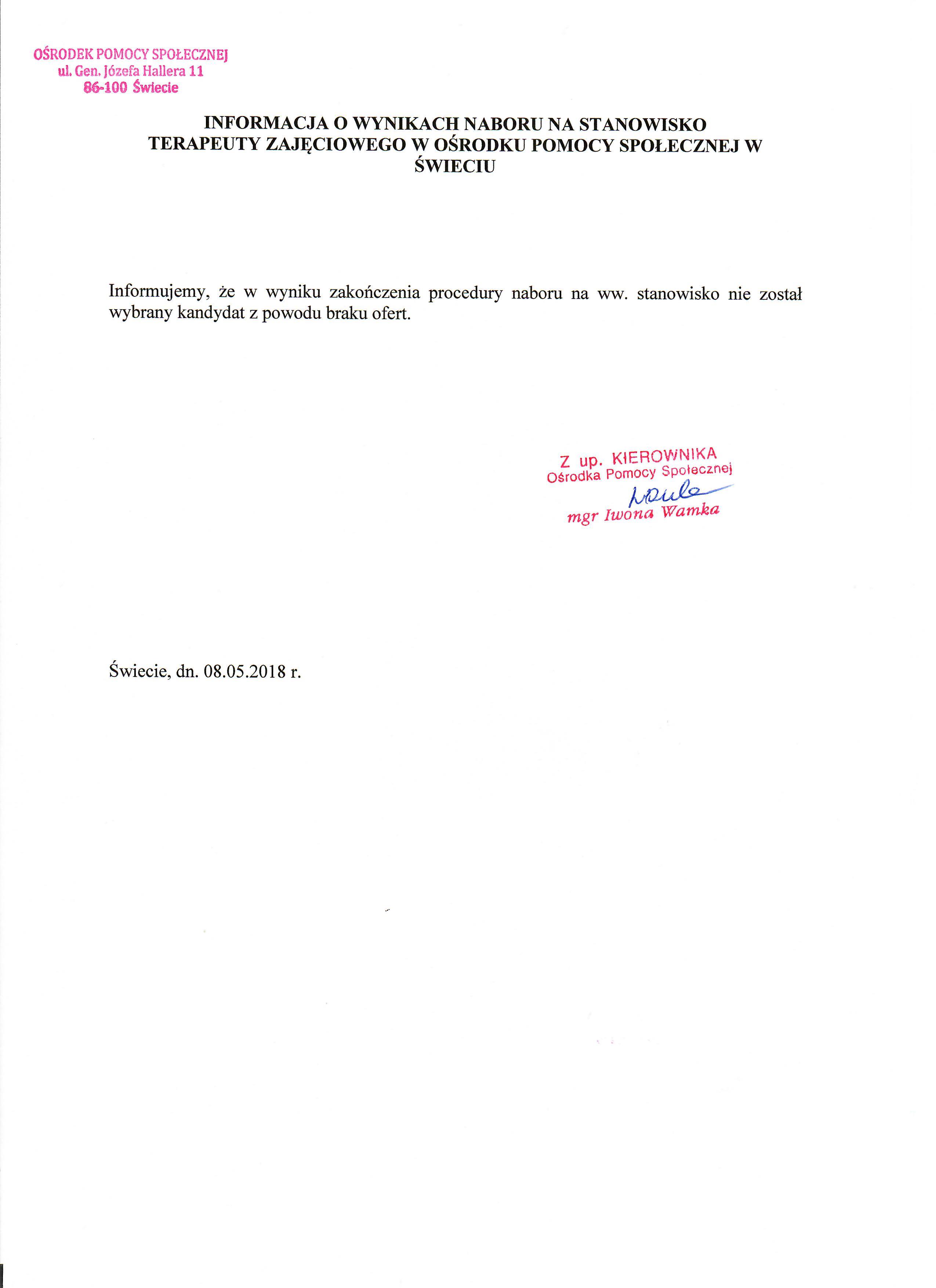 Informacja o wynikach naboru na stanowisko terapeuta zajęciowy na umowę o pracę na zastępstwo w Ośrodku Pomocy Społecznej w Świeciu.
