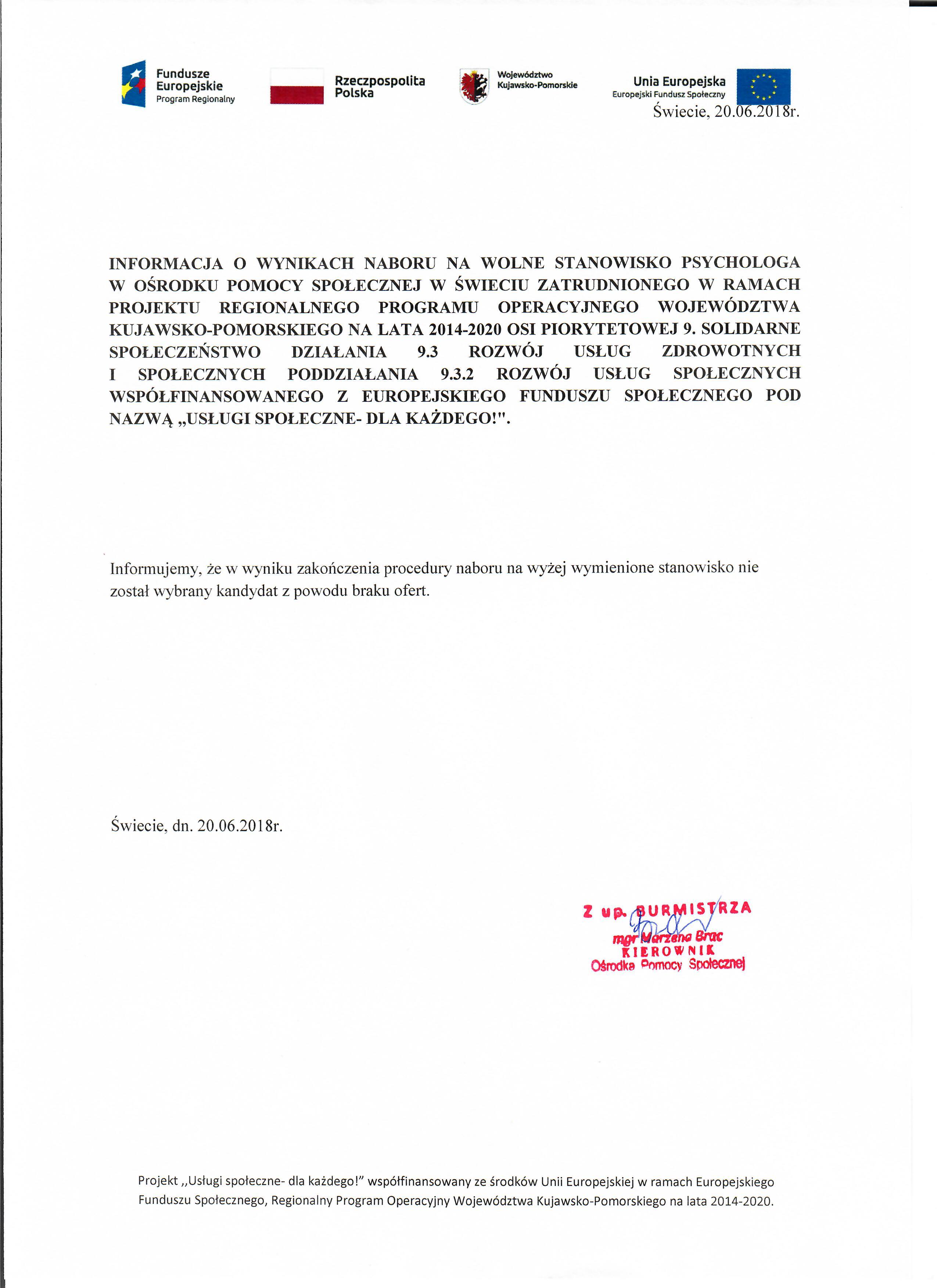 Informacja o wynikach naboru na wolne stanowisko psychologa w Ośrodku Pomocy Społecznej w Świeciu w ramach projektu Regionalnego Programu Operacyjnego Województwa Kujawsko- Pomorskiego na lata 2014-2020 Osi piorytetowej 9. Solidarne społeczeństwo Działania 9.3 Rozwój usług zdrowotnych i społecznych Poddziałania 9.3.2 Rozwój usług społecznych wspołfinansowanego z Europejskiego Funduszu Społecznego pod nazwą ,,Usługi Społeczne- dla każdego!"