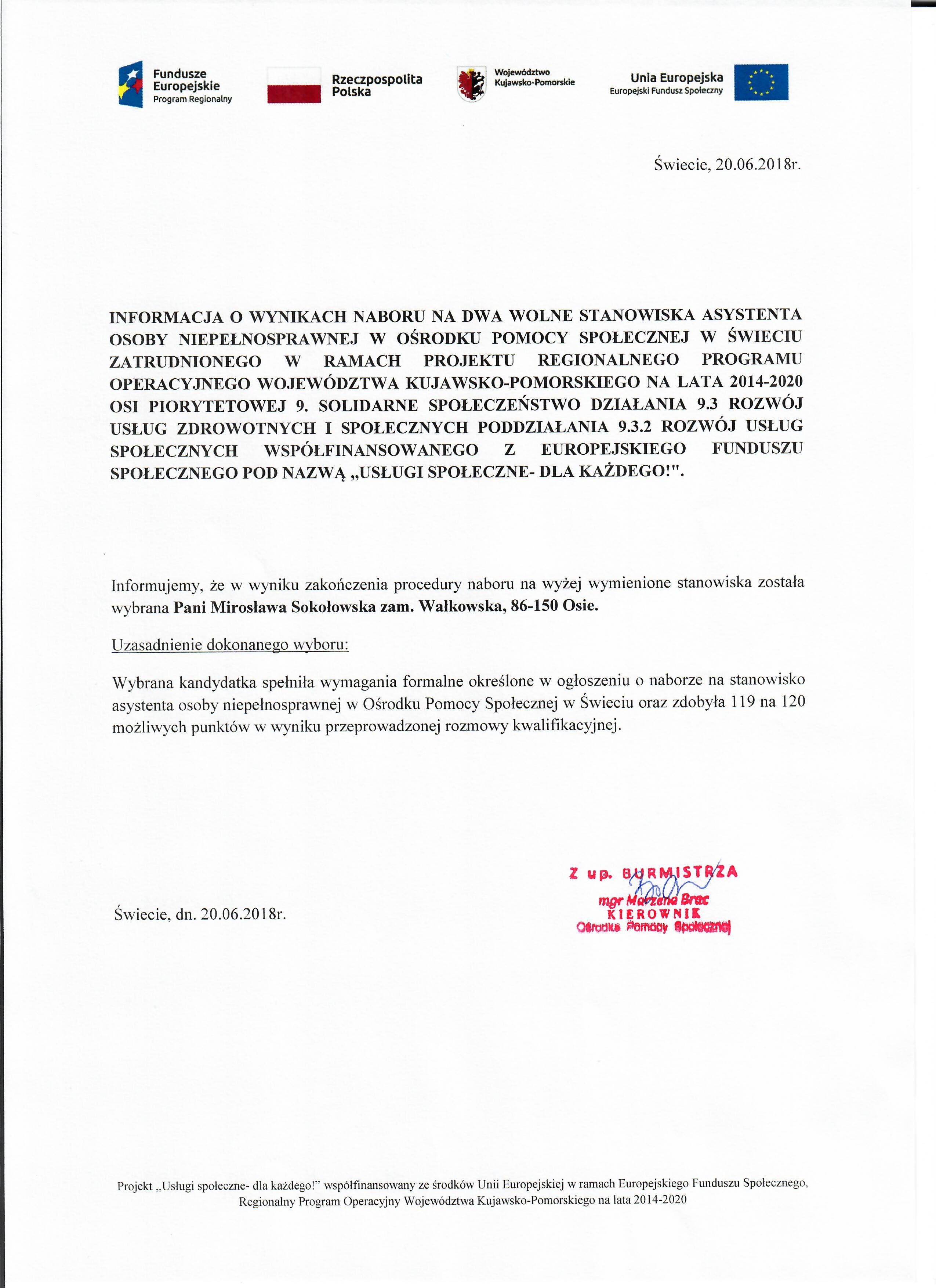 Informacja o wynikach naboru na dwa wolne stanowiska asystenta osoby niepełnosprawnej w Ośrodku Pomocy Społecznej w Świeciu w ramach projektu Regionalnego Programu Operacyjnego Województwa Kujawsko- Pomorskiego na lata 2014-2020 Osi piorytetowej 9. Solidarne społeczeństwo Działania 9.3 Rozwój usług zdrowotnych i społecznych Poddziałania 9.3.2 Rozwój usług społecznych wspołfinansowanego z Europejskiego Funduszu Społecznego pod nazwą ,,Usługi Społeczne- dla każdego!"