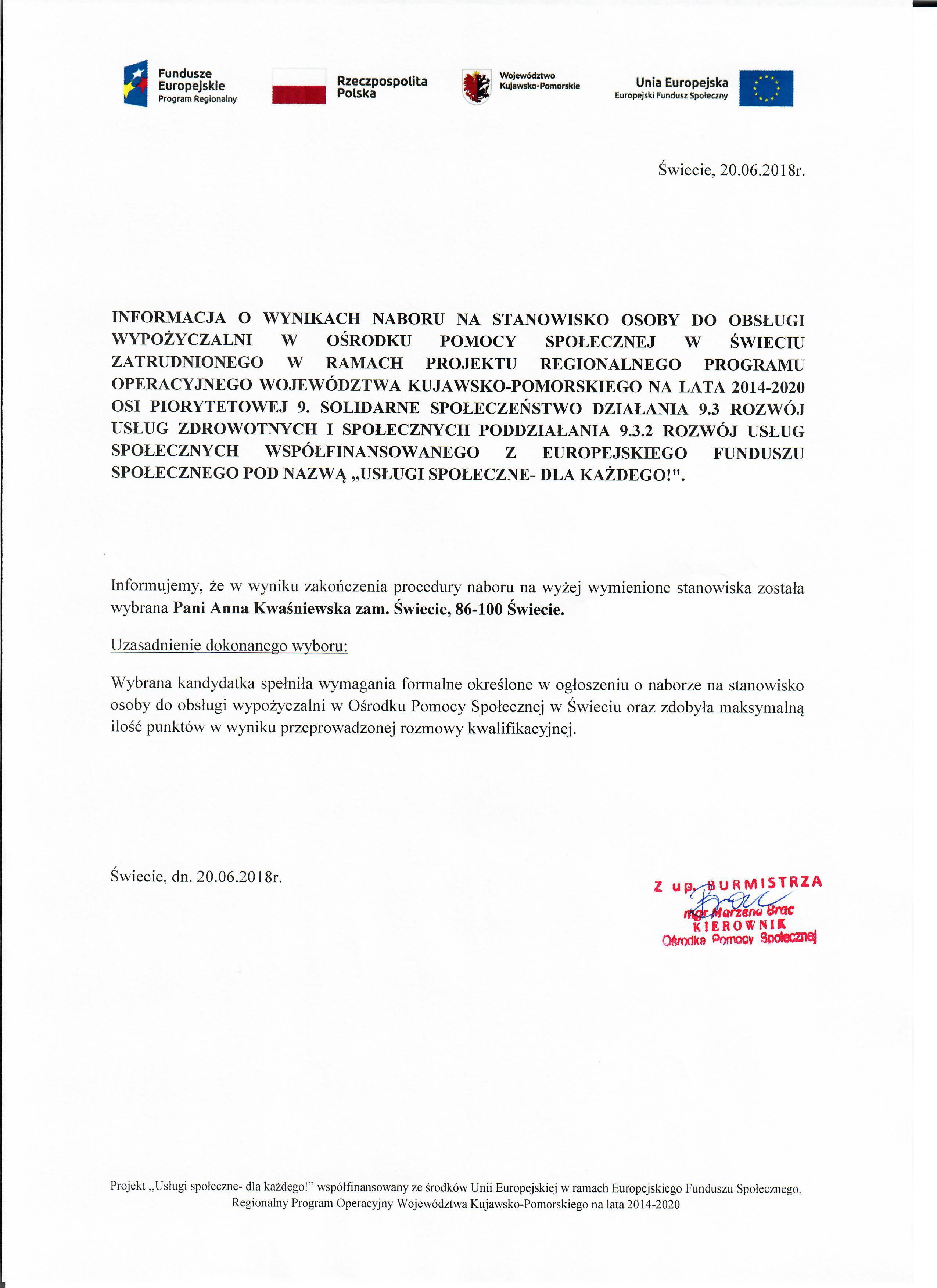 Informacja o wynikach naboru na stanowisko osoby do obsługi wypożyczalni w Ośrodku Pomocy Społecznej w Świeciu w ramach projektu Regionalnego Programu Operacyjnego Województwa Kujawsko- Pomorskiego na lata 2014-2020 Osi piorytetowej 9. Solidarne społeczeństwo Działania 9.3 Rozwój usług zdrowotnych i społecznych Poddziałania 9.3.2 Rozwój usług społecznych wspołfinansowanego z Europejskiego Funduszu Społecznego pod nazwą ,,Usługi Społeczne- dla każdego!"