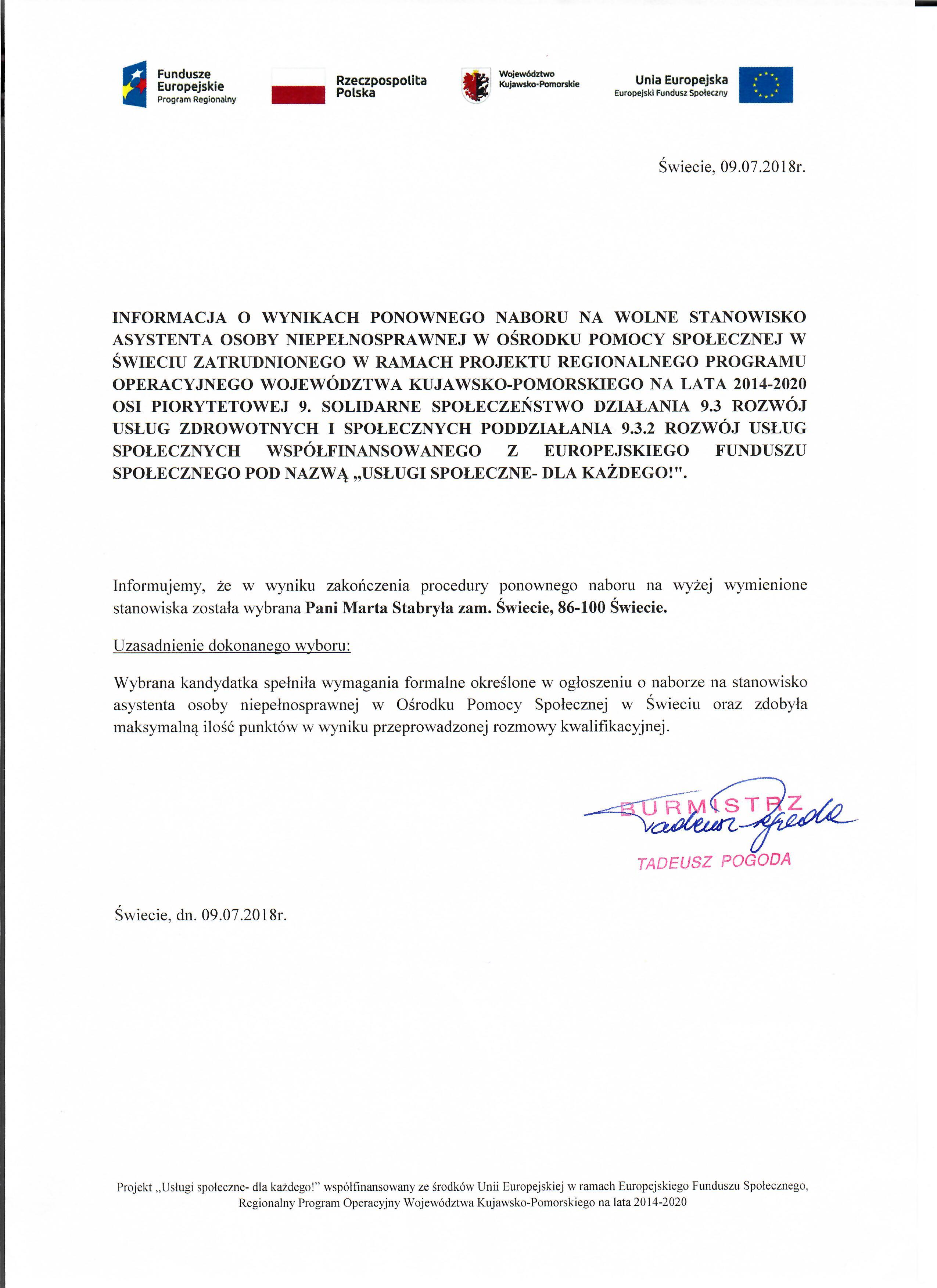 Informacja o wynikach ponownego ogłoszenia o naborze na stanowisko asystent osoby niepełnosprawnej na umowę o pracę w Ośrodku Pomocy Społecznej w Świeciu w ramach projektu Regionalnego Programu Operacyjnego Województwa Kujawsko- Pomorskiego na lata 2014-2020 Osi piorytetowej 9. Solidarne społeczeństwo Działania 9.3 Rozwój usług zdrowotnych i społecznych Poddziałania 9.3.2 Rozwój usług społecznych wspołfinansowanego z Europejskiego Funduszu Społecznego pod nazwą ,,Usługi Społeczne- dla każdego!"