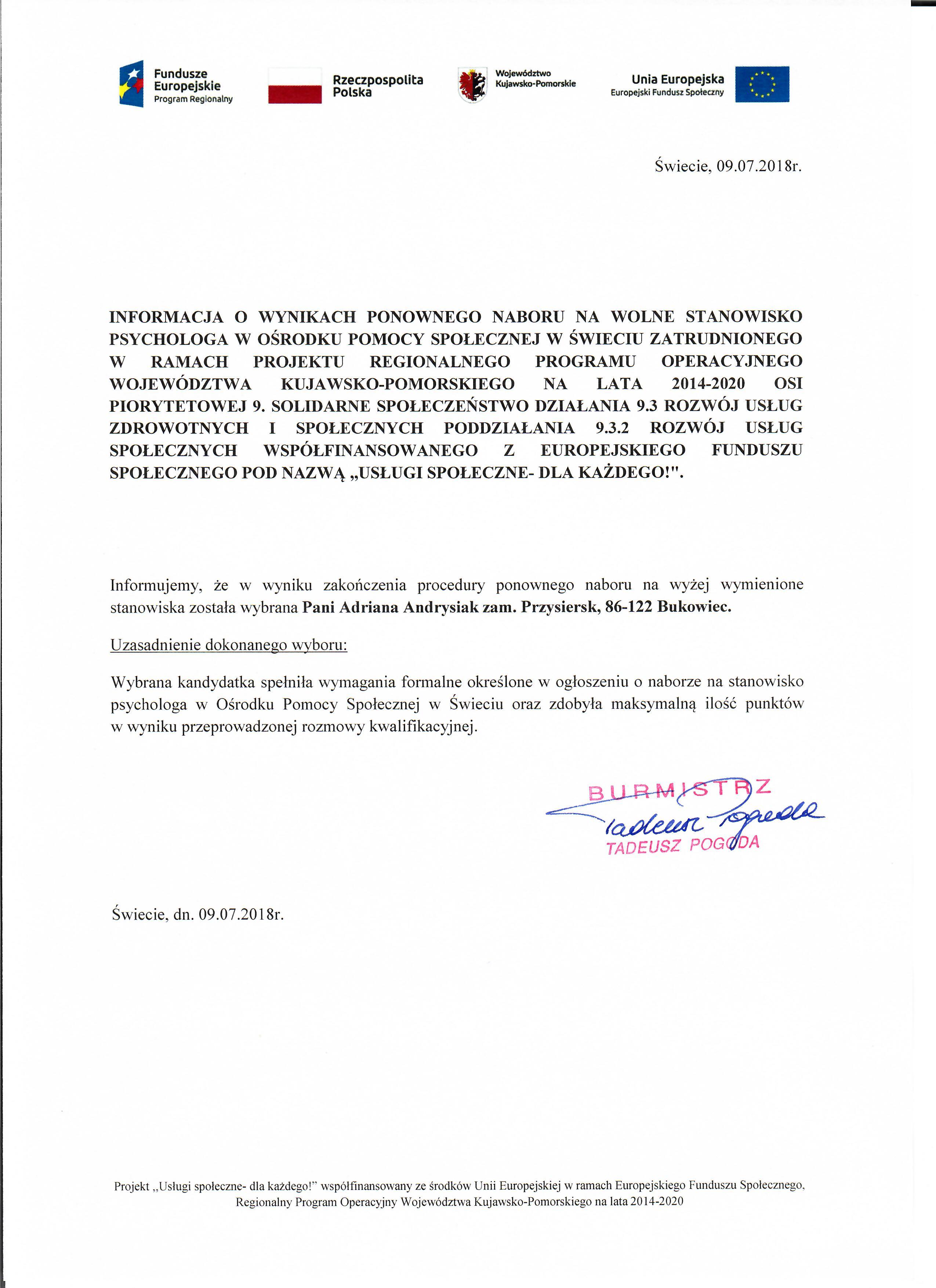 Informacja o wynikach ponownego ogłoszenia o naborze na stanowisko psycholog na umowę o pracę w Ośrodku Pomocy Społecznej w Świeciu w ramach projektu Regionalnego Programu Operacyjnego Województwa Kujawsko- Pomorskiego na lata 2014-2020 Osi piorytetowej 9. Solidarne społeczeństwo Działania 9.3 Rozwój usług zdrowotnych i społecznych Poddziałania 9.3.2 Rozwój usług społecznych wspołfinansowanego z Europejskiego Funduszu Społecznego pod nazwą ,,Usługi Społeczne- dla każdego!"
