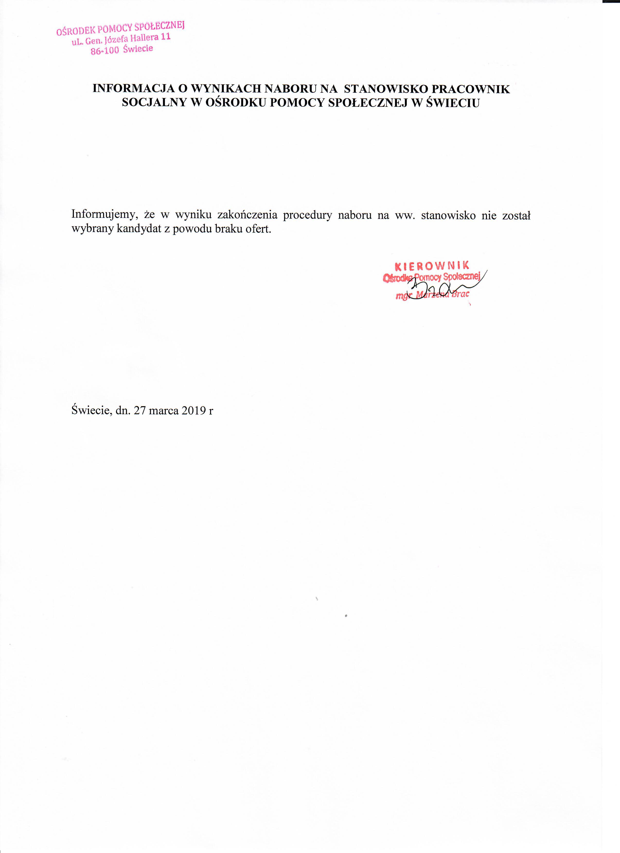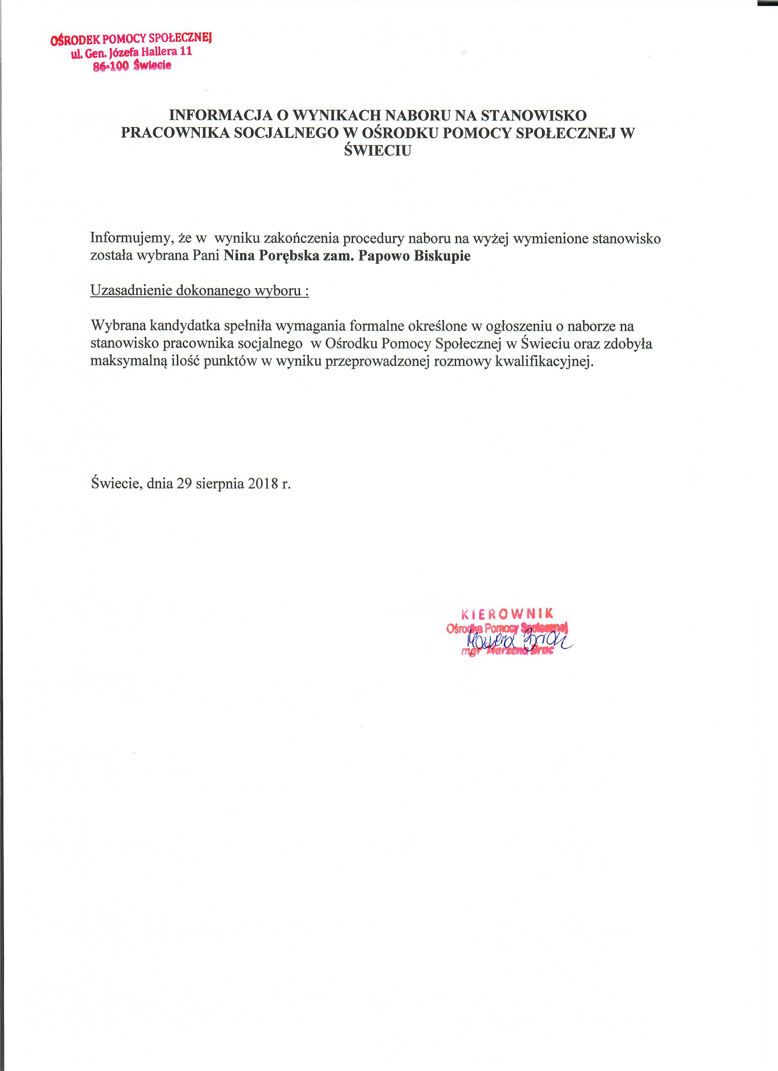 Informacja o wynikach naboru na stanowisko Pracownika Socjalnego na umowę o pracę na czas zastępstwa w Ośrodku Pomocy Społecznej w Świeciu