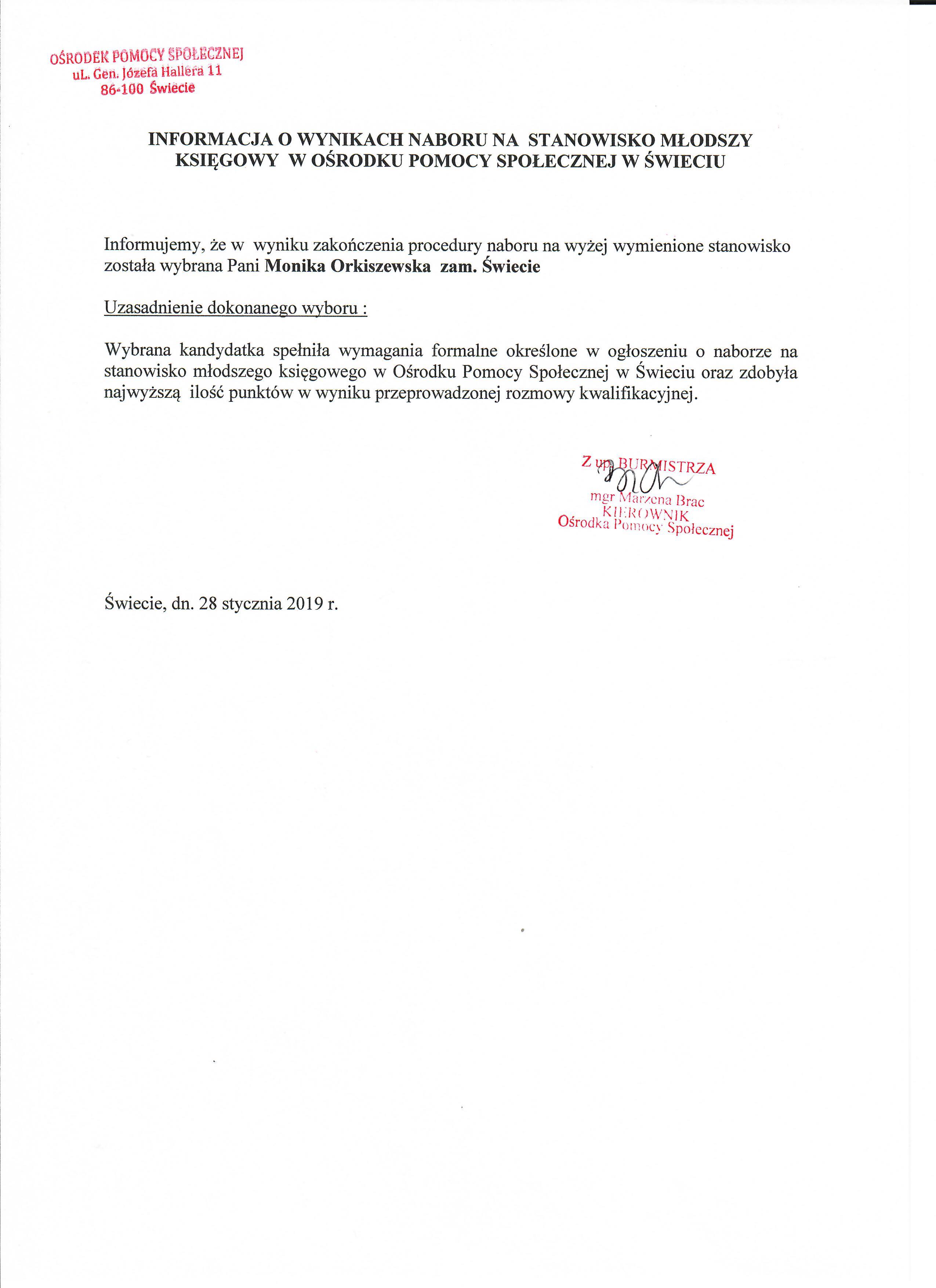 Informacja o wyniku wyboru na stanowisko Młodszy Księgowy na umowę o pracę w Ośrodku Pomocy Społecznej w Świeciu