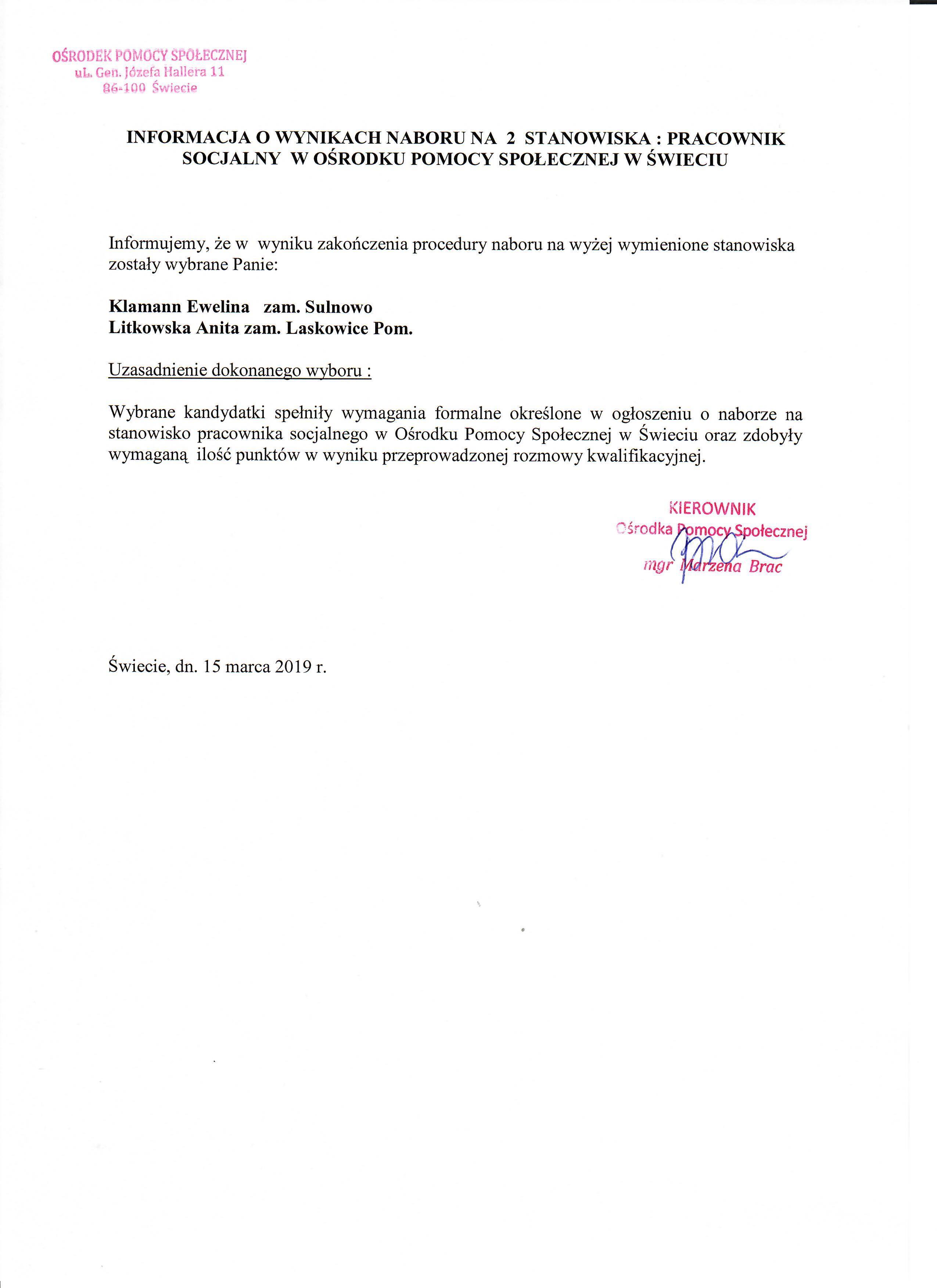 Informacja o wyborze na dwa stanowiska Pracownika Socjalnego na umowę o pracę w Ośrodku Pomocy Społecznej w Świeciu