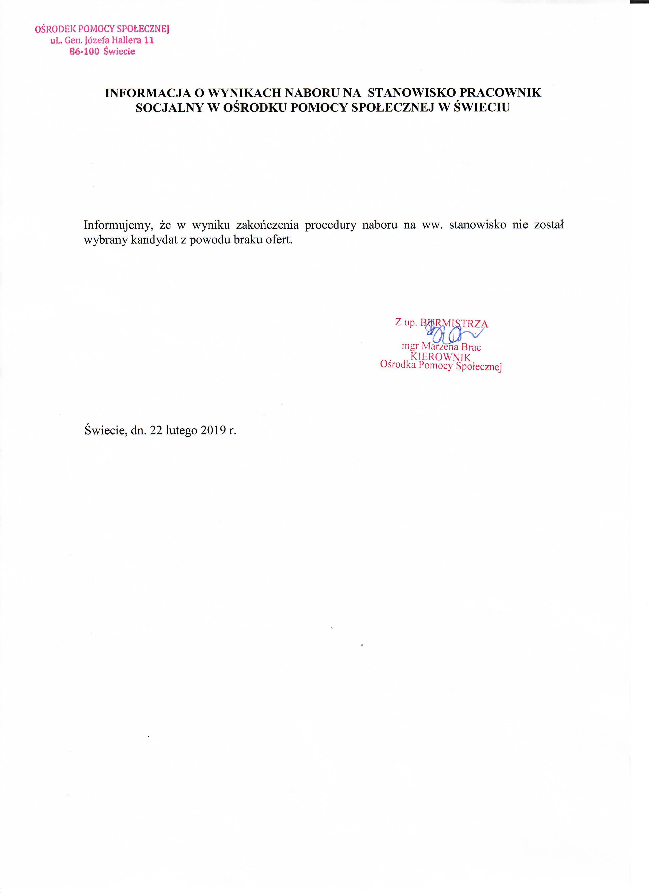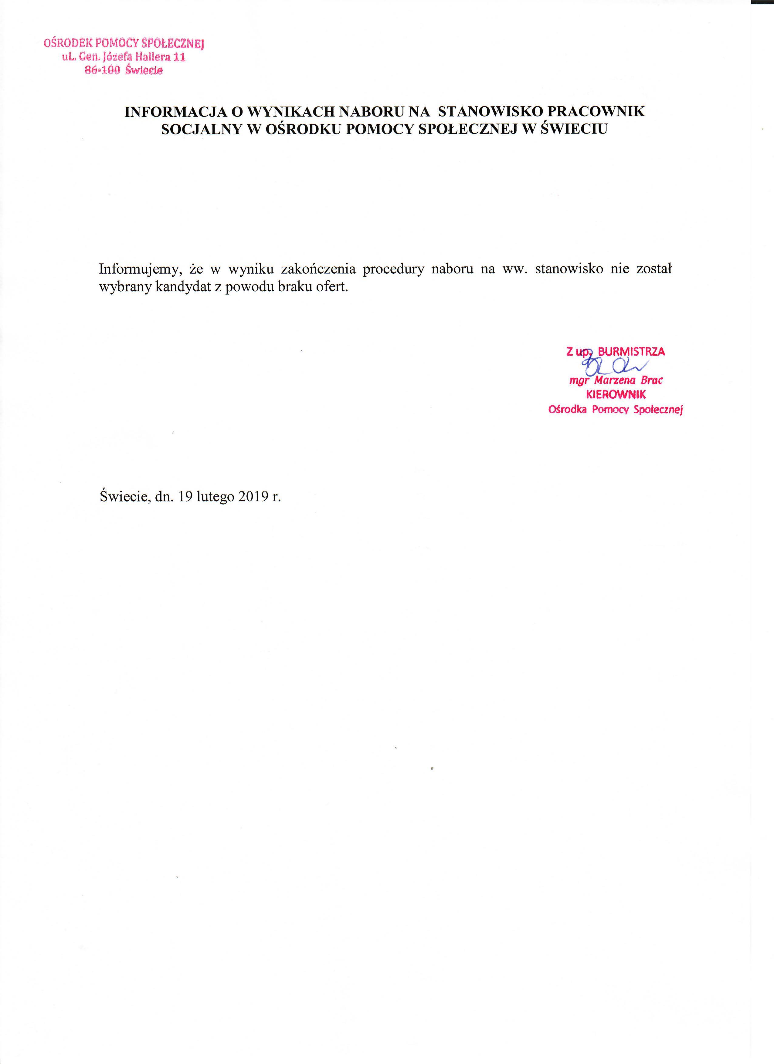 Informacja o wynikach naboru na stanowisko pracownika socjalnego w Ośrodku Pomocy Społecznej w Świeciu.