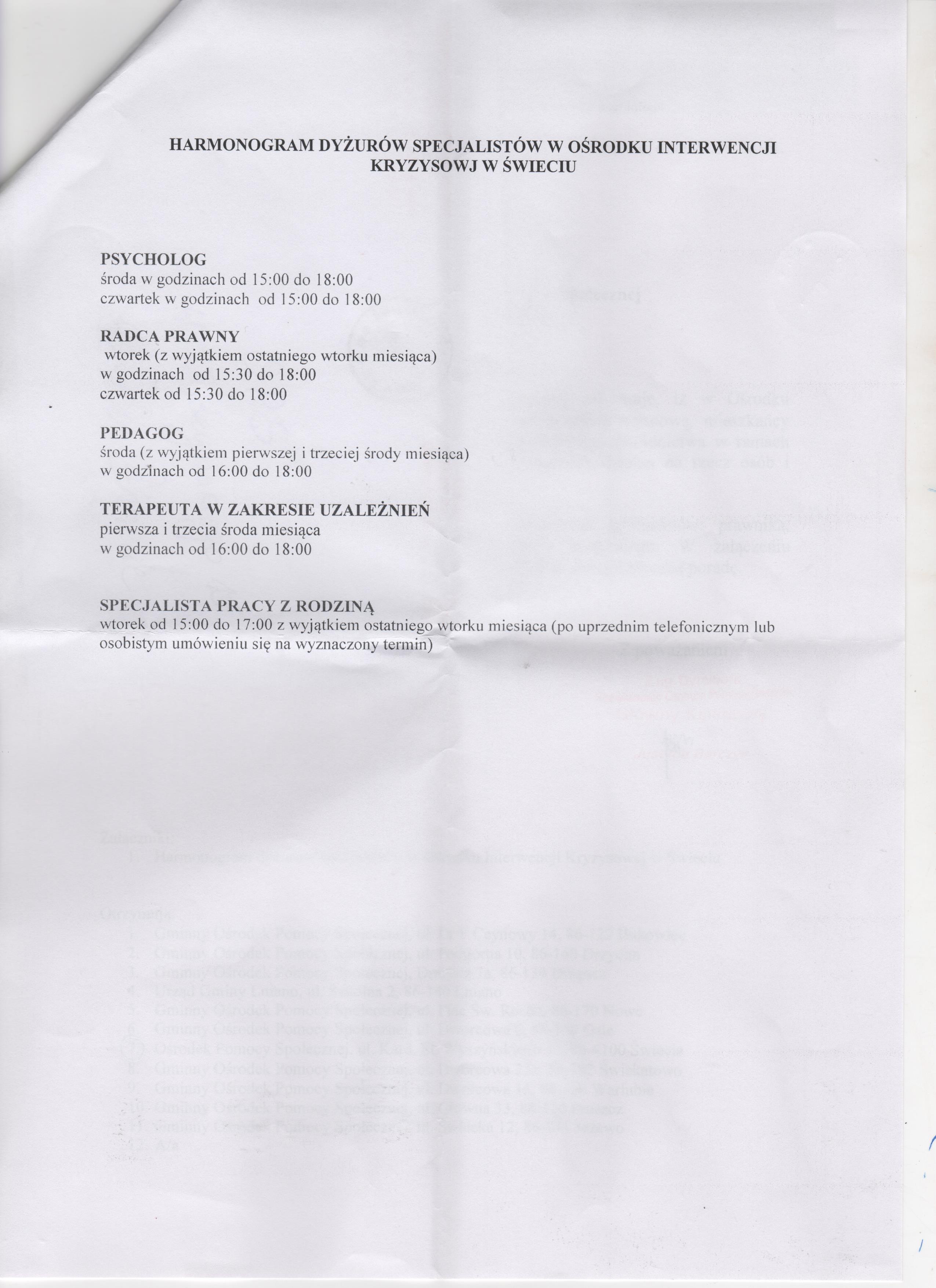 Zapraszany... (2015-09-28) Informujemy, iż w Ośrodku Interwencji Kryzysowej w Świeciu ul. Sądowa 18 mieszkańcy Powiatu Świeckiego mogą uzyskać pomoc w postaci bezpłatnego poradnictwa w ramch interwencji kryzysowej stanowiącej zespół interdyscyplinarnych działań na rzecz osób i rodzin będących w kryzysie. Powyższa pomoc obejmuje poradnictwo następujących specjalistów: prawnika, psychologa, pedagoga, terapeuty uzależnień oraz terapeuty rodzinnego. Zapraszamy do zapozniania sie z harmonogramem terminów, w jakich można uzyskać specjalistyczną poradę. |