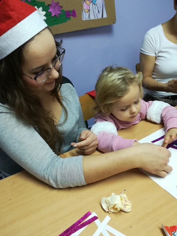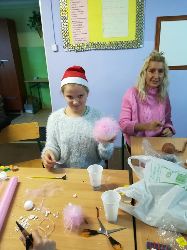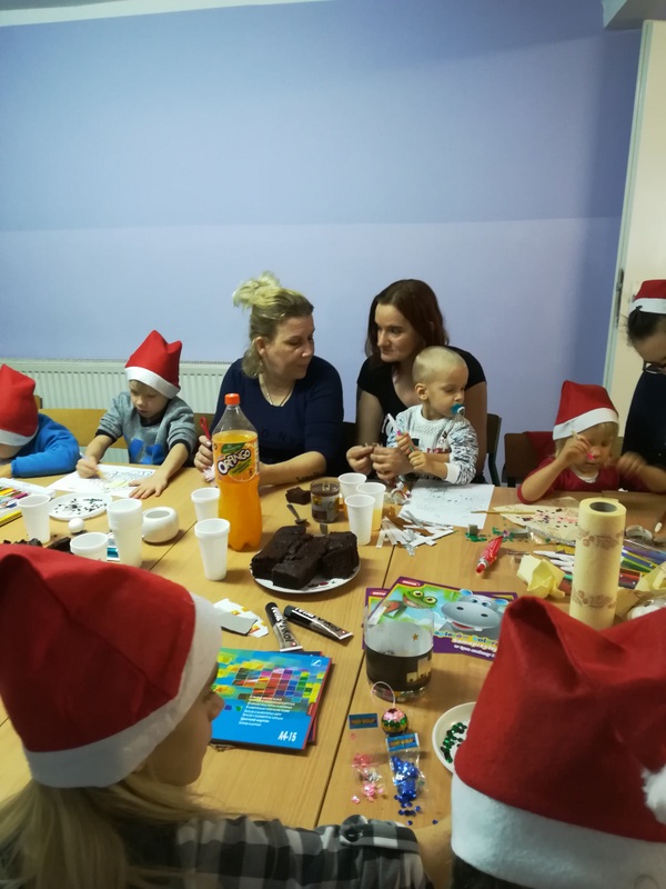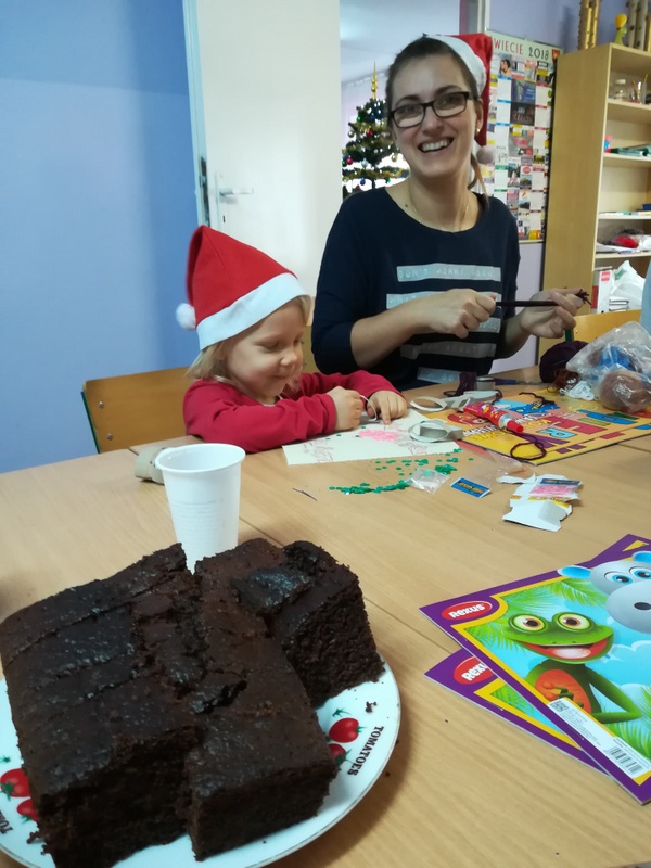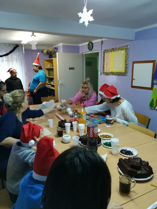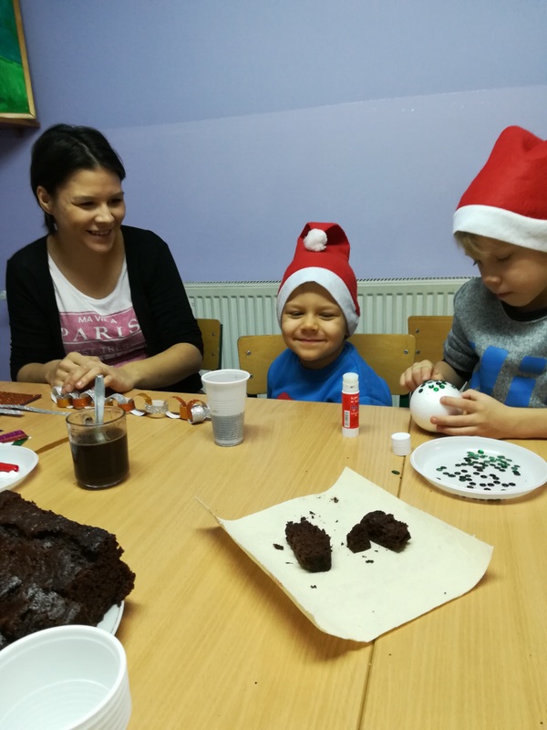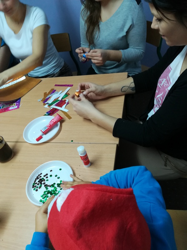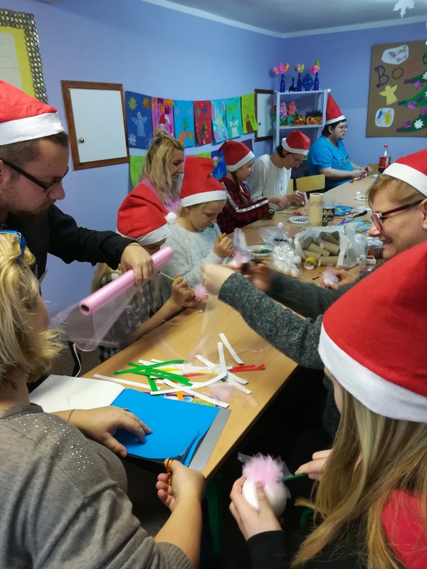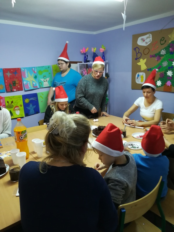 Warsztaty integracyjne pt. ,,Święta, Święta, każda buźka uśmiechnięta? (2018-12-10) W dniu 08.12.2018 r. z inicjatywy asystenta rodziny, Ludmiły Młynik zorganizowane zostały warsztaty integracyjne pt. ,,Święta, Święta, każda buźka uśmiechnięta” dla rodziców i dzieci będących w systemie Pomocy Społecznej. Celem głównym spotkania było przygotowanie ozdób świątecznych przez rodziców i dzieci przy pomocy asystenta rodziny oraz uczniów studium terapii zajęciowej. Spotkanie odbyło się w atmosferze sprzyjającej wzmacnianiu pozytywnych emocji spędzania czasu wolnego dzieci w obecności ich opiekunów. Podczas spotkania wykorzystano metodę grupową, jak również elementy socjoterapii w zabawie grupowej. Podczas spotkania zapewniono napoje i ciasto dla uczestników. Wykonane własnoręcznie ozdoby świąteczne rodziny zabrały ze sobą.