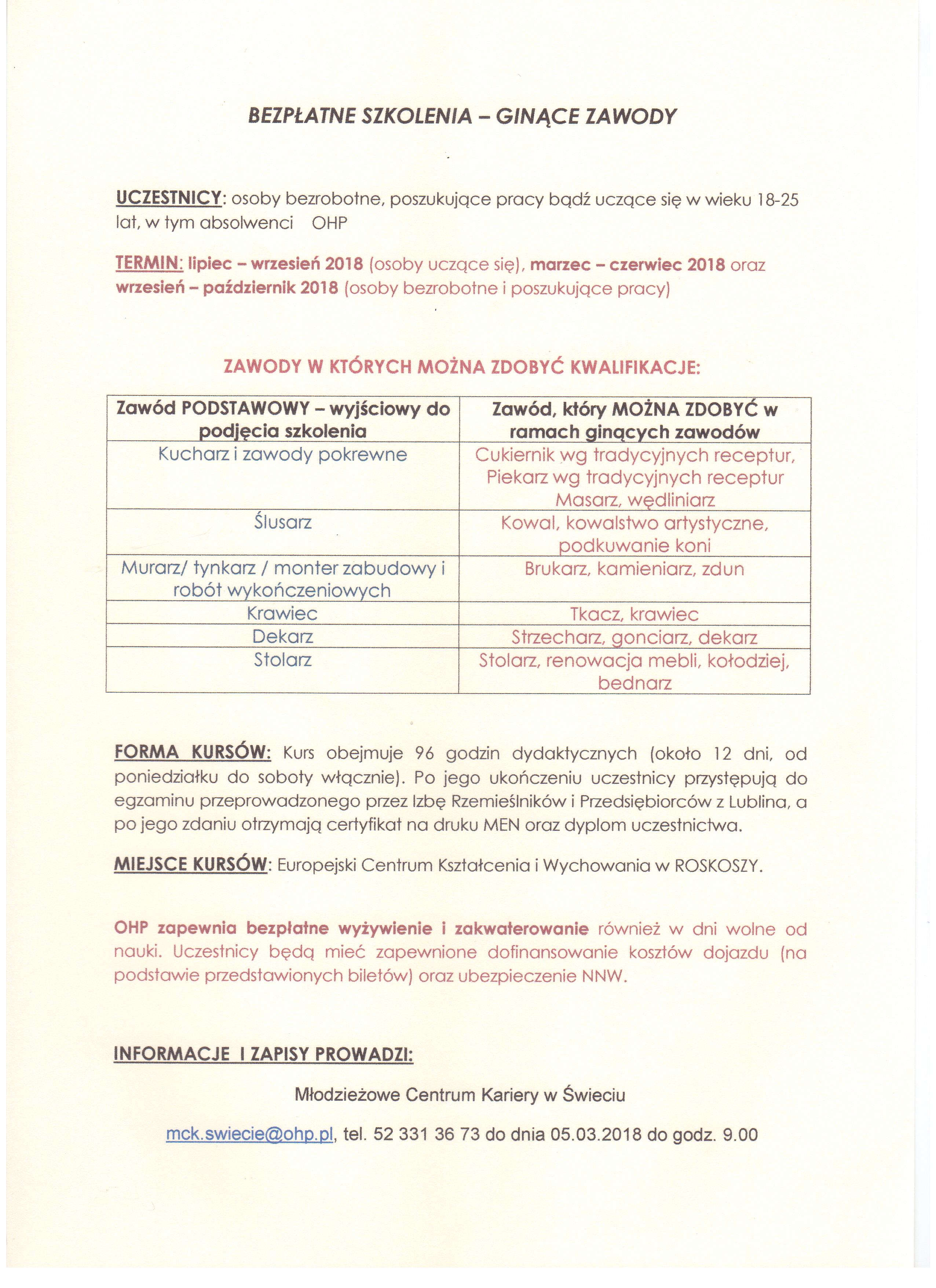 Młodzieżowe Centrum Kariery OHP w Świeciu zaprasza na bezpłatne kursy...