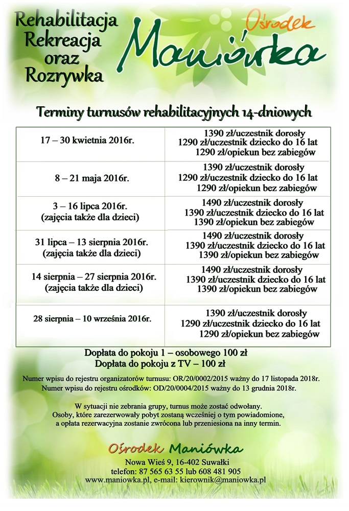 Numer wpisu do rejestru organizatorów turnusu: OR/20/0002/2015 ważny do 17 listopada 2018r.