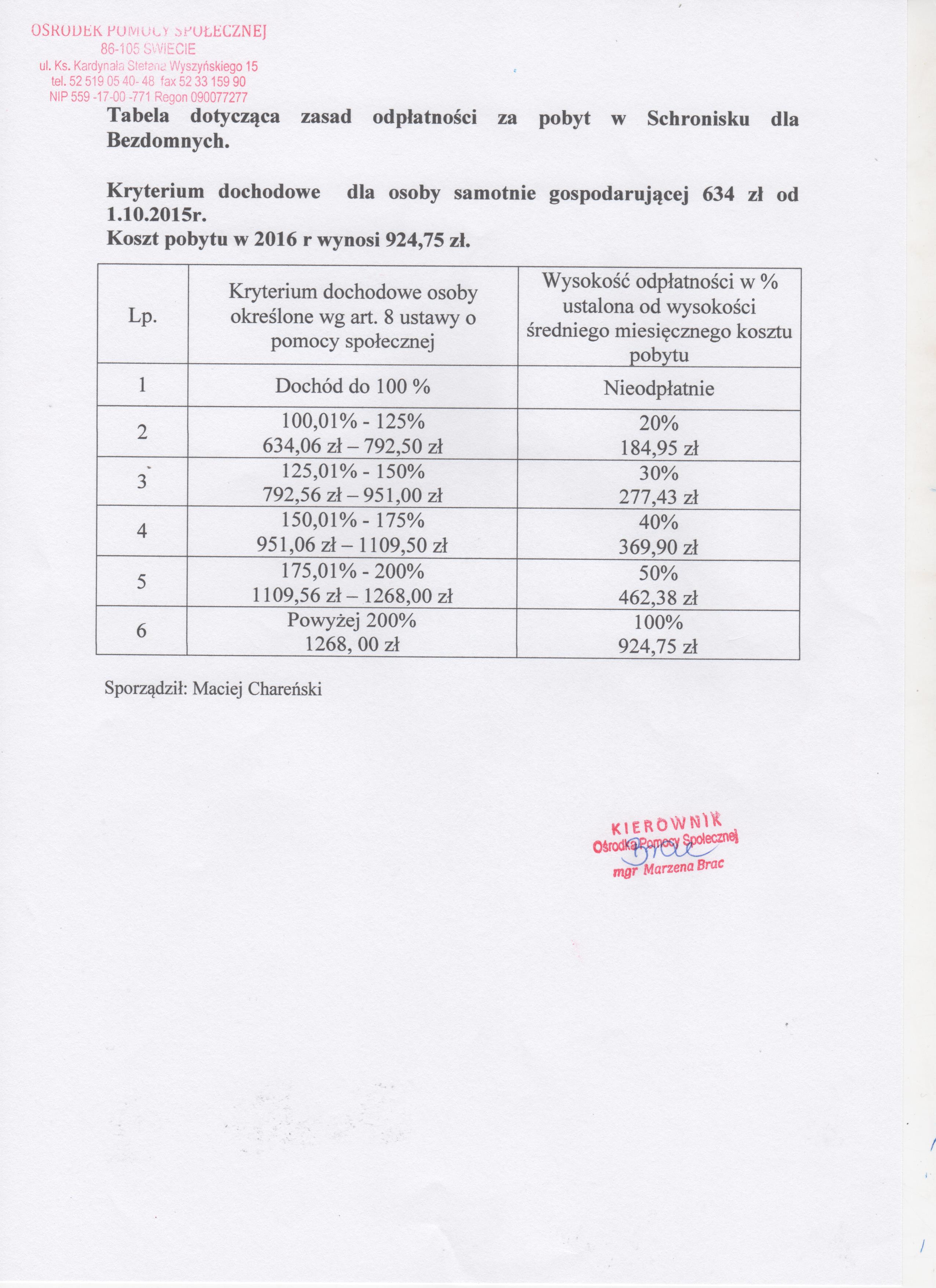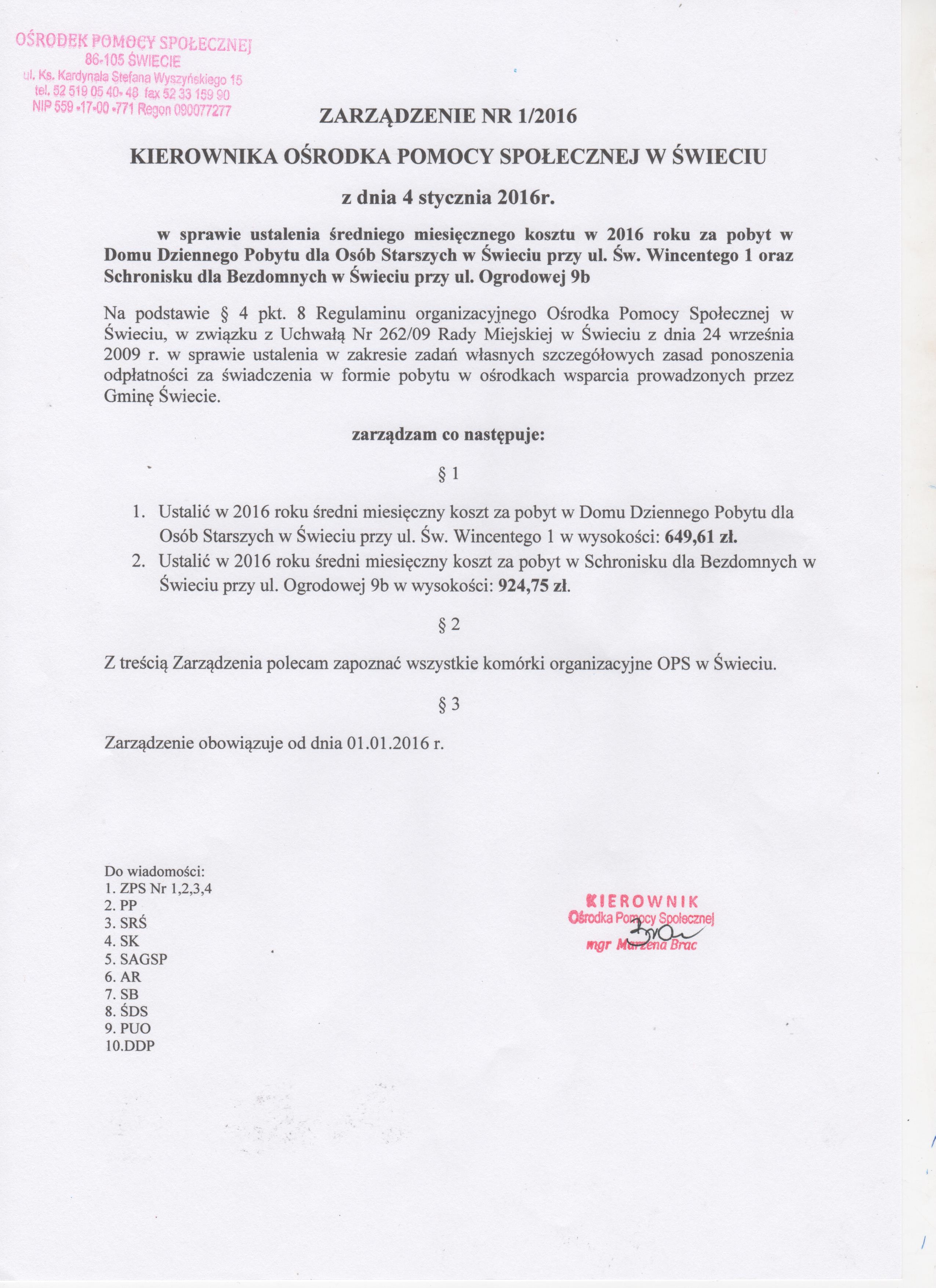 Zarządzenie Kierownika Ośrodka Pomocy Społecznej w Świeciu z dnia 4 stycznia 2016 r. w sprawie ustalenia średniego miesięcznego kosztu w 2016 roku za pobyt w Schronisku dla Bezdomnych w Świeciu przy ul. Ogrodowej 9 b.