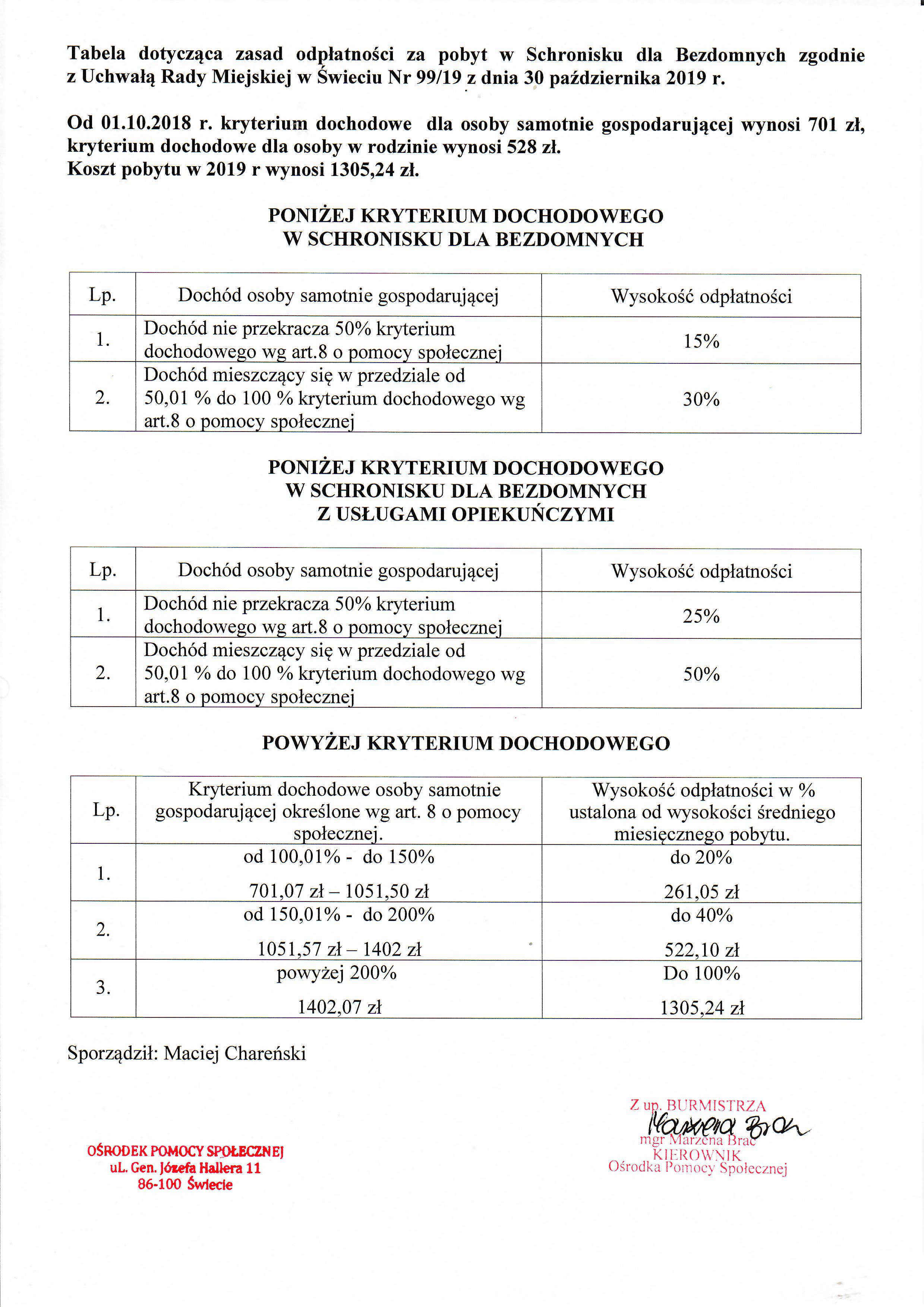 Tabela odpłatności za pobyt w Schronisku dla Bezdomnych w Świeciu obowiązująca od 01.11.2019 roku.