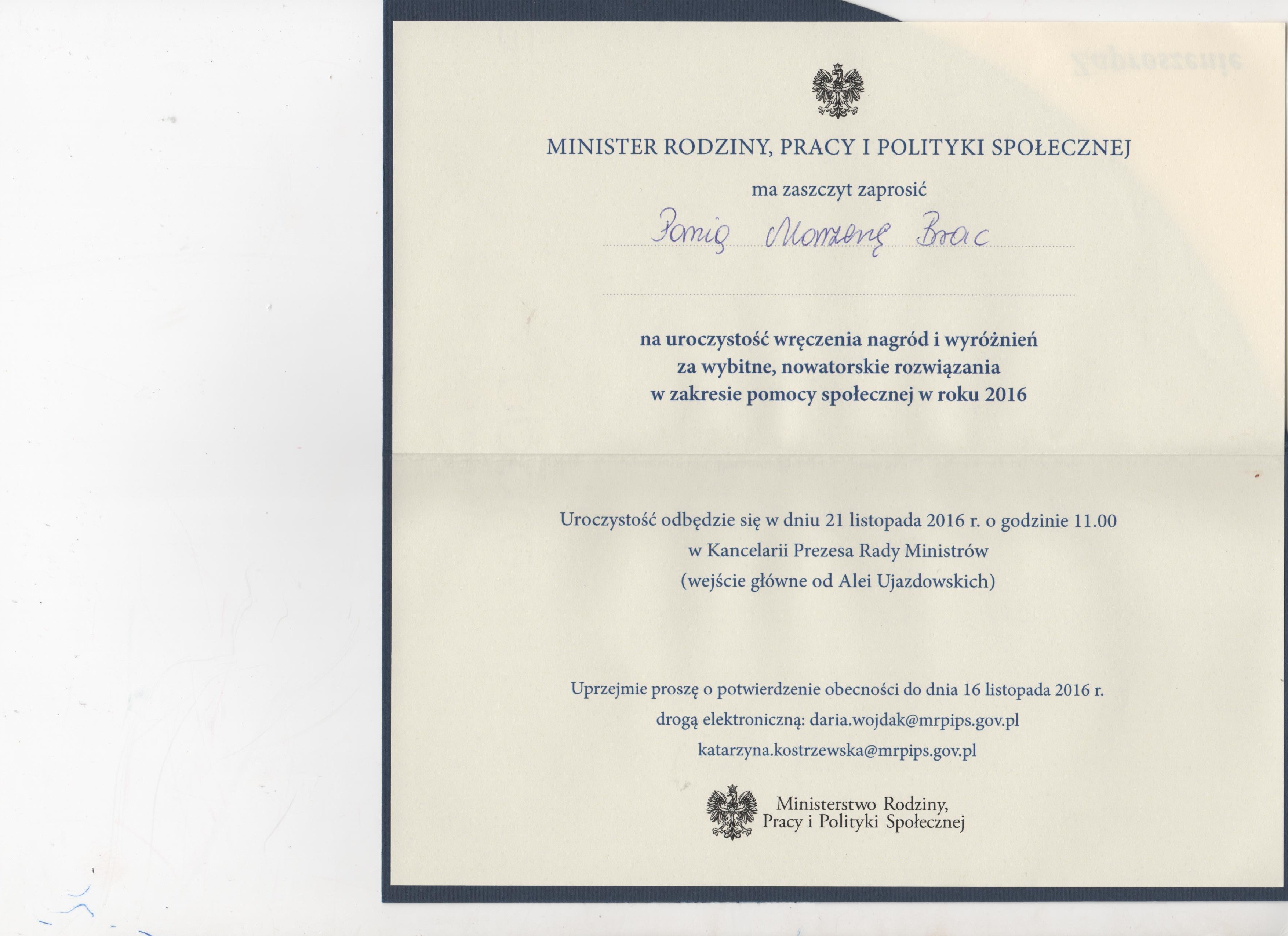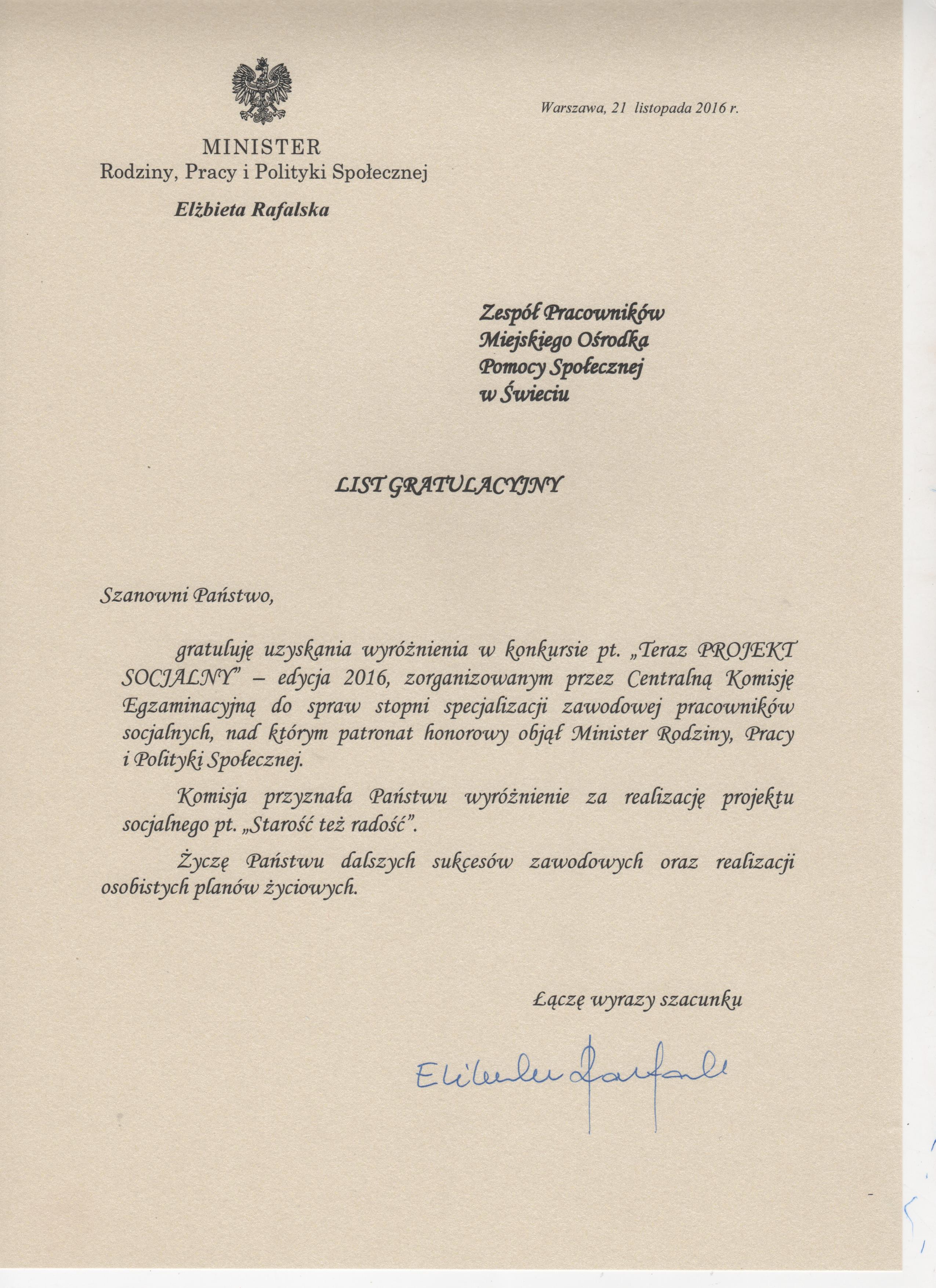 Ministerstwo wyróżniło... (2016-11-24) Ministerstwo Rodziny, Pracy i Polityki Społecznej przyznało Ośrodkowi Pomocy Społecznej w Świeciu wyróżnienie z zakresu "Projekt Socjalny - edycja 2016 za wybitne i nowatorskie rozwiązania w zakresie pomocy społecznej" dnia 21 listopada w Warszawie. Wyróżniony projekt pt, "Starość też radość" realizowany był przez OPS w Świeciu. Sukcesem jest fakt, że z tej kategorii "projektów socjalnych" wyróżniono cztery projekty z całej Polski. Praca w systemie pomocy społecznej to służba drugiemu człowiekowi. Praca trudna, wymagająca i często wyczerpująca. Wyróżnienie, którego doświadczyli pracownicy OPS w Świeciu jest ogromną motywacją do dalszego zaangażowania całego zespołu. Kierownik OPS w Świeciu dziękuje wszystkim partnerom, sponsorom i ludziom o wielkim sercu bez, których nie osiągnęlibyśmy tego sukcesu. Największą jednak nagrodą jest uśmiech i radość człowieka, który był beneficjentem naszych działań.