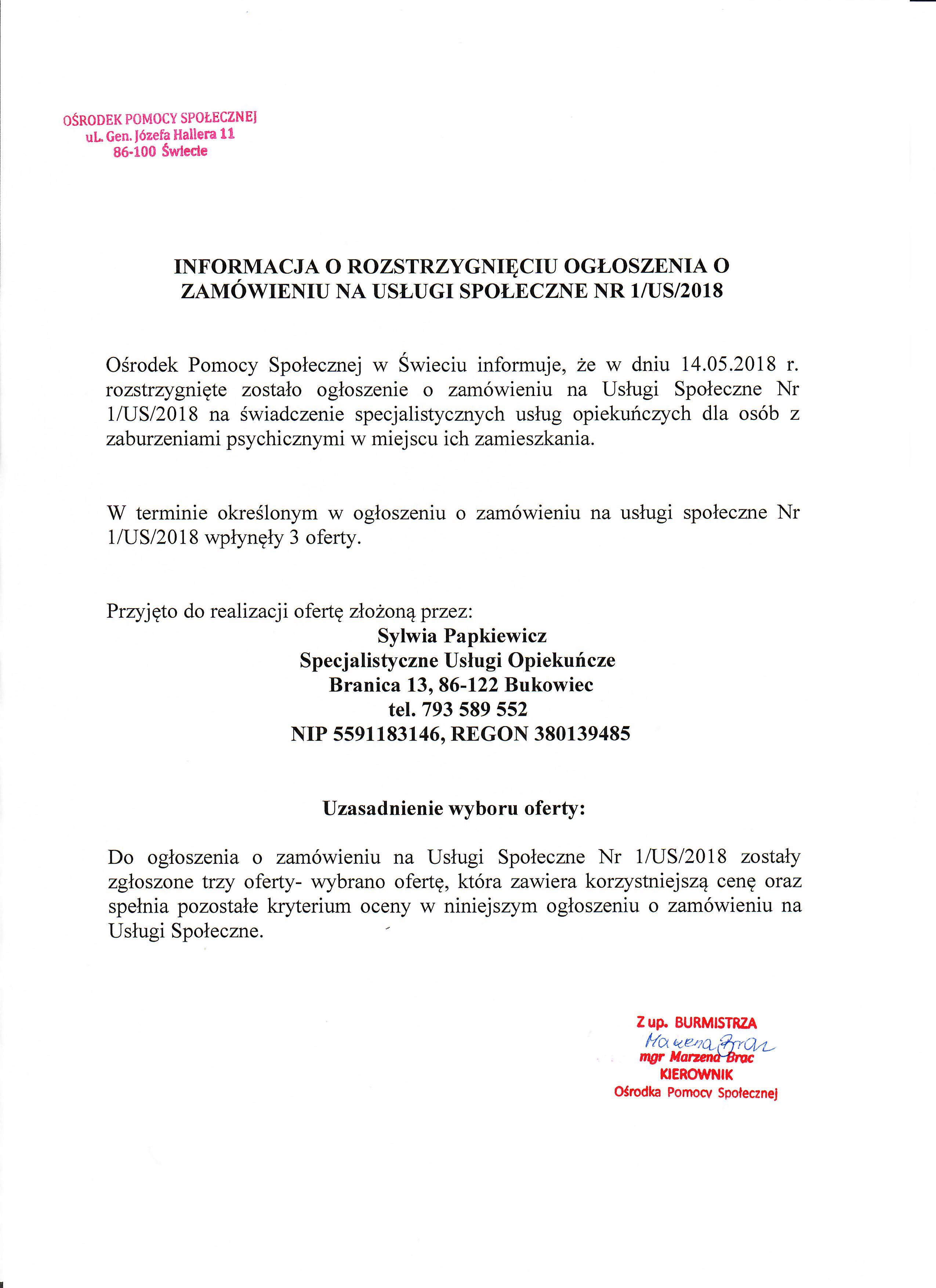 Świecie, 14.05.2018r. INFORMACJA O ROZSTRZYGNIĘCIU OGŁOSZENIA O ZAMÓWIENIU NA USŁUGI SPOŁECZNE NR 1/US/2018. NA ŚWIADCZENIE SPECJALISTYCZNYCH USŁUG OPIEKUŃCZYCH DLA OSÓB Z ZABURZENIAMI PSYCHICZNYMI.