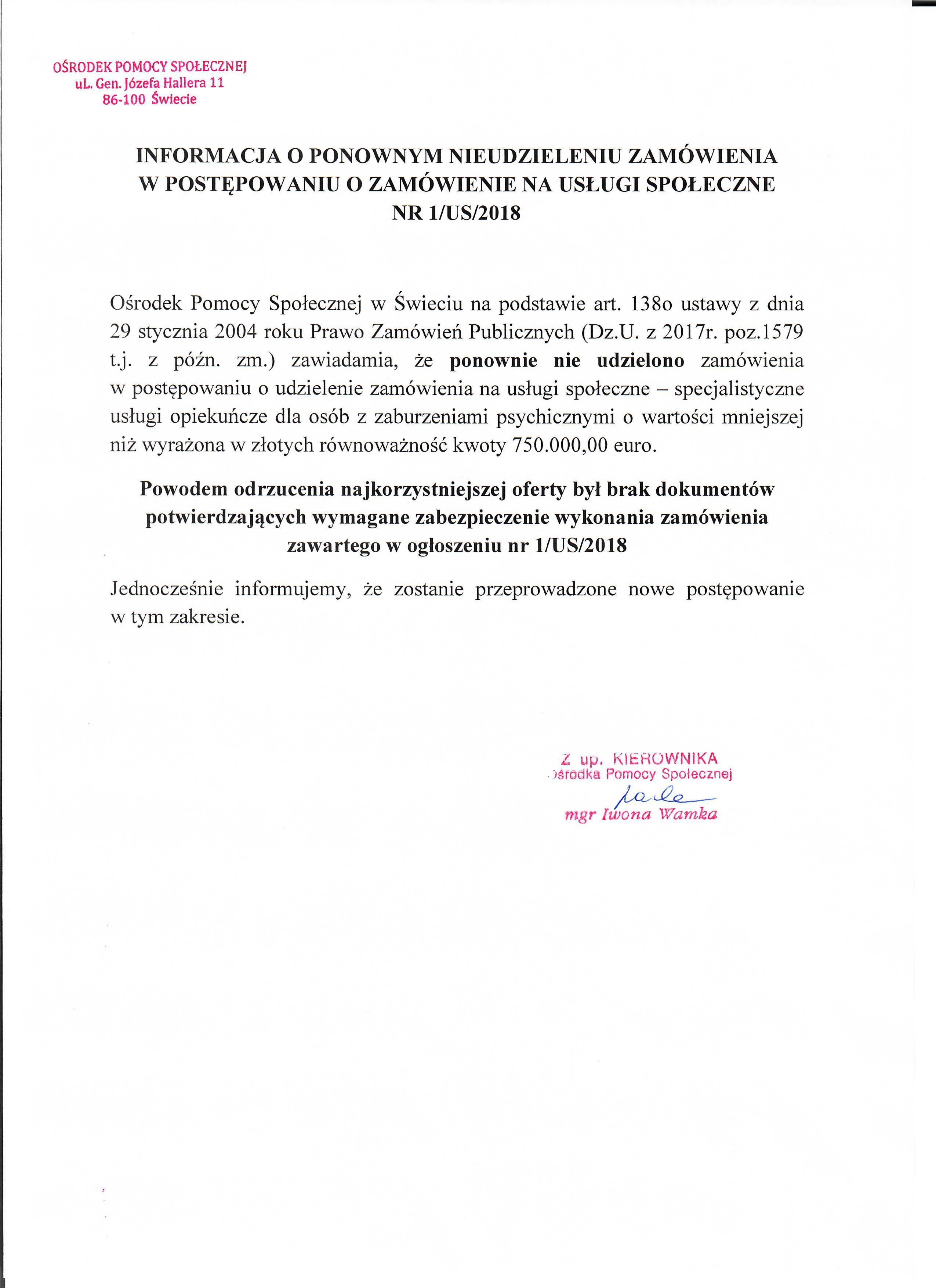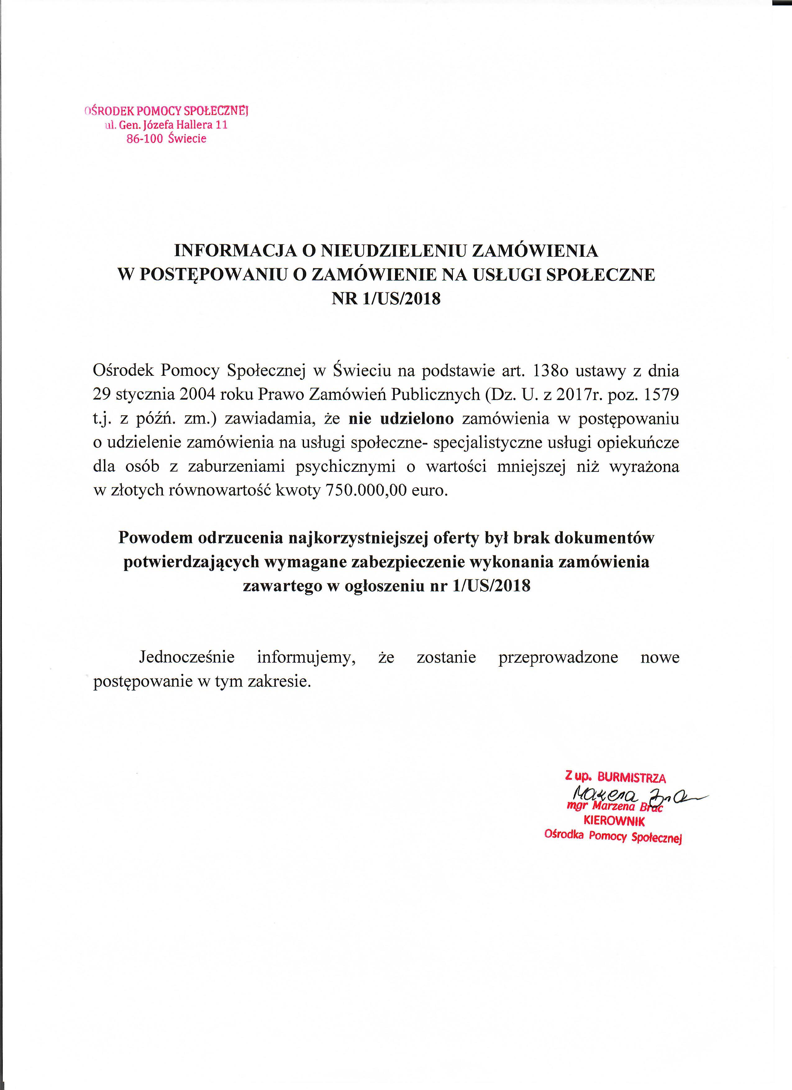 Świecie, 01.06.2018r. INFORMACJA O NIEUDZIELENIU ZAMÓWIENIA W POSTĘPOWANIU O ZAMÓWIENIE NA USŁUGI SPOŁECZNE NR 1/US/2018