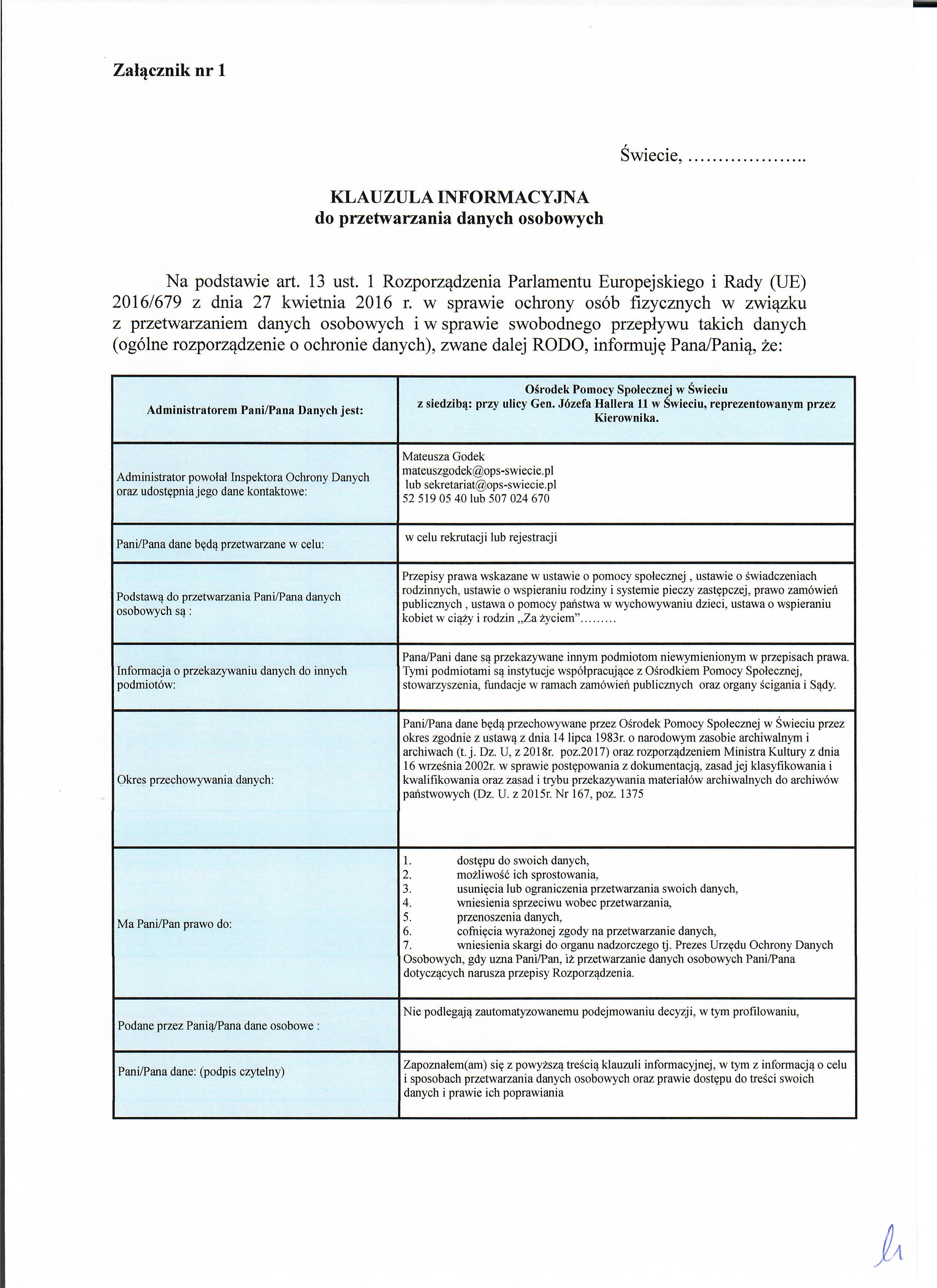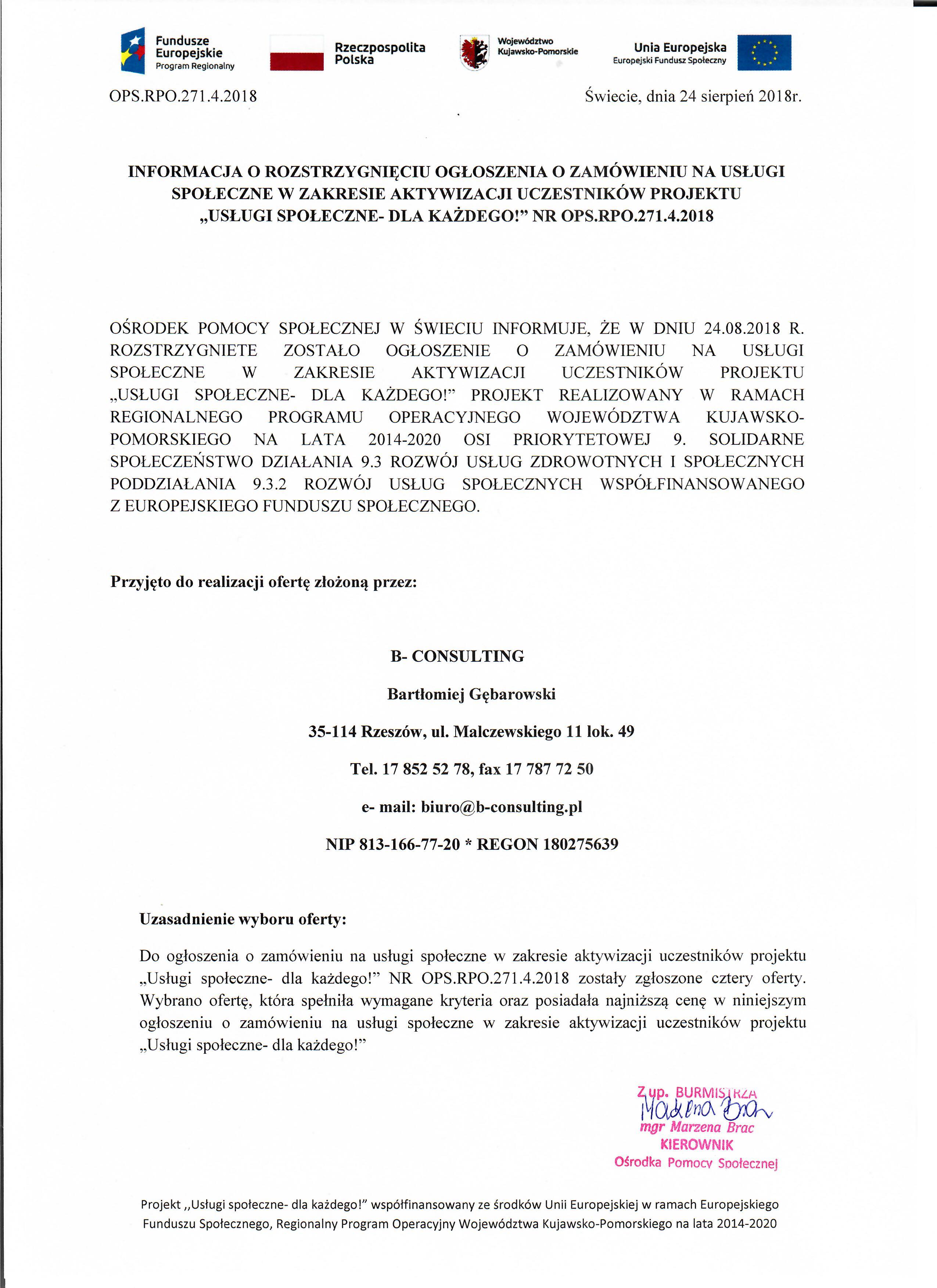 Świecie, 24.08.2018r. INFORMACJA O ROZSTRZYGNIĘCIU OGŁOSZENIA O ZAMÓWIENIU NA USŁUGI SPOŁECZNE W ZAKRESIE AKTYWIZACJI UCZESTNIKÓW PROJEKTU „USŁUGI SPOŁECZNE- DLA KAŻDEGO!” NR OPS.RPO.271.4.2018