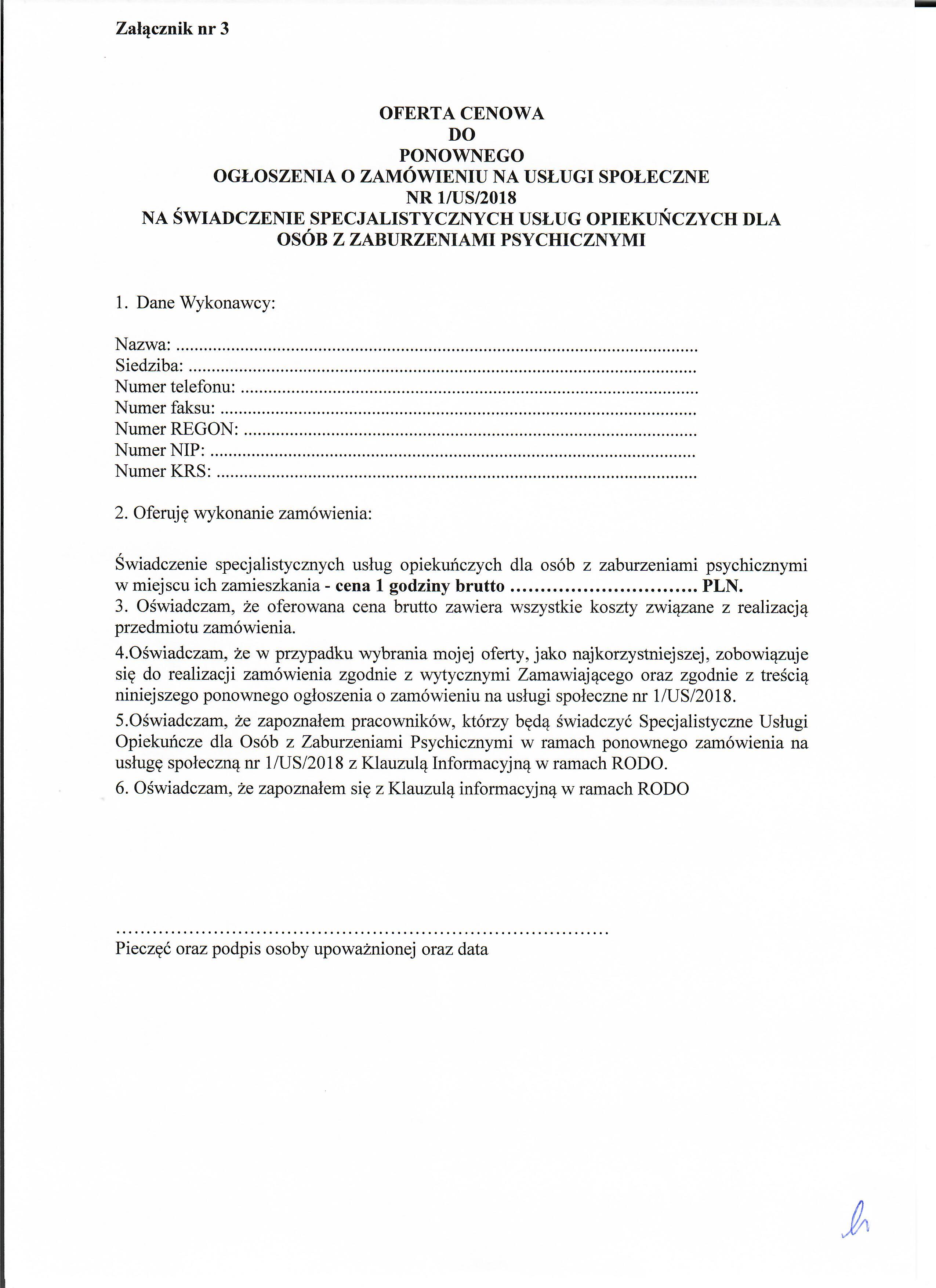 INFORMACJA O ROZSTRZYGNIĘCIU OGŁOSZENIA O ZAMÓWIENIU NA USŁUGI SPOŁECZNE NR 2/US/2018. NA ŚWIADCZENIE SPECJALISTYCZNYCH USŁUG OPIEKUŃCZYCH DLA OSÓB Z ZABURZENIAMI PSYCHICZNYMI.