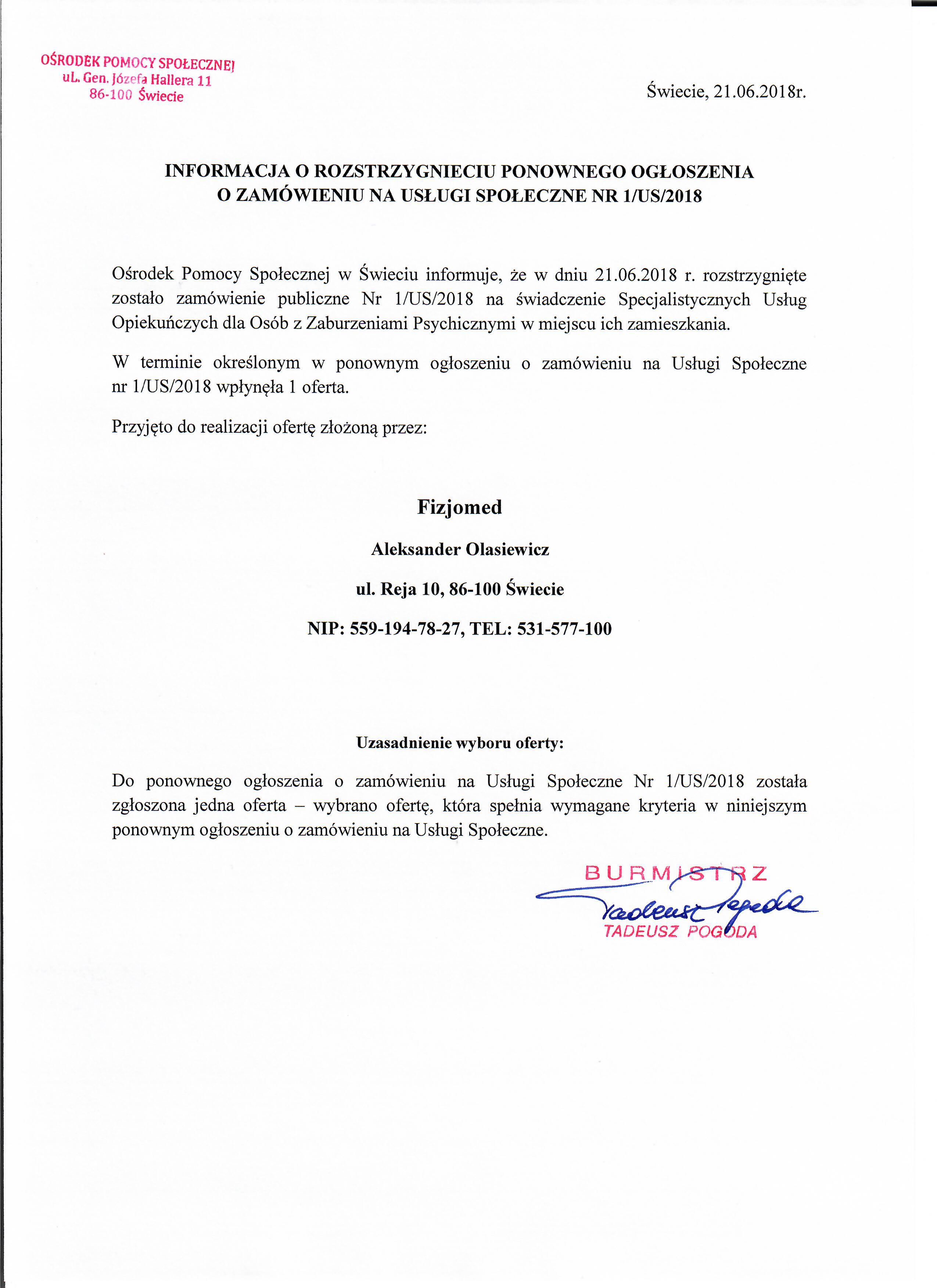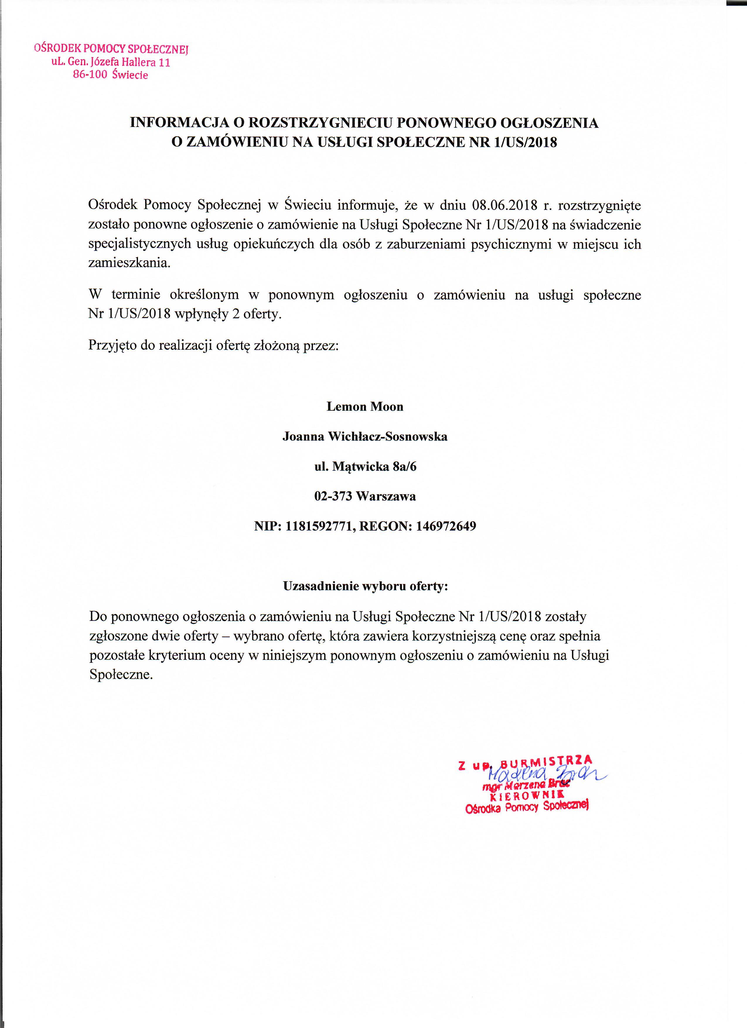 Świecie, 08.06.2018r. INFORMACJA O ROZSTRZYGNIĘCIU PONOWNEGO OGŁOSZENIA O ZAMÓWIENIU NA USŁUGI SPOŁECZNE NR 1/US/2018. NA ŚWIADCZENIE SPECJALISTYCZNYCH USŁUG OPIEKUŃCZYCH DLA OSÓB Z ZABURZENIAMI PSYCHICZNYMI.