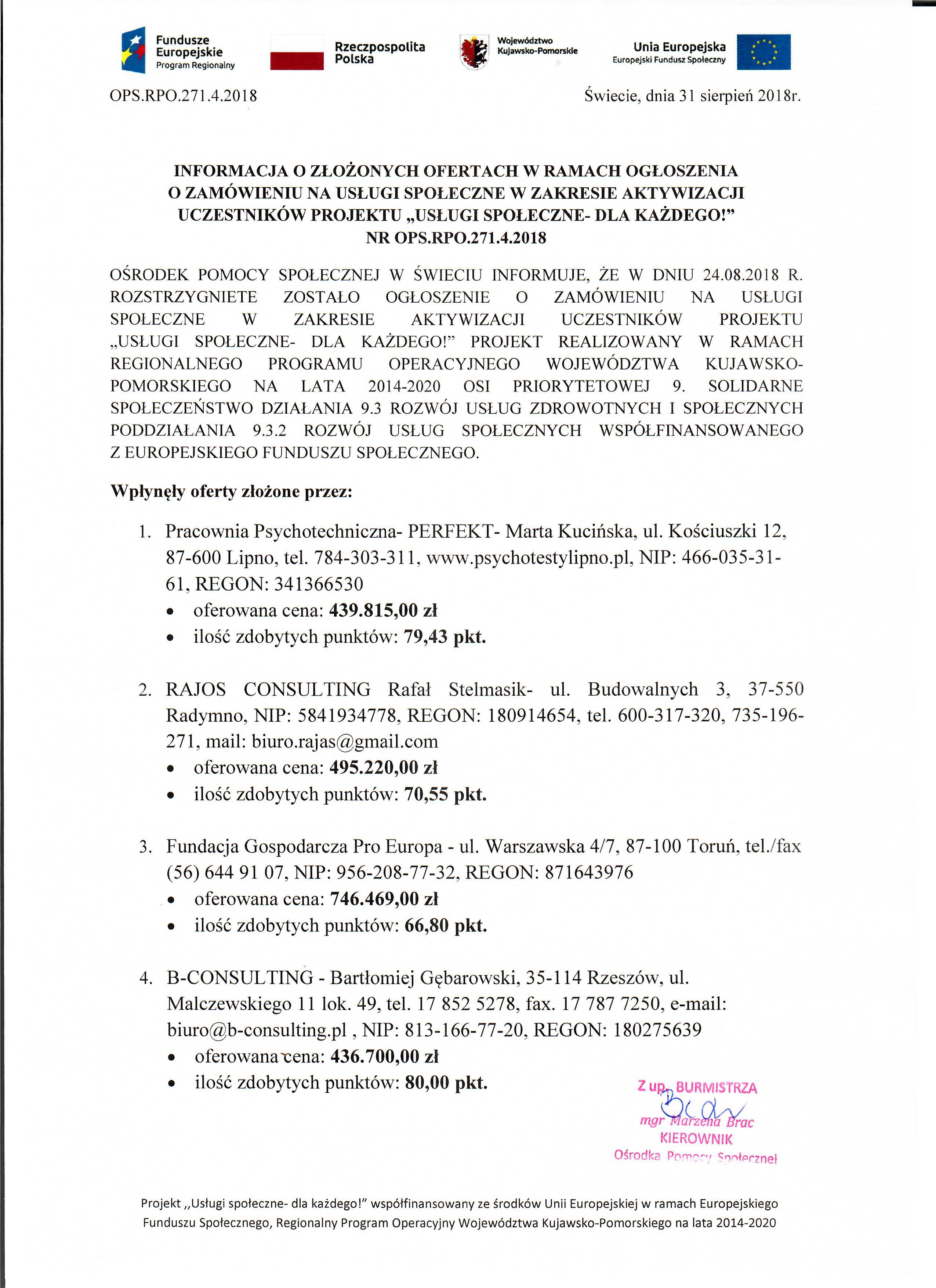 Świecie, 31.08.2018r. INFORMACJA O ZŁOŻONYCH OFERTACH W RAMACH OGŁOSZENIA O ZAMÓWIENIU NA USŁUGI SPOŁECZNE W ZAKRESIE AKTYWIZACJI UCZESTNIKÓW PROJEKTU „USŁUGI SPOŁECZNE- DLA KAŻDEGO!” NR OPS.RPO.271.4.2018