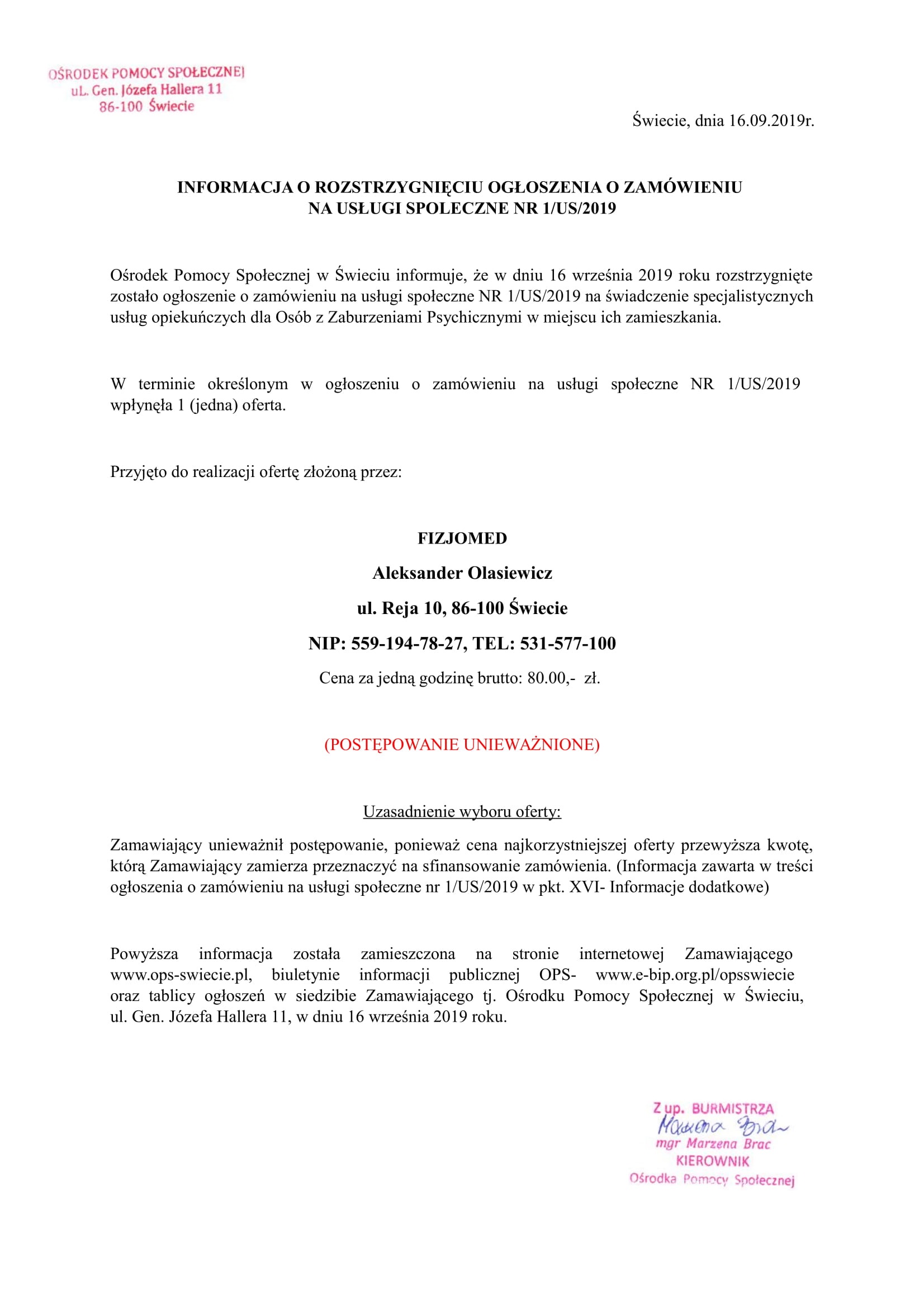Świecie, 01.10.2019r. INFORMACJA O ROZSTRZYGNIĘCIU OGŁOSZENIA O ZAMÓWIENIU NA USŁUGI SPOŁECZNE