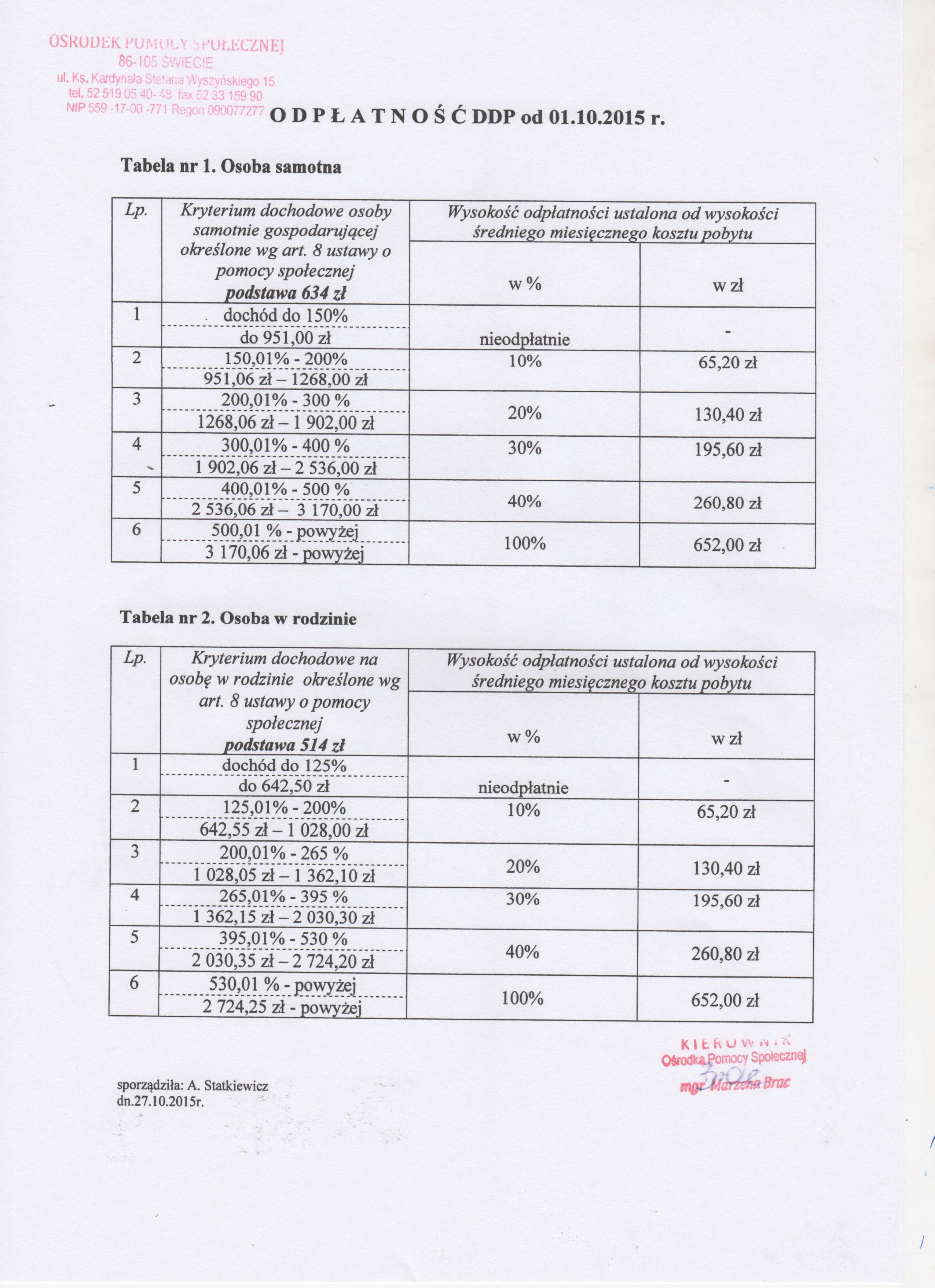 Tabela odpłatności za pobyt w Domu Dziennego Pobytu obowiązująca od 01.10.2015 roku.
