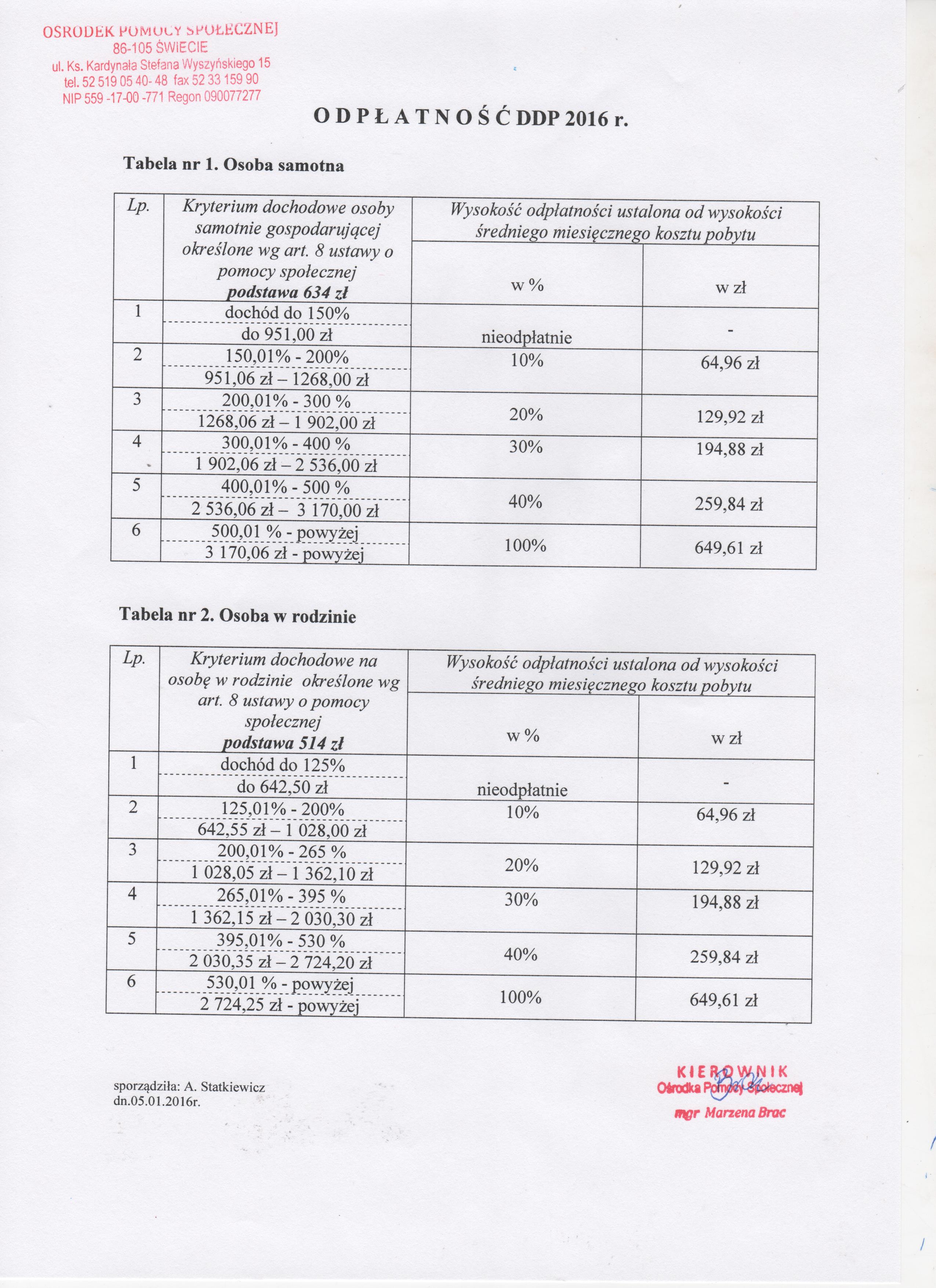 Tabela odpłatności za pobyt w Domu Dziennego Pobytu obowiązująca od 05.01.2016 roku.