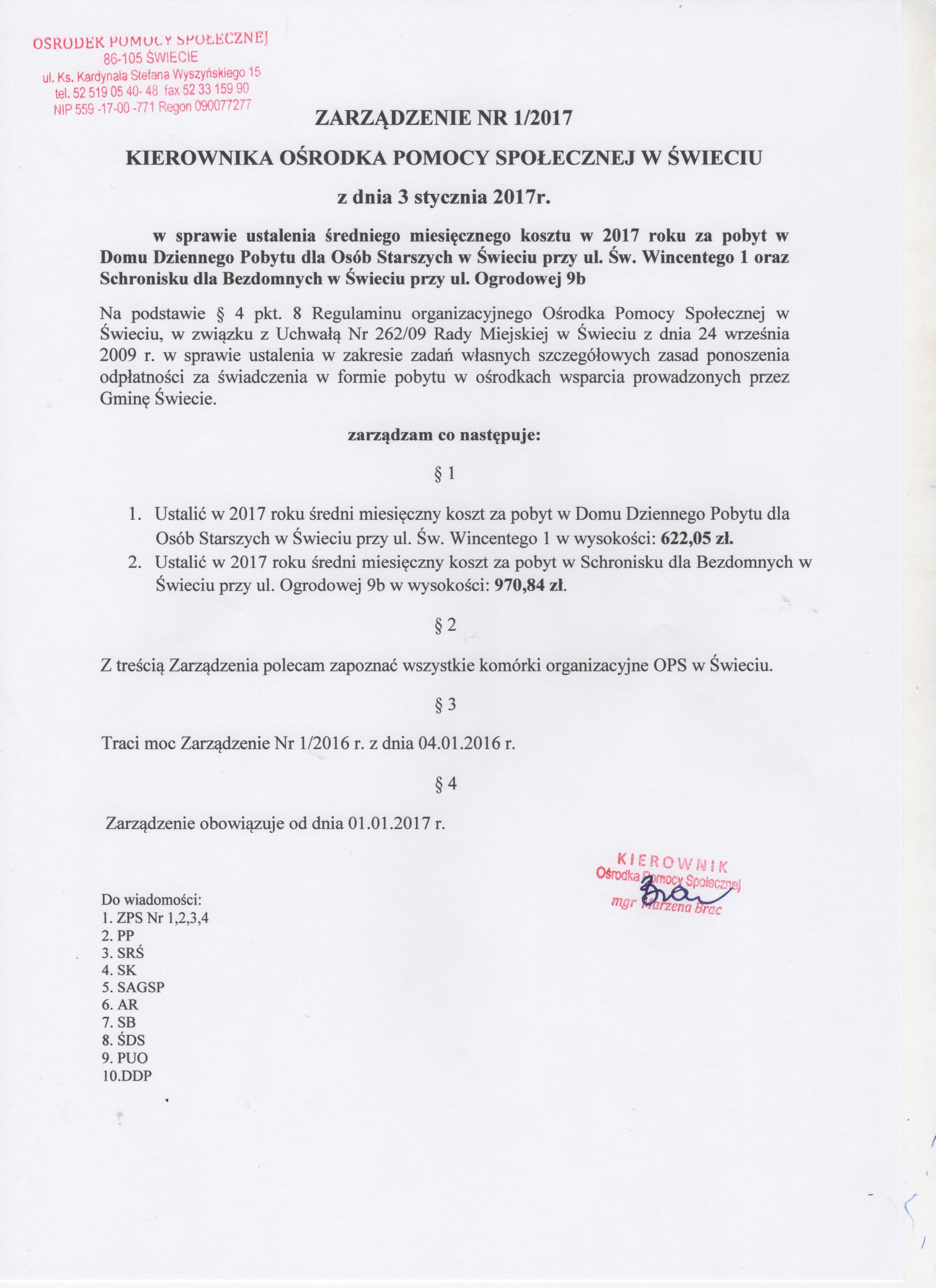 | Zarządzenie Kierownika Ośrodka Pomocy Społecznej w Świeciu z dnia 03 stycznia 2017 r. w sprawie ustalenia średniego miesięcznego kosztu w 2017 roku za pobyt w Domu Dziennego Pobytu dla Osób Starszych w Świeciu przy ul. Św. Wincentego 1 |
