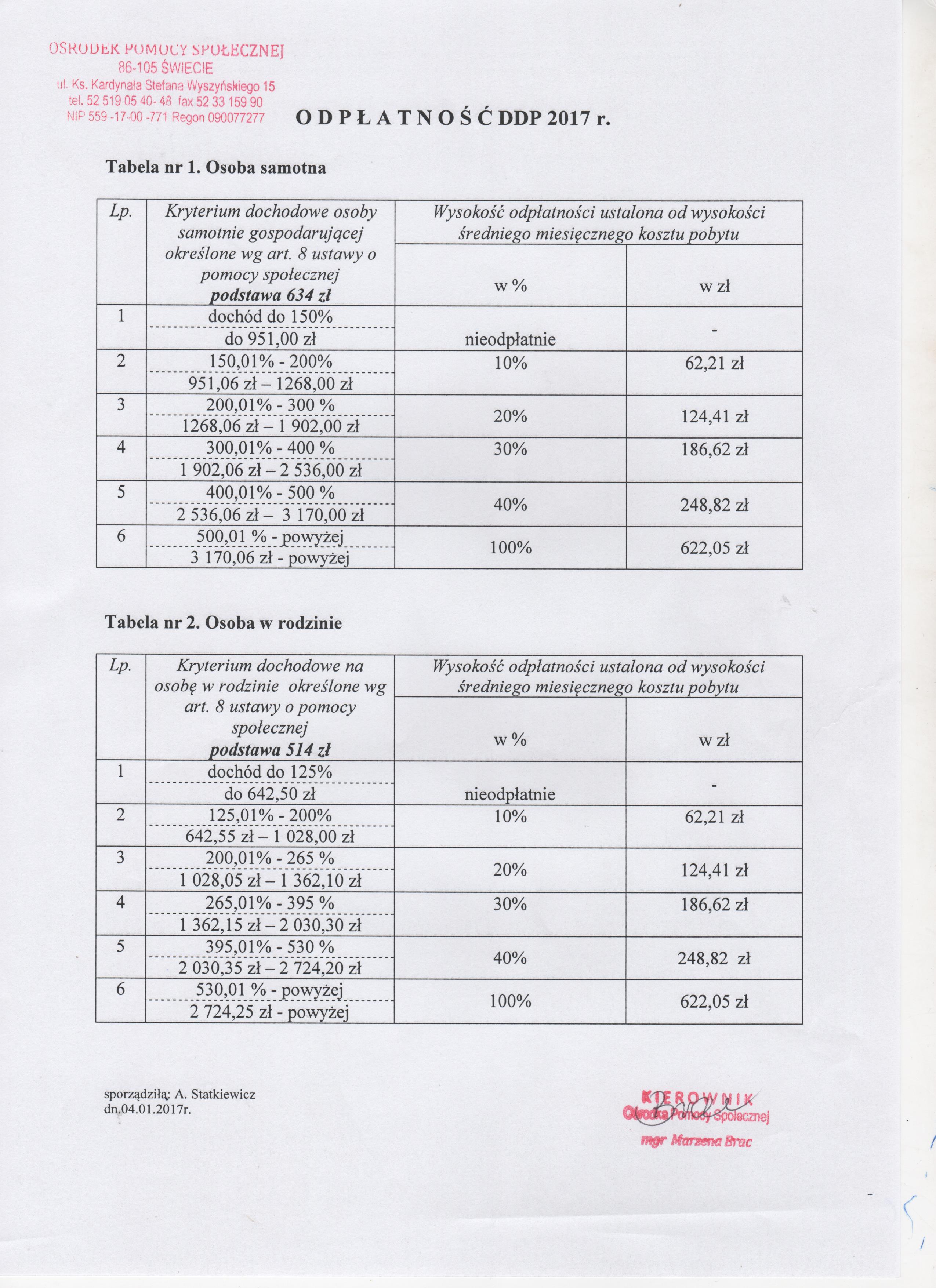 Tabela odpłatności za pobyt w Domu Dziennego Pobytu obowiązująca od 04.01.2017 roku.