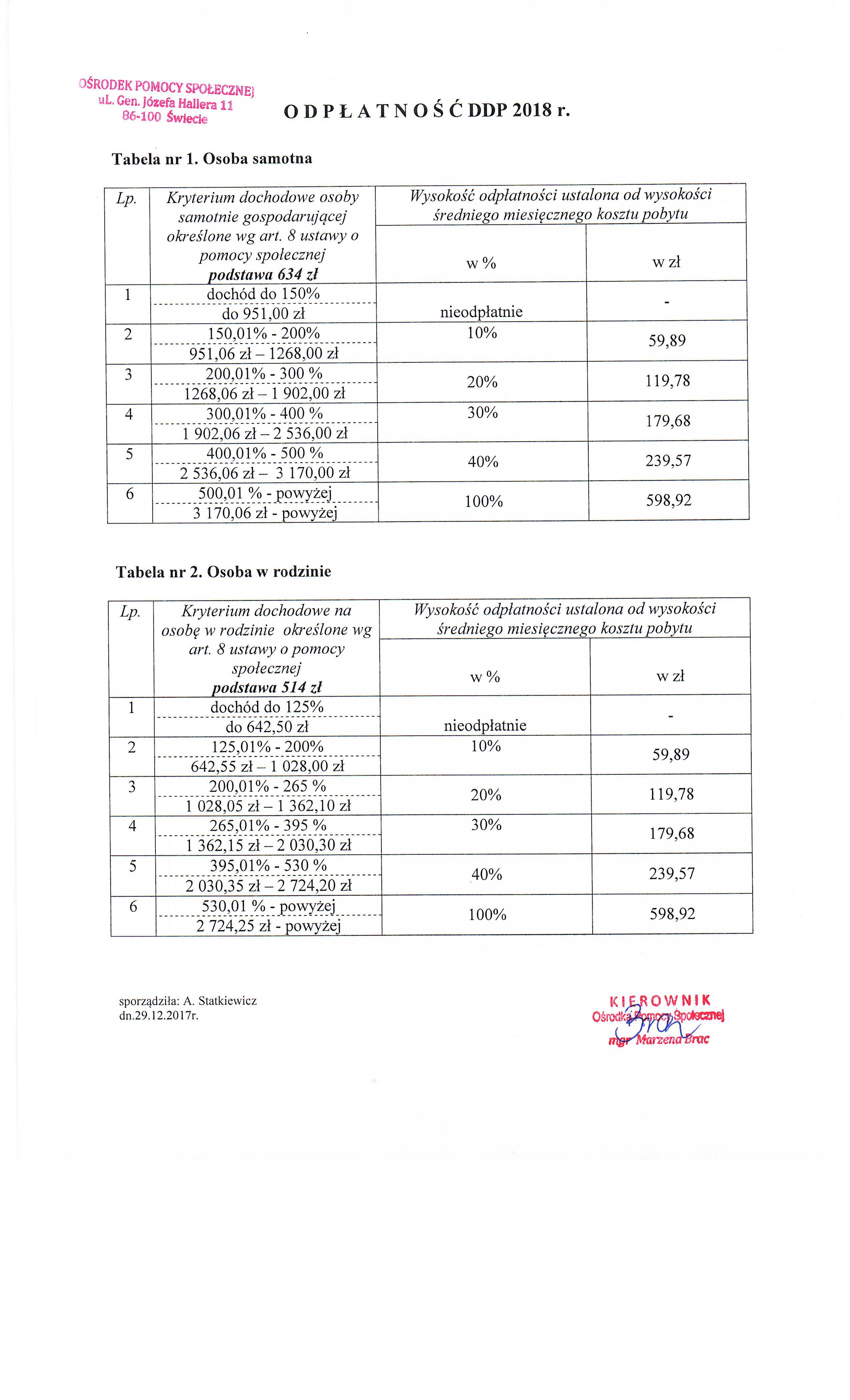 Tabela odpłatności za pobyt w Domu Dziennego Pobytu obowiązująca od 02.01.2018 roku.
